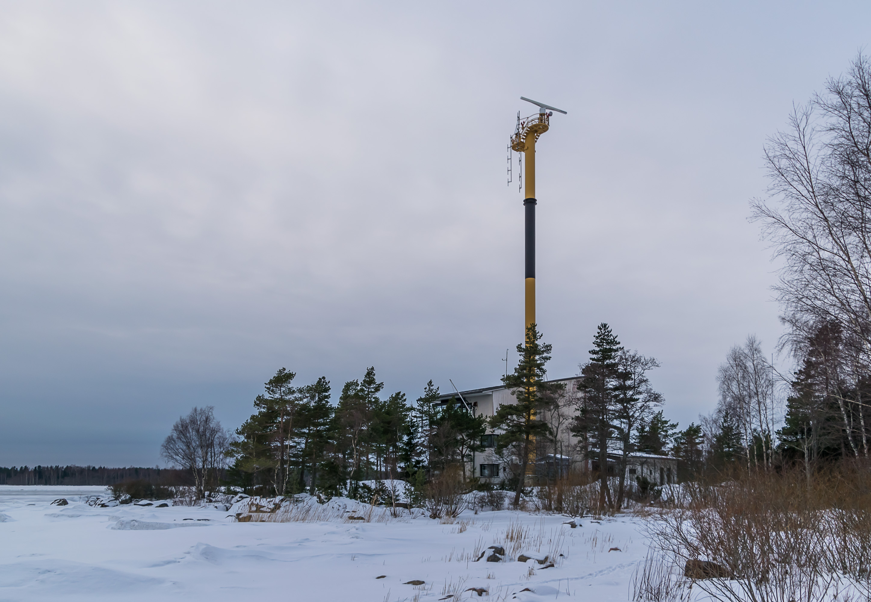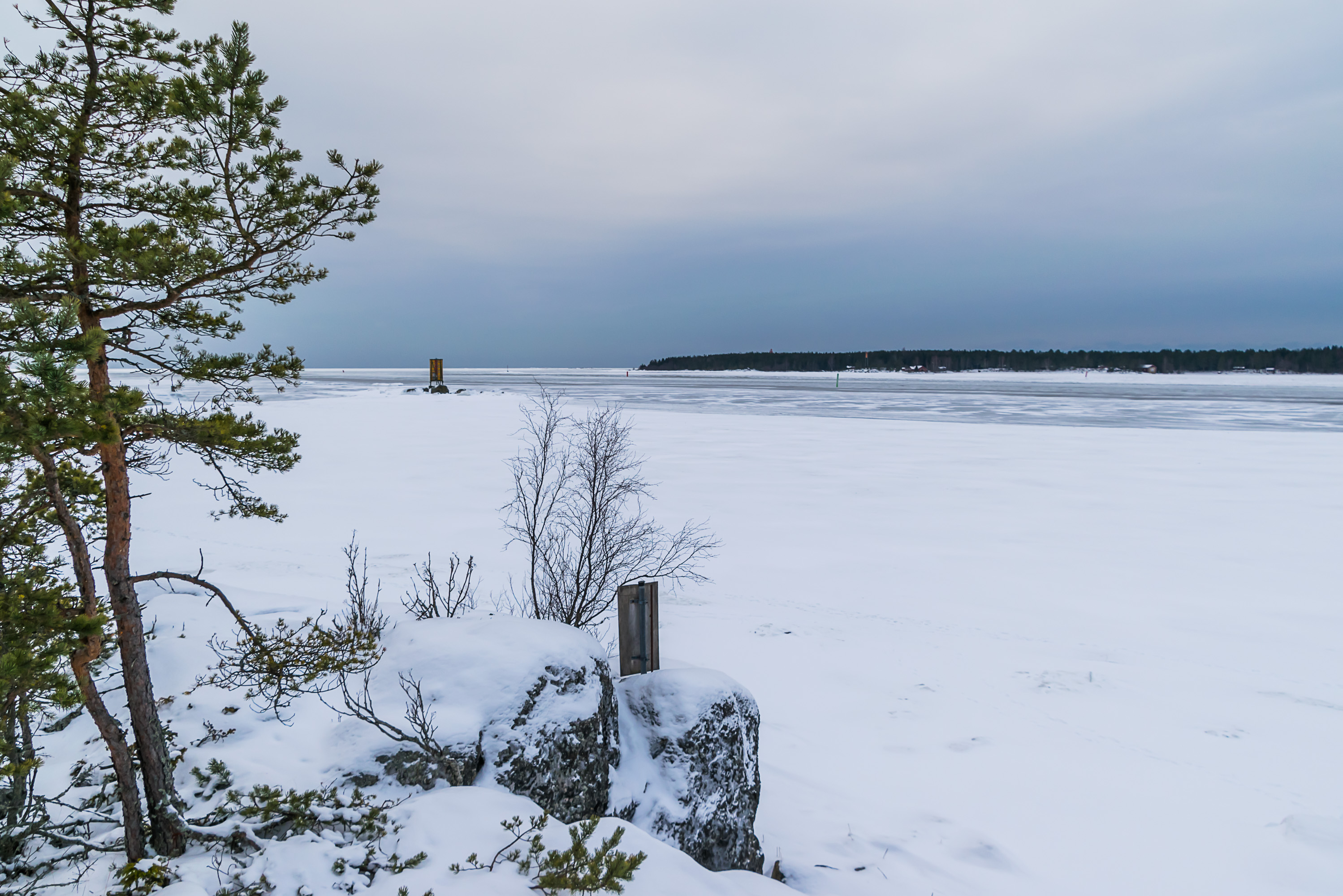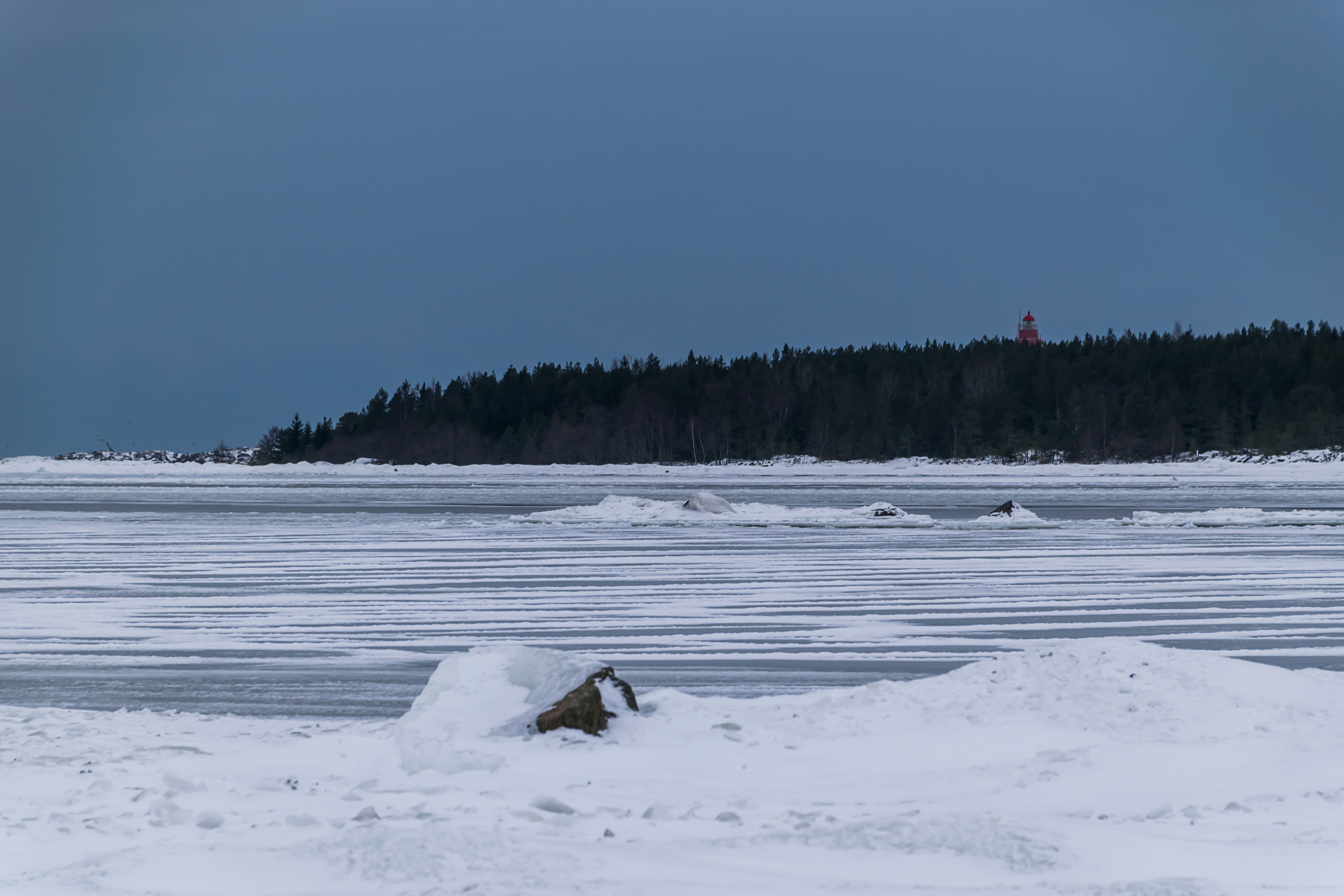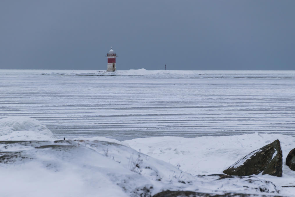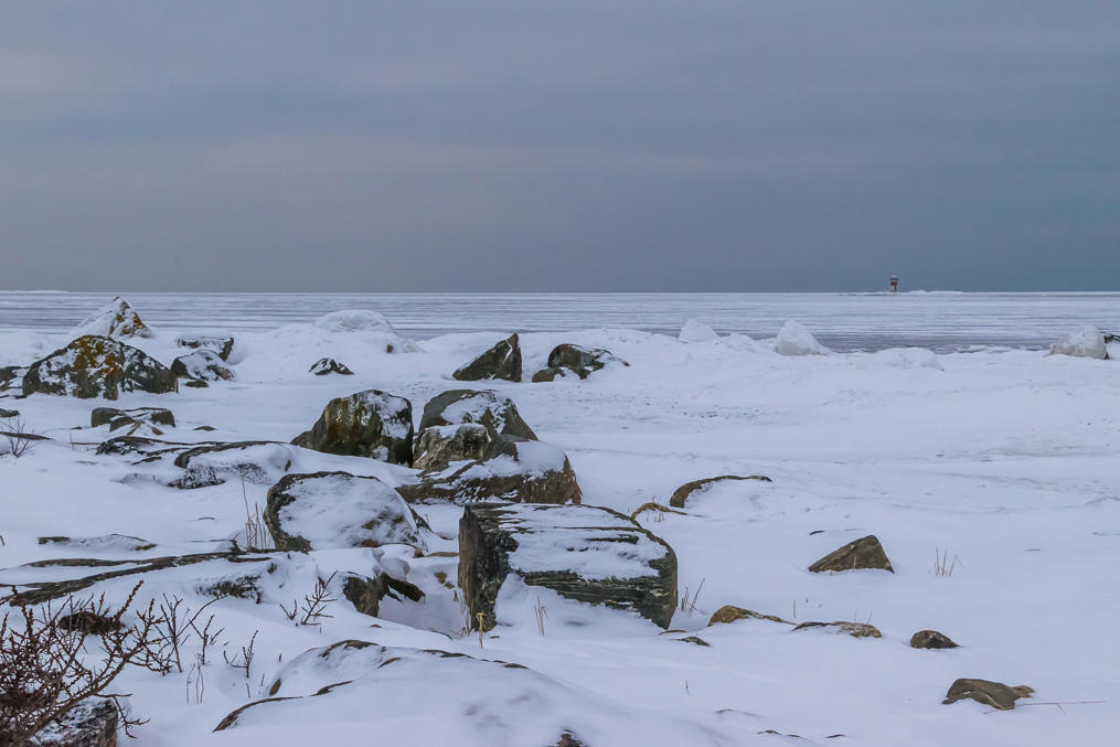 46. Море было подо льдом, в отличие от следующего на юг Кристинестада, куда тоже заезжал в тот же день. Хорошо виден маячок — секторный огонь — на островке Стура-Реммаргрунд (Stora Remmargrund), отмечающий начало короткого фарватера к порту Каскинена.