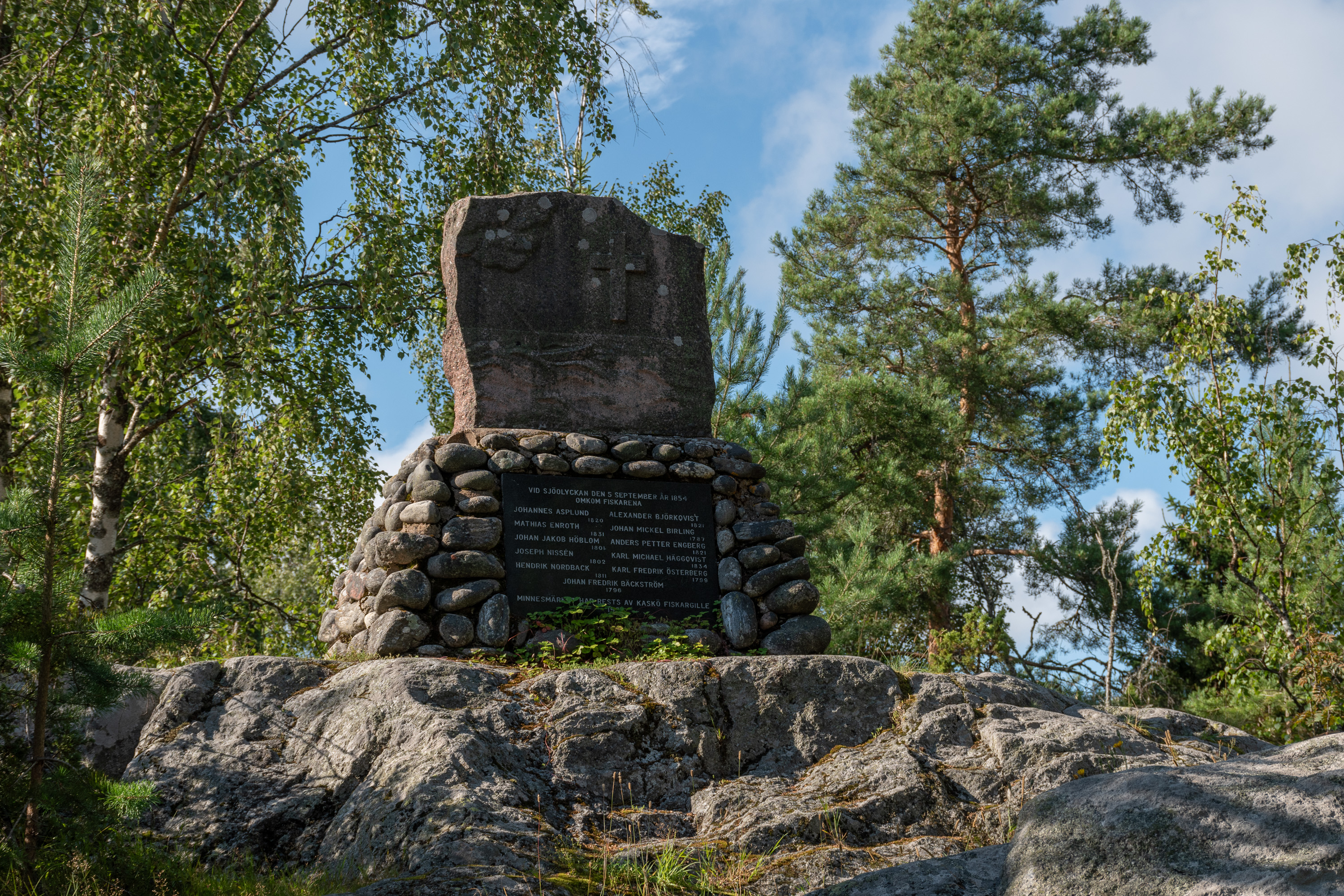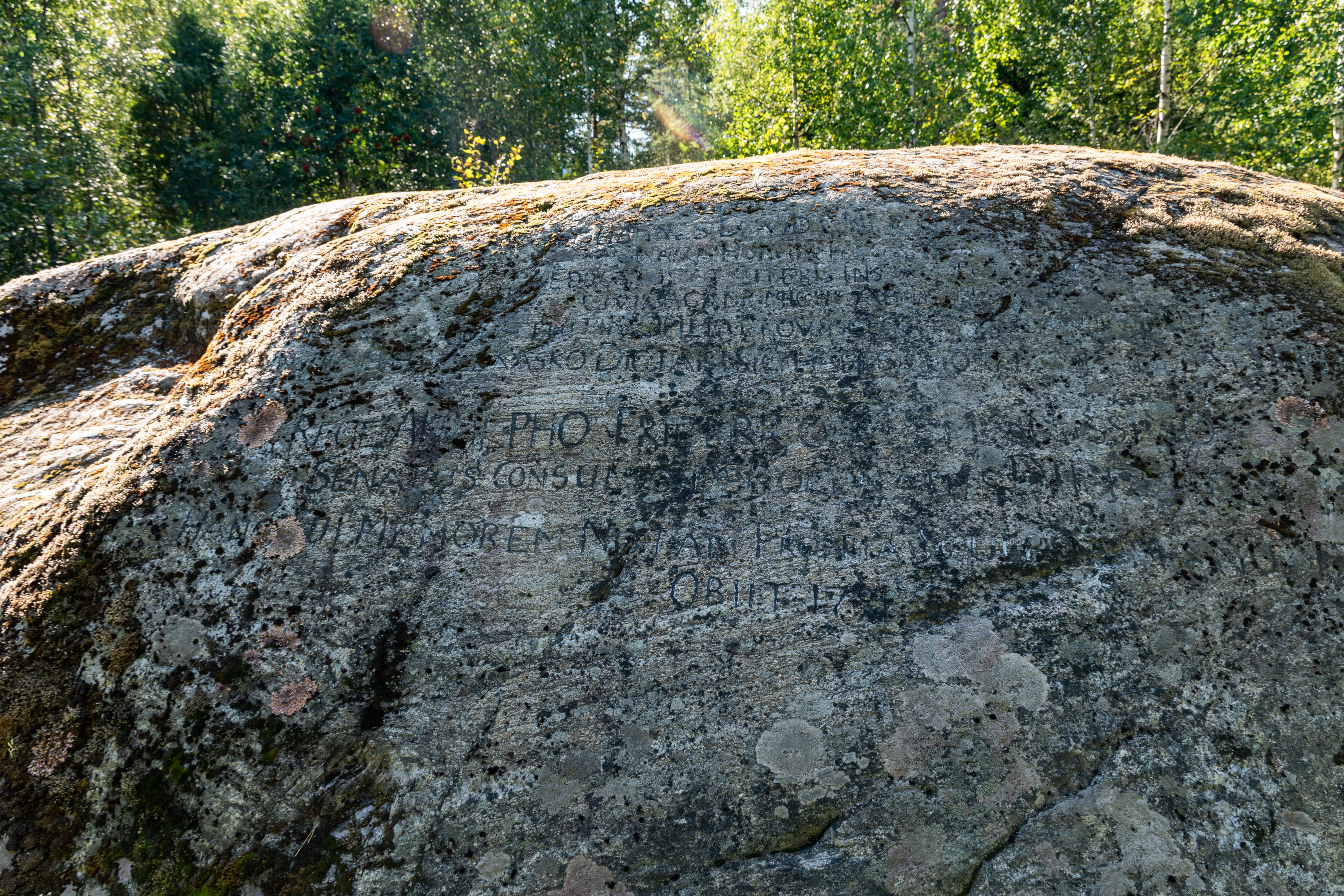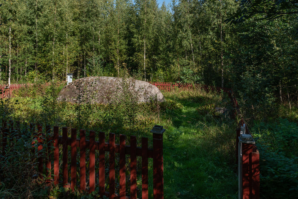 41. Легенда, правда, не соответствовала действительности — просто Кнейфф был, хоть и овчар, но не то что пастух какой-то, а на самом деле очень грамотный человек, сын ваасанского купца, в университете Турку учился и даже написал какой-то труд про пользу государственного регулирования экономики (а должность королевского овчара означала, что он помогал другим местным крестьянам с их овцеводством). Ну и и это послание свое написал на латыни, на которой местные не разумели, а вскоре камень и вовсе зарос мхом и лишайником, и лишь в 1860 наконец-то отчистили и нашелся грамотный человек (проповедник Ларс Вильгельм Шалин), который прочитал. А на самом деле это было всего лишь его короткое жизнеописание: "Юхан Давид Кнейфф. Родился в Стокгольме. Вырос, выучился в школе в Ваасе. Студент в Турку в 1740-1741. Назначен губернским овчаром в Остроботнию в 1743. Получил сей остров, Каскё именуемый, в хозяйство в 1745, во времена всемилостивейшего короля Адольфа-Фредерика. Властями назначен директором в 1757. Своими руками выбил эту надпись в 1785." Отдельно чьей-то другой рукой выбит также год его смерти, 1791.