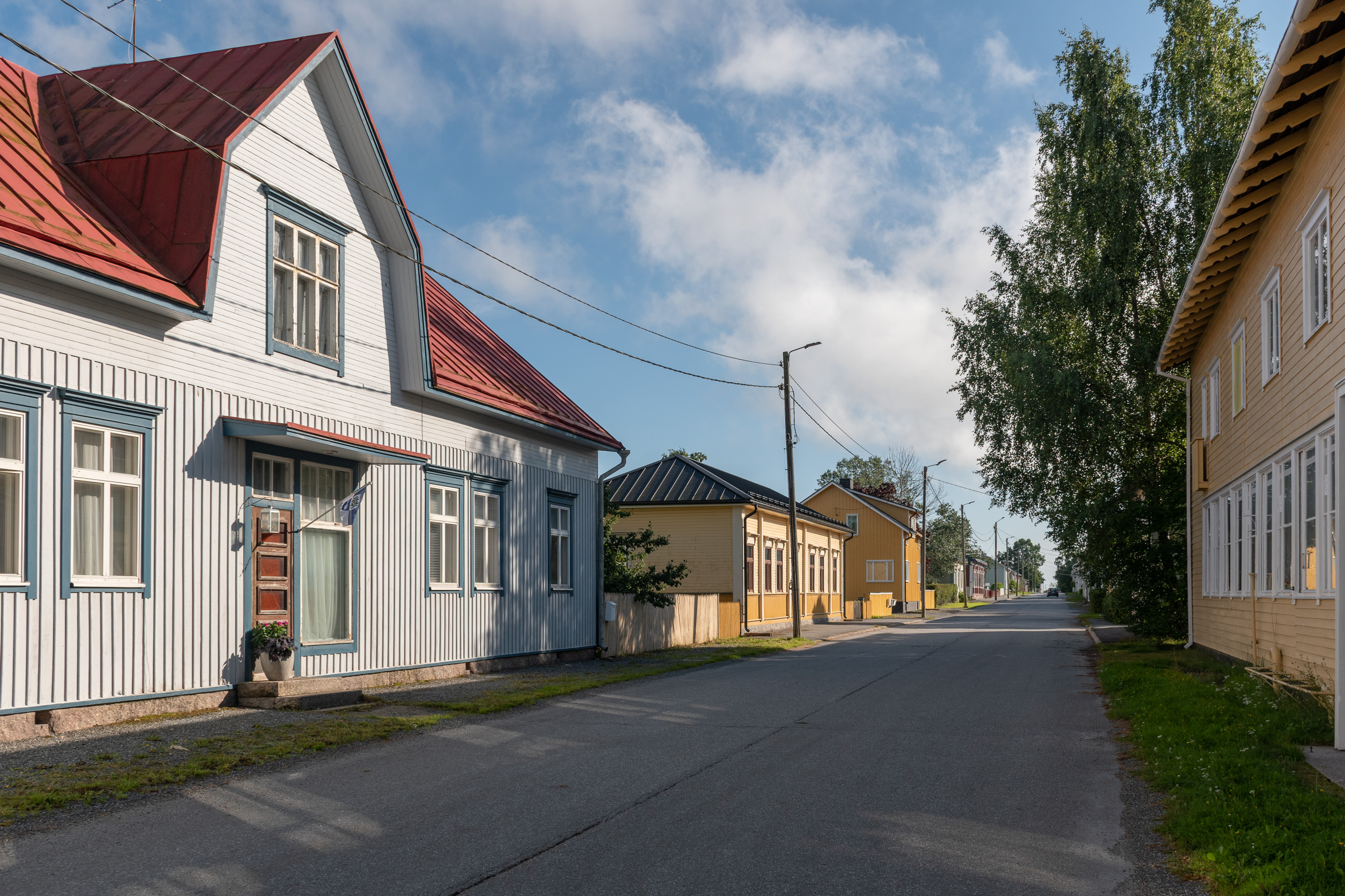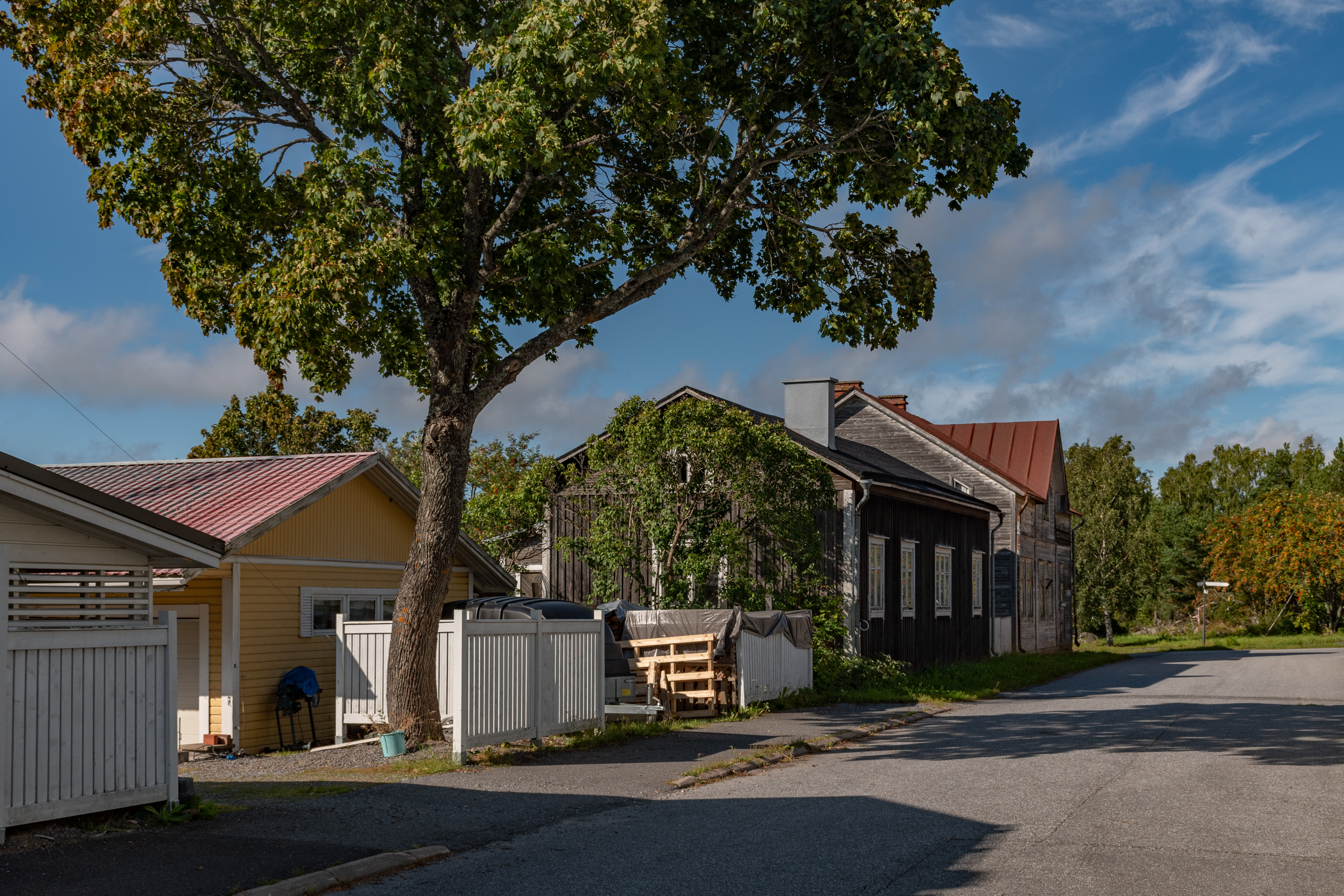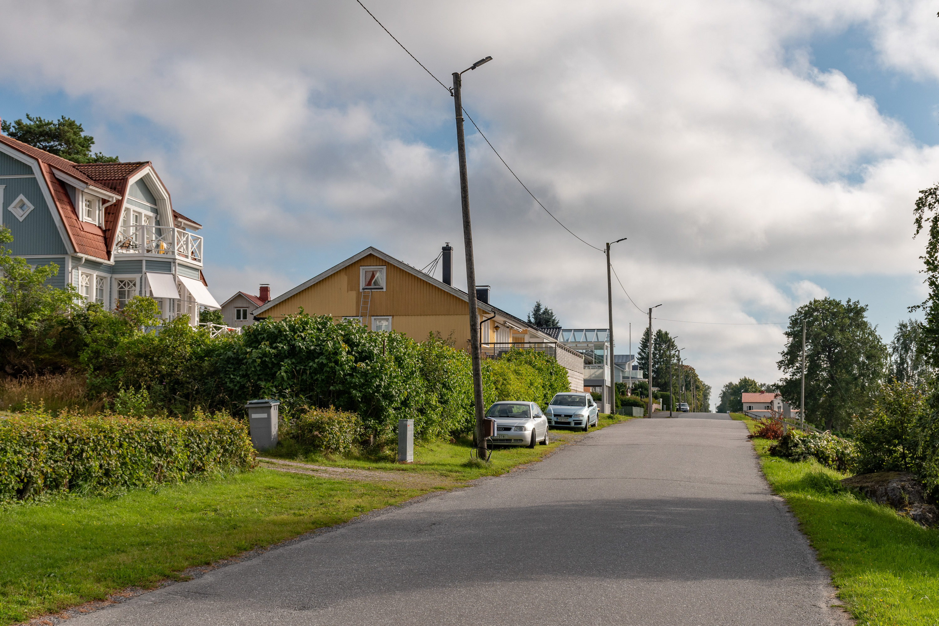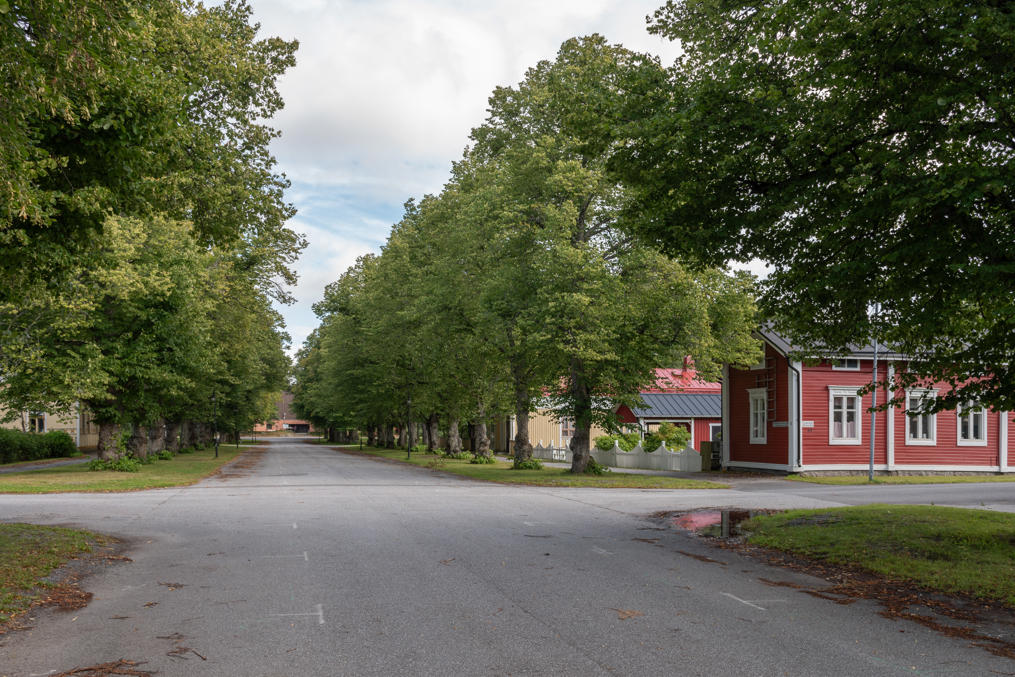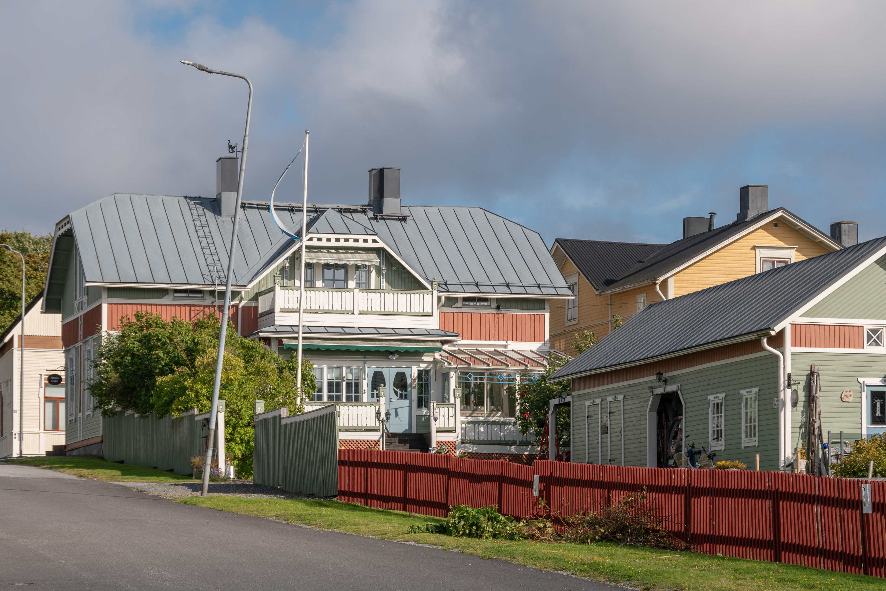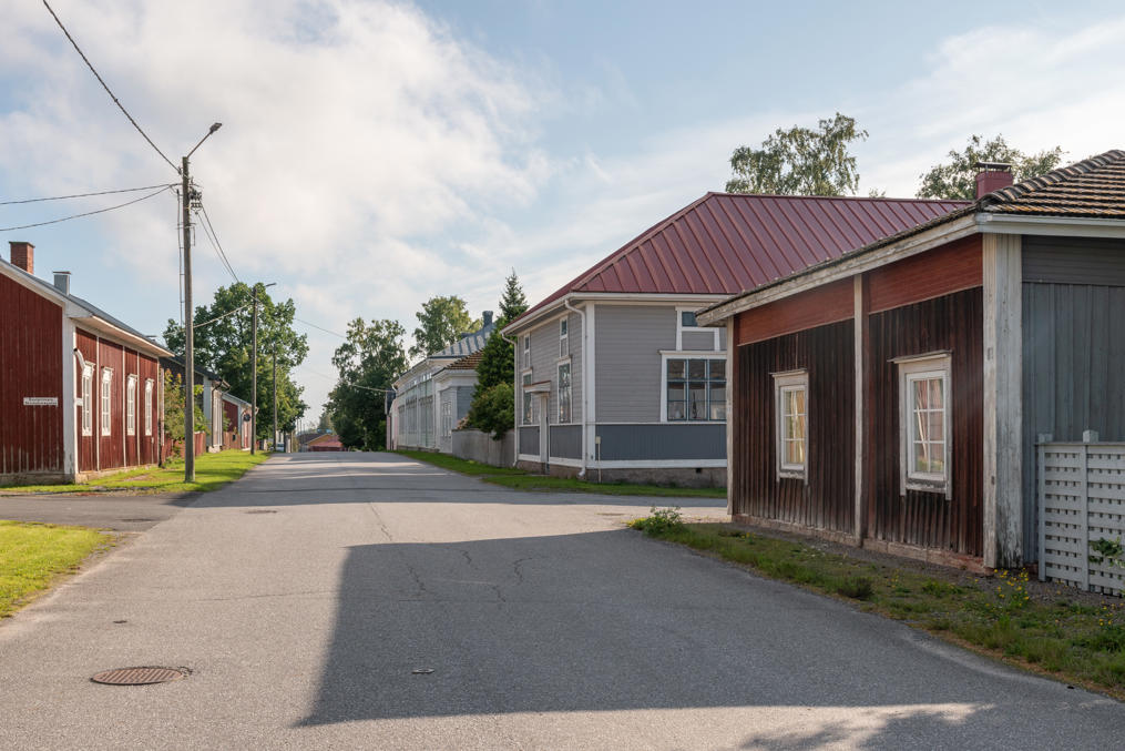9. И, как я уже говорил, Каскинен от других деревянных городов и районов Финляндии, коих в общем-то немало, отличает простор — фасады домов не идут почти сплошным рядом, как обычно, дома окружают достаточно приличных размеров дворы, зелень и деревья кругом — даже застроенные кварталы застроены весьма неплотно. Да и улицы довольно широкие. И все равно, хоть остров Каскинен и не особо велик, город как таковой занимает лишь его северную/северо-западную часть. За леском на заднем плане в середине виден завод BCTMP, левее закрытый с 2009 целлюлозный комбинат, справа ближе к оконечности острова морской грузовой порт.