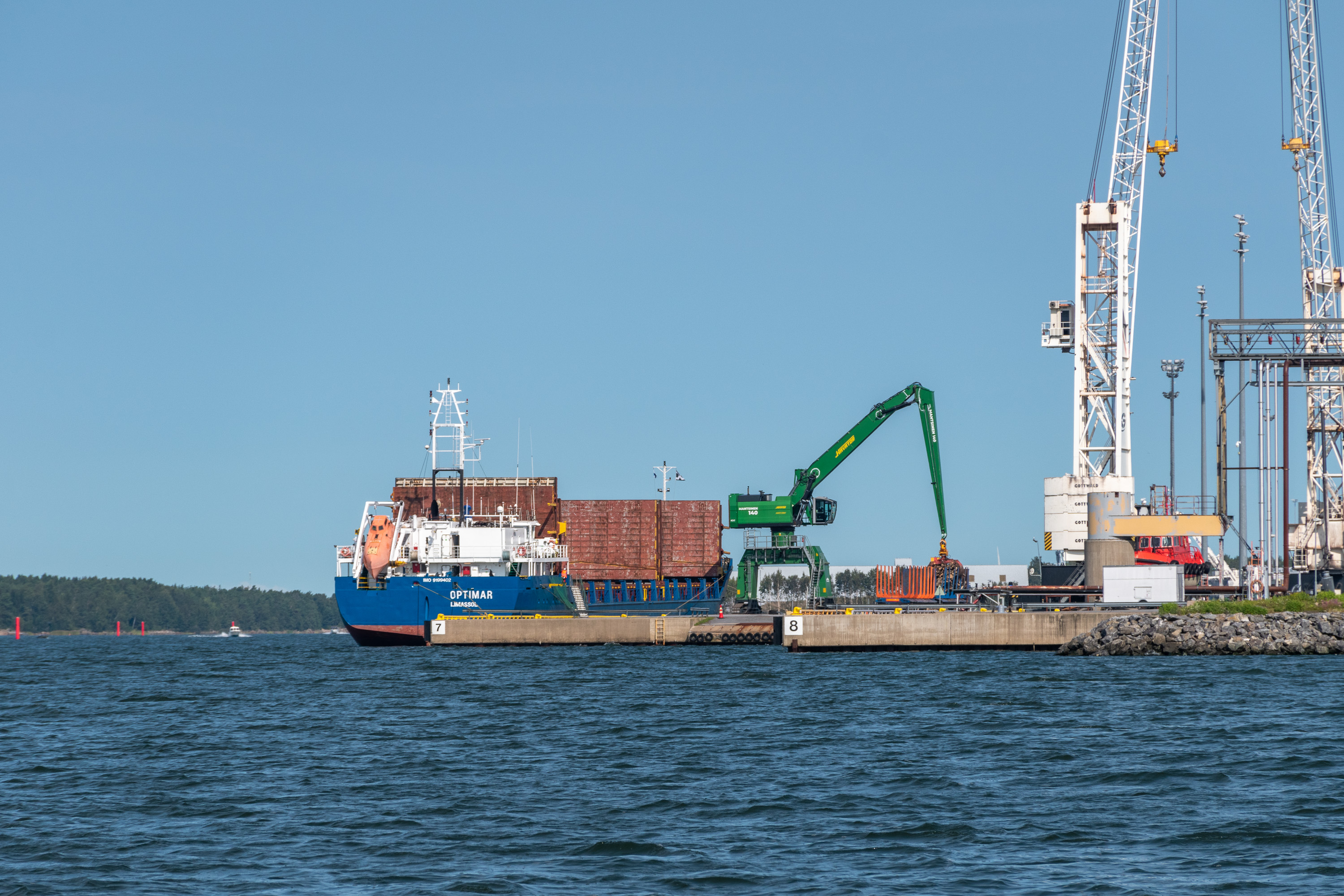 42. Ну а к югу от собственно города начинается грузовой порт. Этот сухогруз "Оптимар", видимо, регулярно возит сюда лес из стран Балтии — как раз на днях была новость, что он, везя лес из эстонского порта Роомасcааре (под городом Куреcсааре на острове Сааремаа), попал в шторм и под Каскиненом 30 кубометров леса растерял, но все-таки благополучно дошел до порта. На втором фото видны лежащие на территории порта части ветровых электростанций — традиционное зрелище в портах Ботнического побережья.