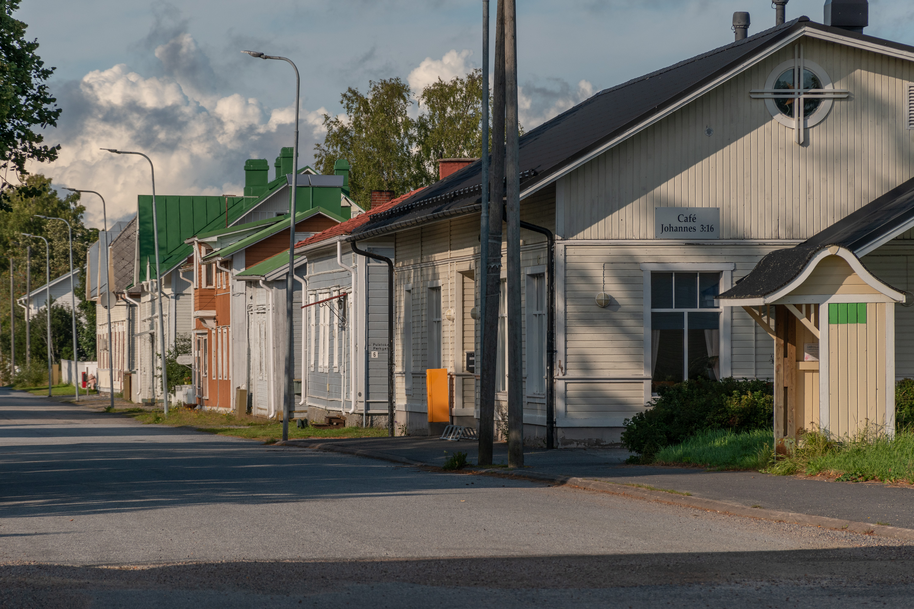 7. Справа одинокая автобусная остановка. С общественным транспортом тут, конечно, не очень, есть одна ежедневная пара автобусов в Ваасу (через Нерпес и ряд других шведоязычных сел) и все. За остановкой в доме приходского собрания кафе, не знаю, работающее ли еще, под названием "Иоанн 3:16" — этот стих Библии гласит: "Ибо так возлюбил Бог мир, что отдал Сына Своего Единородного, дабы всякий верующий в Него не погиб, но имел жизнь." По-фински этот стих зовется "малым Евангелием" (pienoisevankeliumi) — в лютеранстве считается, что все послание всей Библии можно свести к этому стиху.