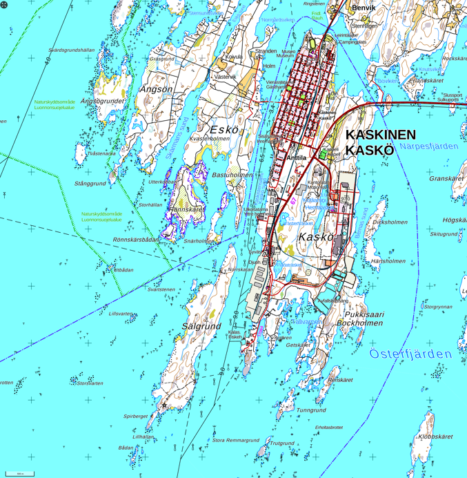 18. Остров Эскё сросся с парой других островов, и по площади они все вместе сравнимы с островом, на котором размещается сам Каскинен. Я не пробовал туда ездить — судя по карте, там особо ничего нет, кроме десятка хуторов и кучи дач. Административно острова относятся не к Каскинену, а к соседнему Нерпесу — это несмотря на то, что попасть на острова на машине из остального Нерпеса можно, лишь проехав через Каскинен.