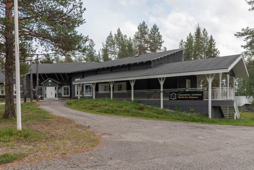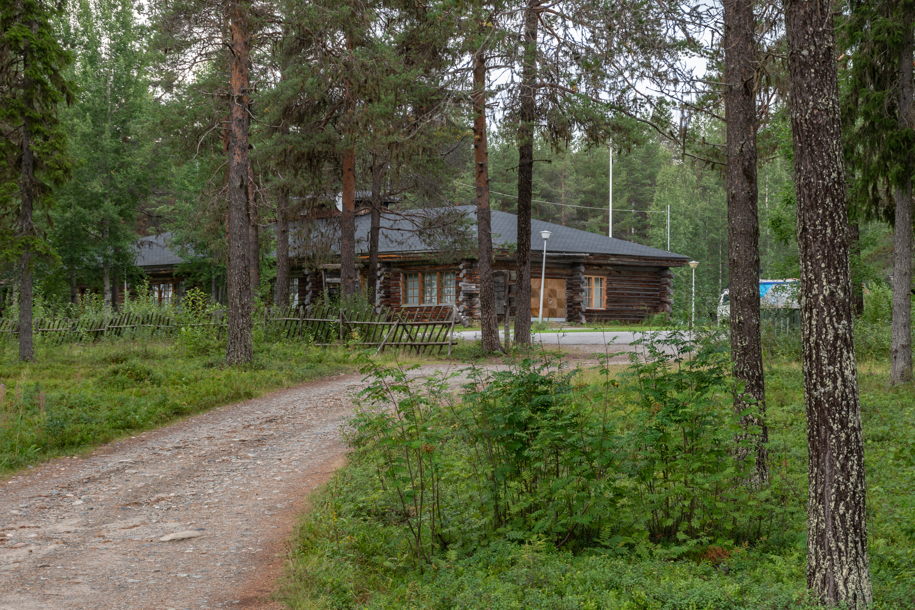 2. Визит-центр Лесного управления, однако, до сих пор тут вроде бы действует, встречает на подъезде к поселку. Над входом виден логотип национального парка им. Урхо Кекконена, с беркутом над тундрами.