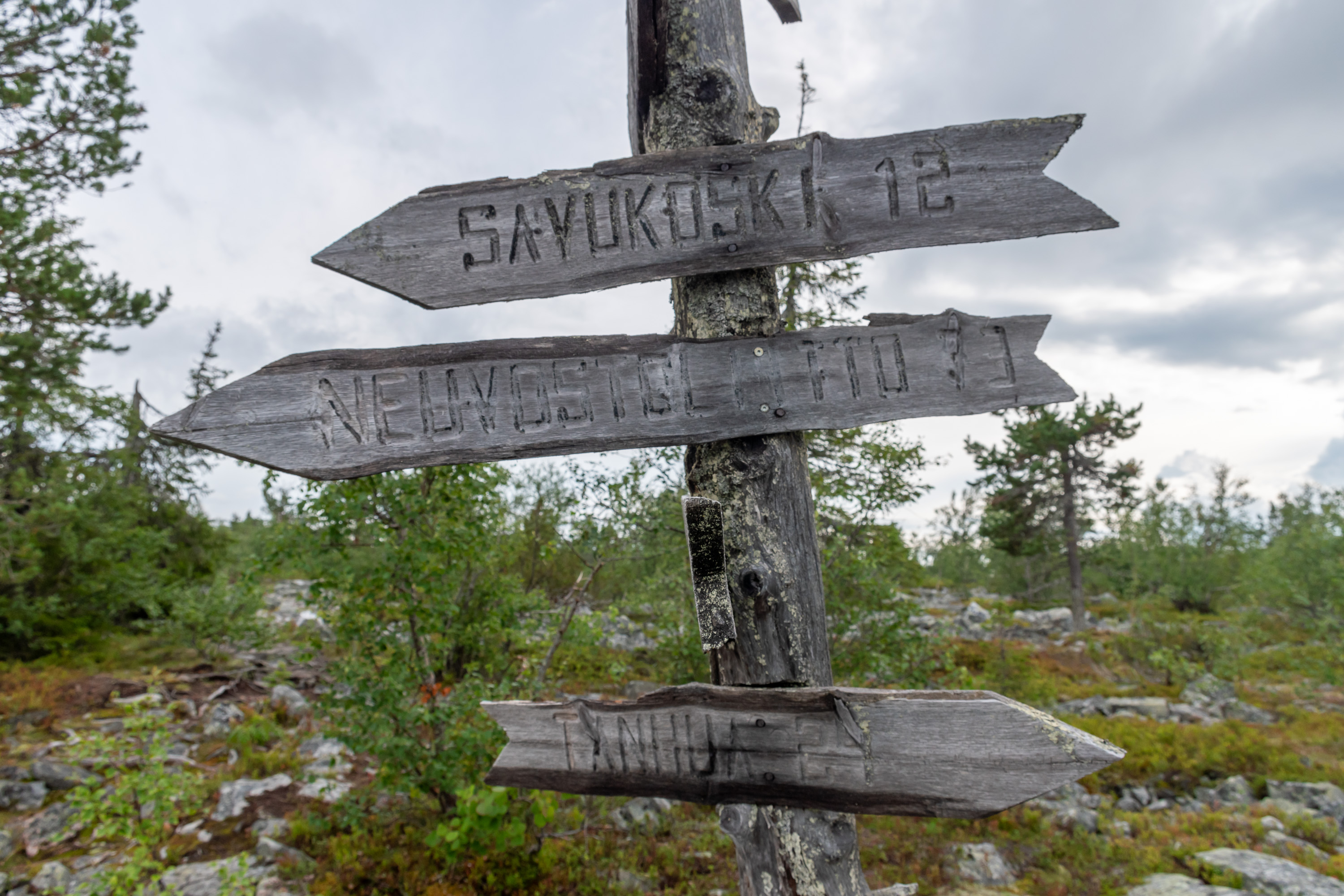 22. Старый указатель направлений. Отмечены Савукоски, Хельсинки, Корватунтури, лыжный курорт Саариселькя, пара местных деревень типа Танхуа — и Советский Союз (Neuvostoliitto) — 73 км до него, если верить указателю, хотя на самом деле по карте до российской границы в ближайшей точке на десяток километров поменьше, я измерил.