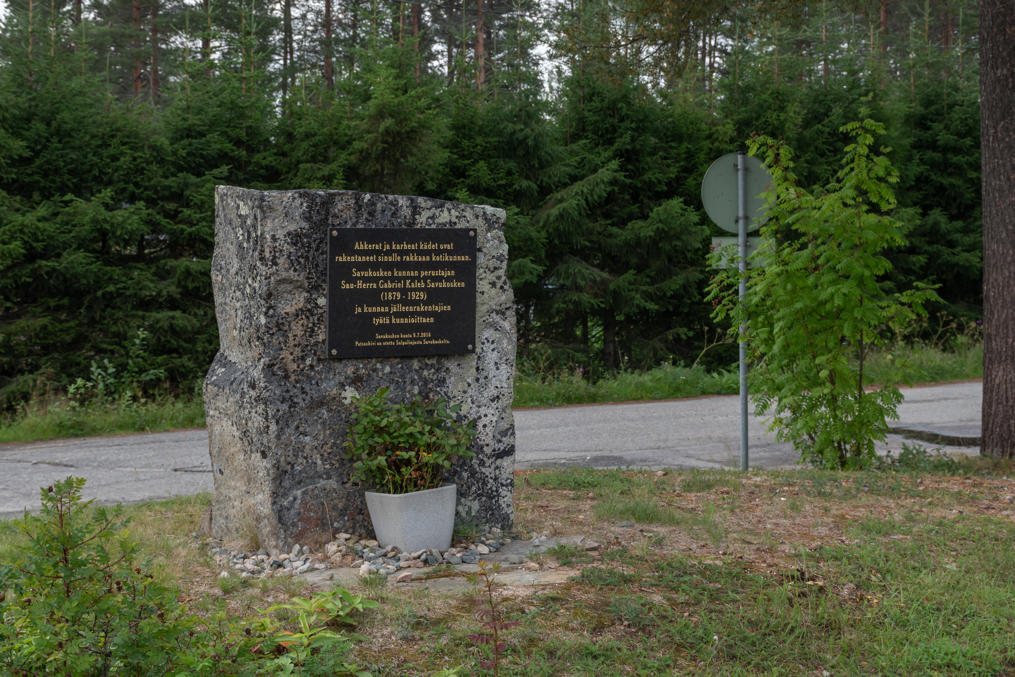 6. "Трудолюбивые и грубые руки построили вам дорогой родной поселок. Посвящается основателю муниципалитета Савукоски "господину Сау" Габриэлю Калебу Савукоски и труду реконструкции муниципалитета." "Господин Сау" (Sau-Herra) Габриэль Калеб Савукоски (Gabriel Kaleb Savukoski, 1879-1929), из рода местных зажиточных крестьян и купцов, но образованный, учившийся в Хельсинки, действительно, в свое время был самым богатым и влиятельным человеком из местных. Именно по его инициативе в 1916 году Савукоски и соседний, почти такой же маленький, но не настолько на отшибе Пелкосенниеми отделились от старой лапландской волости Соданкюля. Ну и имя свое новому муниципалитету он, по-видимому, и оставил. В числе прочего "господин Сау" на свои деньги отстроил первую дорогу в Савукоски, ту, что на фото выше. В Первую Мировую он помогал пленным немцам и австрийцам, бежавшим из России со стройки Мурманской ж/д, за что в конце концов загремел в тюрьму на Шпалерную в Питер, но освободился в Февральскую революцию. Школу местную основал, отделение шюцкора, а в 1922 в тот Сальный мятеж был одним из тех, кого экспедиция Мойланена слегка пограбила.