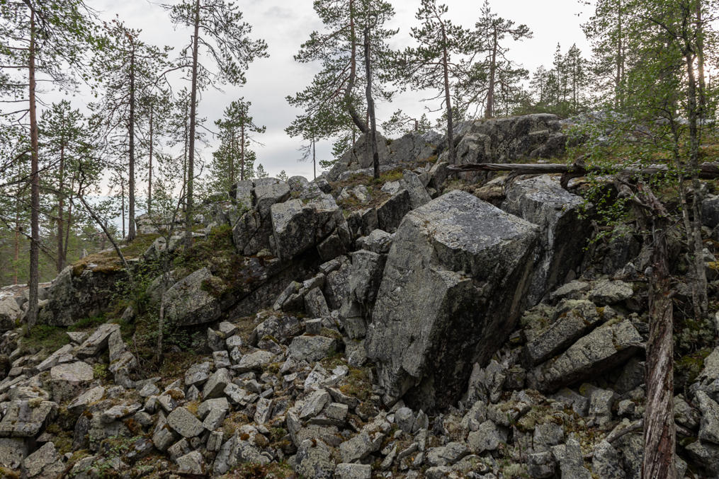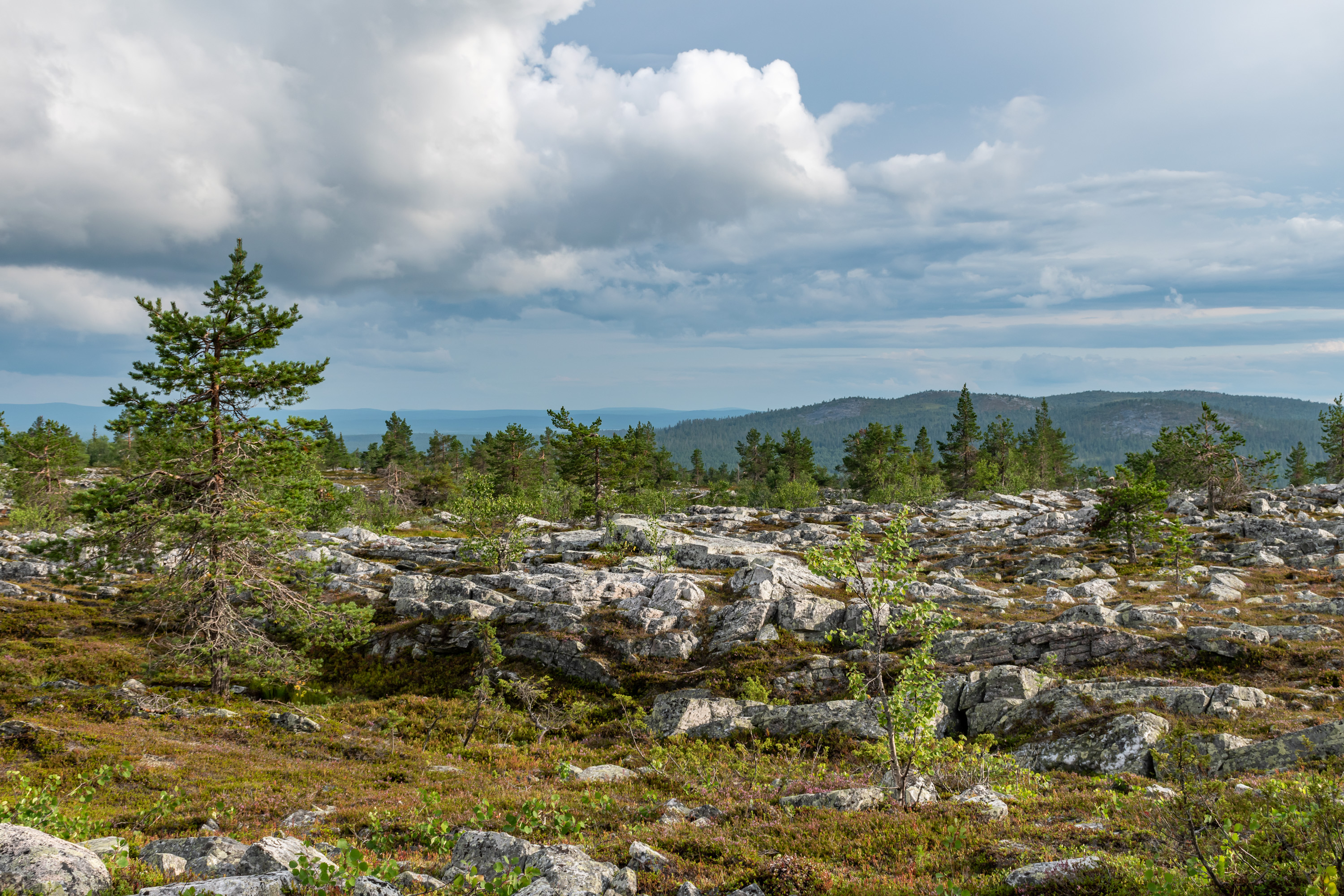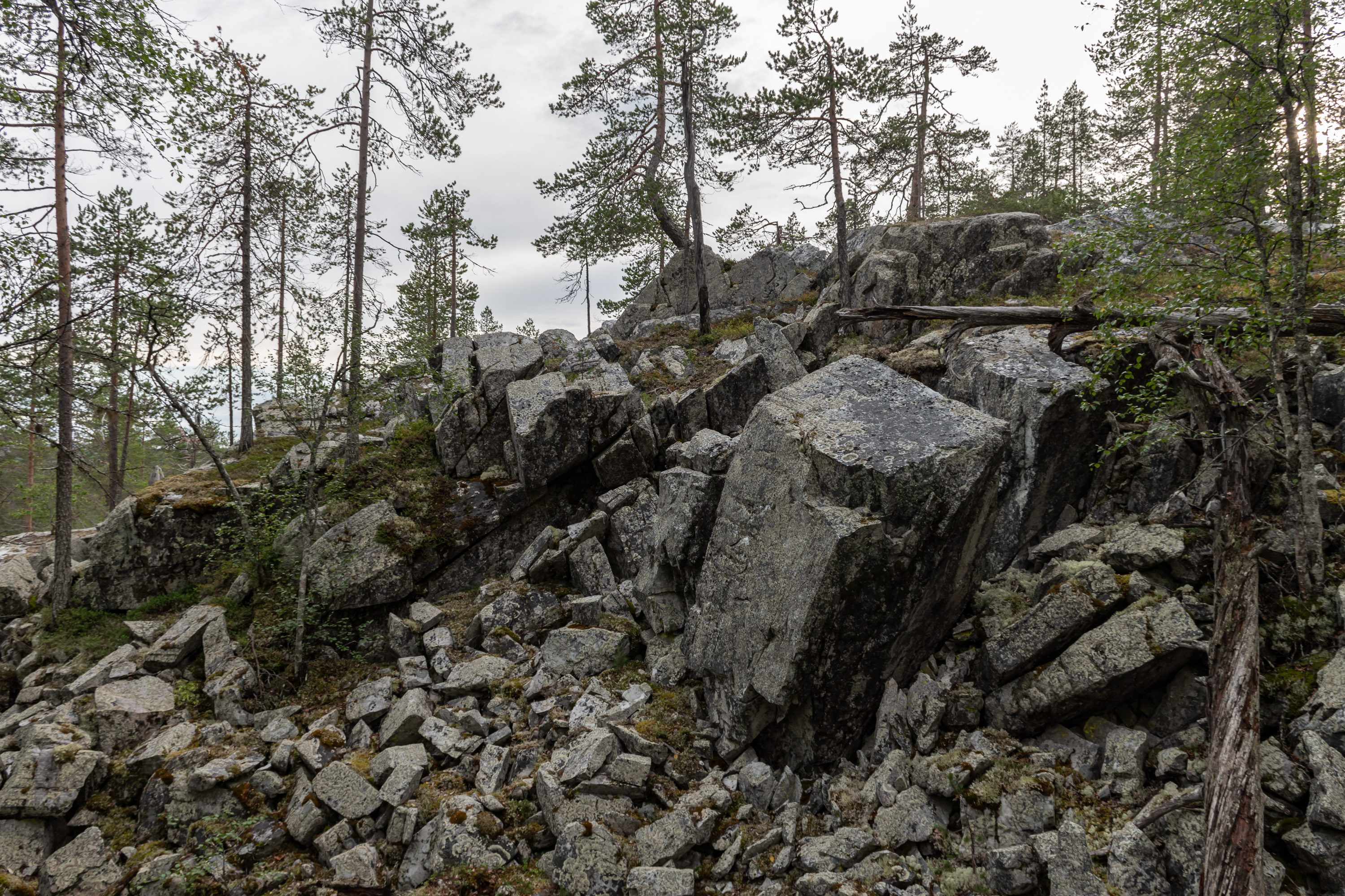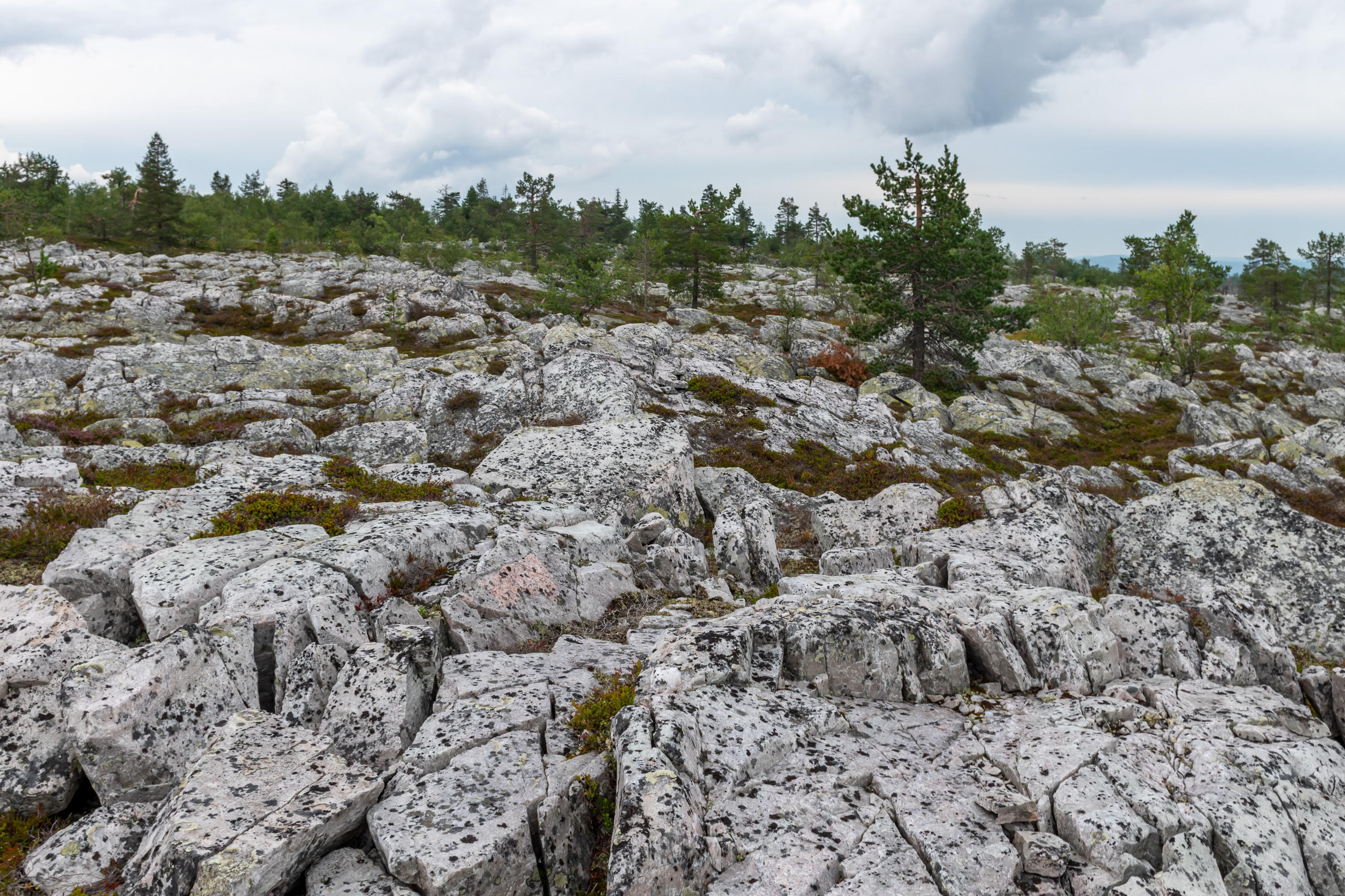 23. Гора испещрена маленькими каменными россыпями и гребнями бело-серых скал, вполне оправдывая название "Каменная тундра". Ну, точнее, наполовину; "тундра"/"тунтури" (tunturi) обычно подразумевает, что на верхушке деревьев не растет, но эта гора все-таки недостаточно высокая, чтобы быть полностью лысой. (Для сравнения, например, см. Аакенус в национальном парке Паллас-Юллястунтури.)