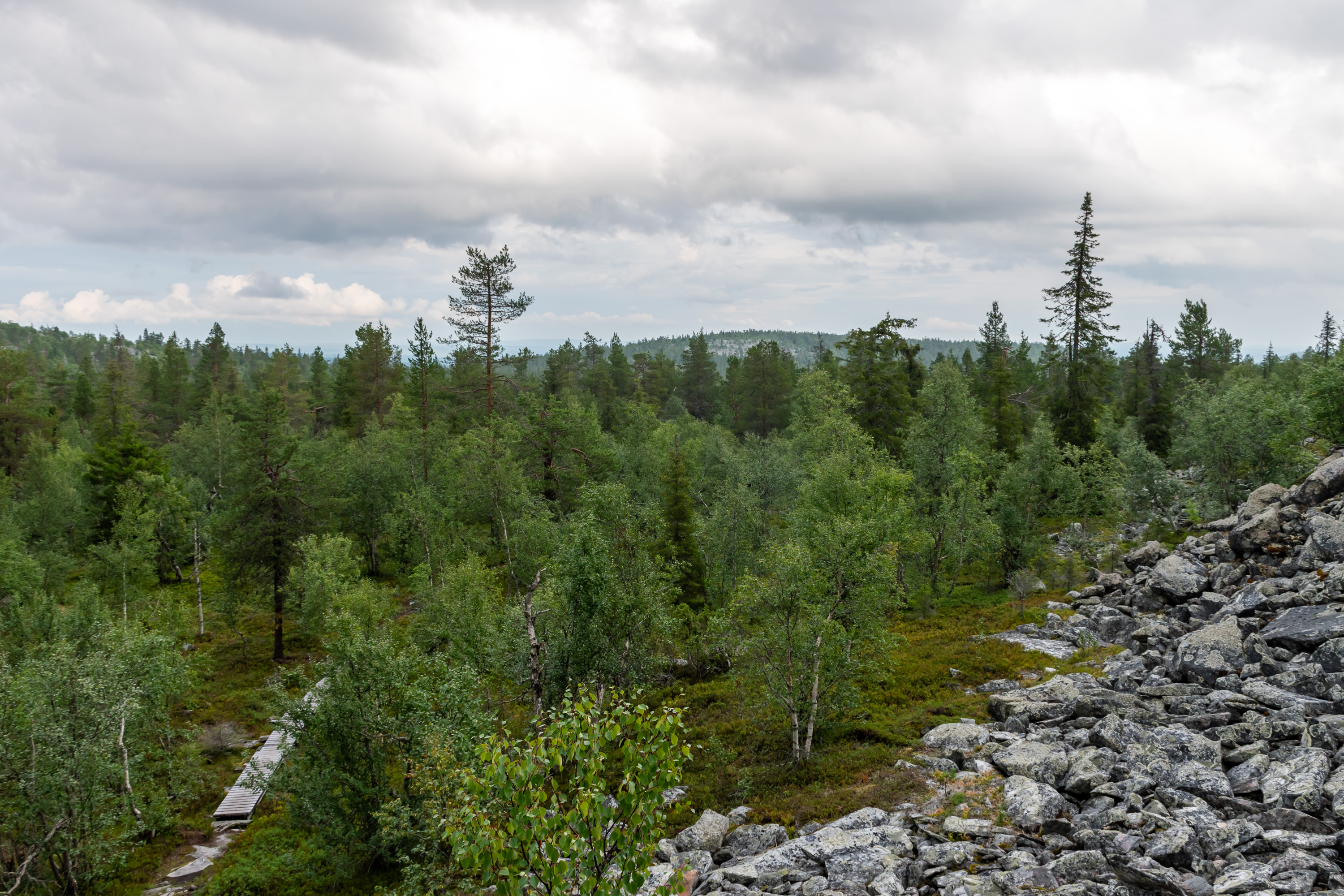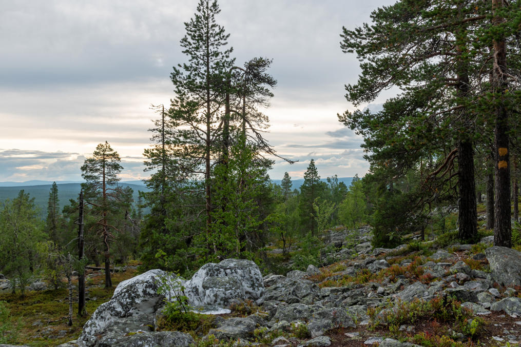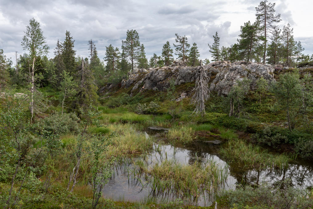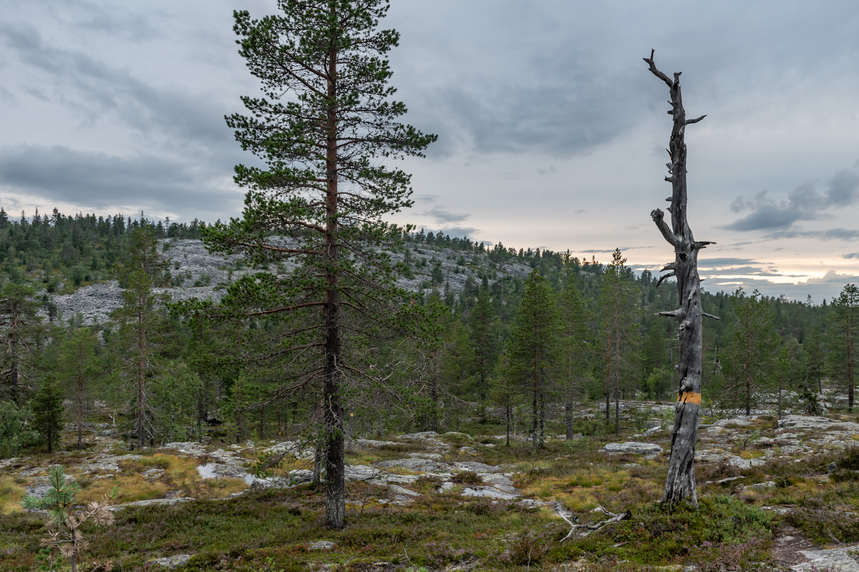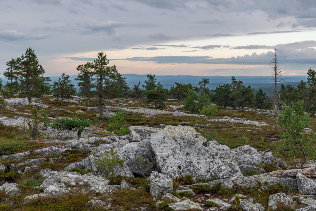 23. Гора испещрена маленькими каменными россыпями и гребнями бело-серых скал, вполне оправдывая название "Каменная тундра". Ну, точнее, наполовину; "тундра"/"тунтури" (tunturi) обычно подразумевает, что на верхушке деревьев не растет, но эта гора все-таки недостаточно высокая, чтобы быть полностью лысой. (Для сравнения, например, см. Аакенус в национальном парке Паллас-Юллястунтури.)