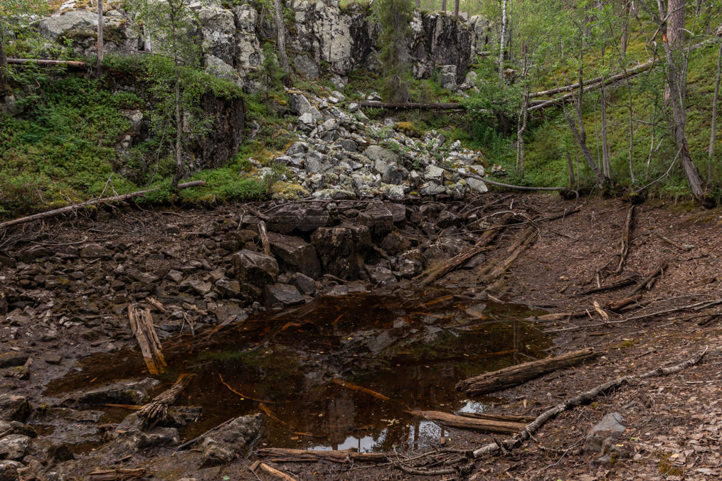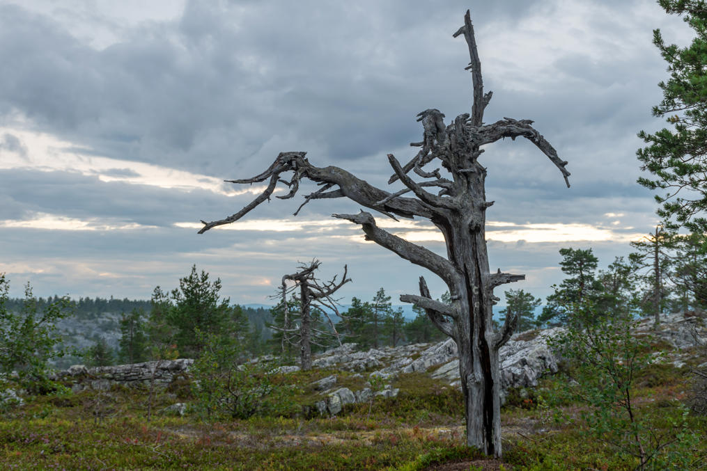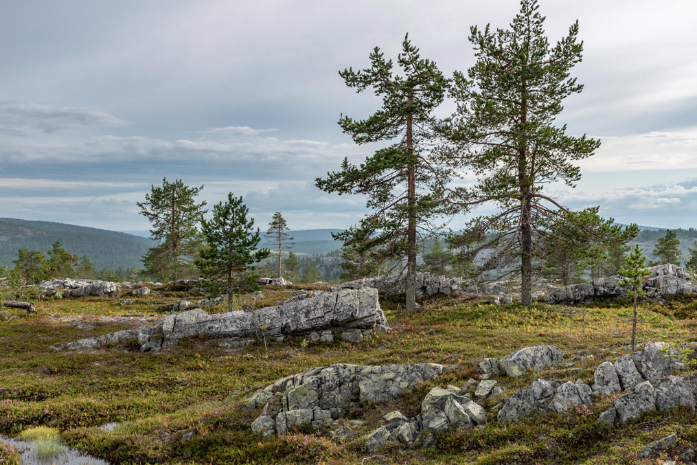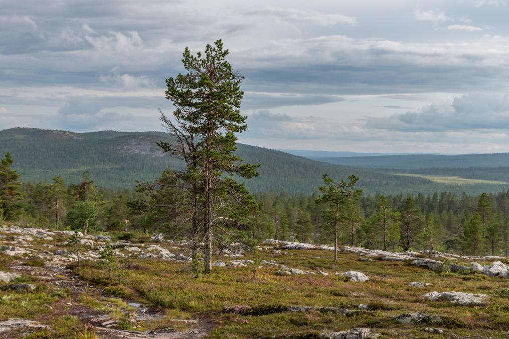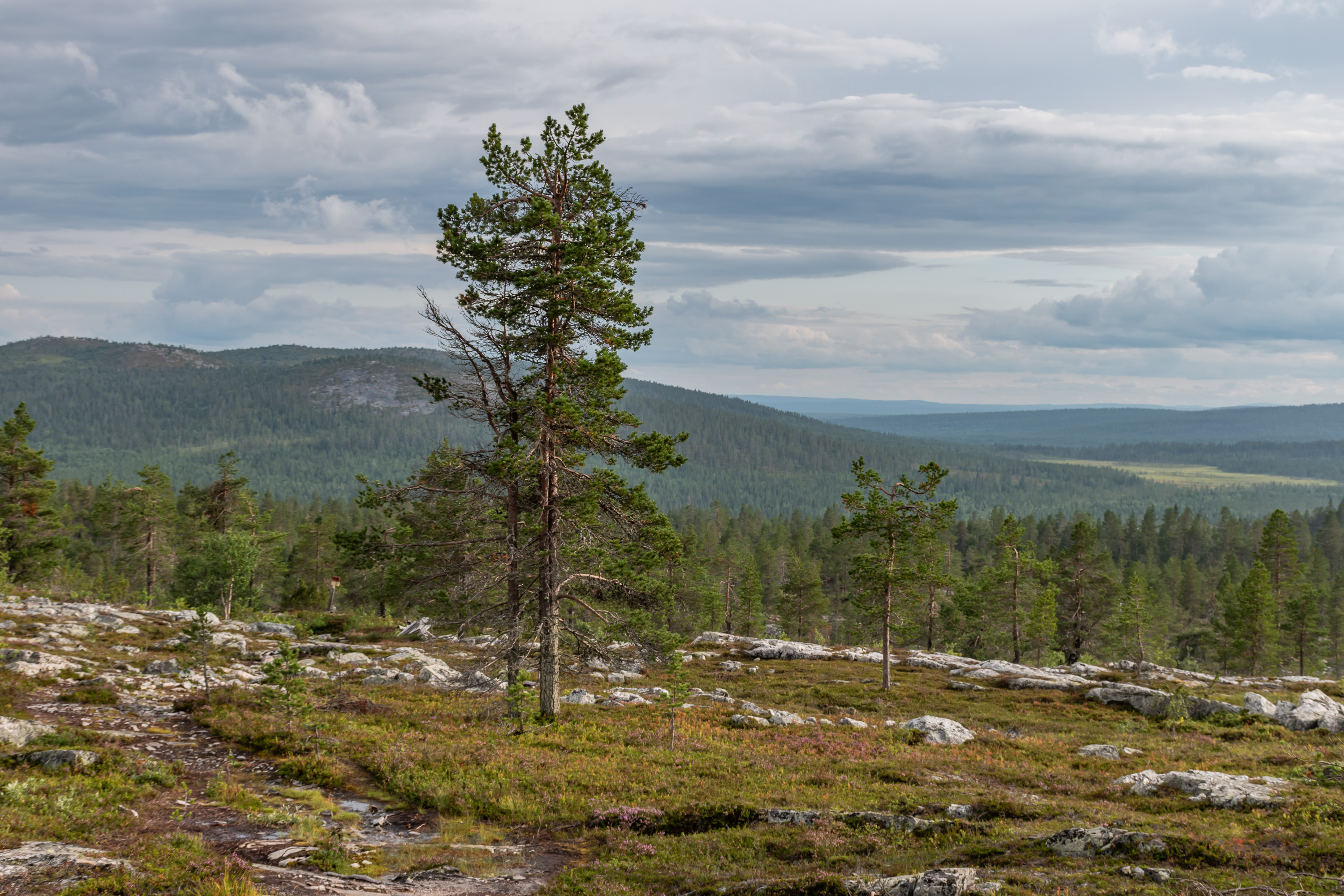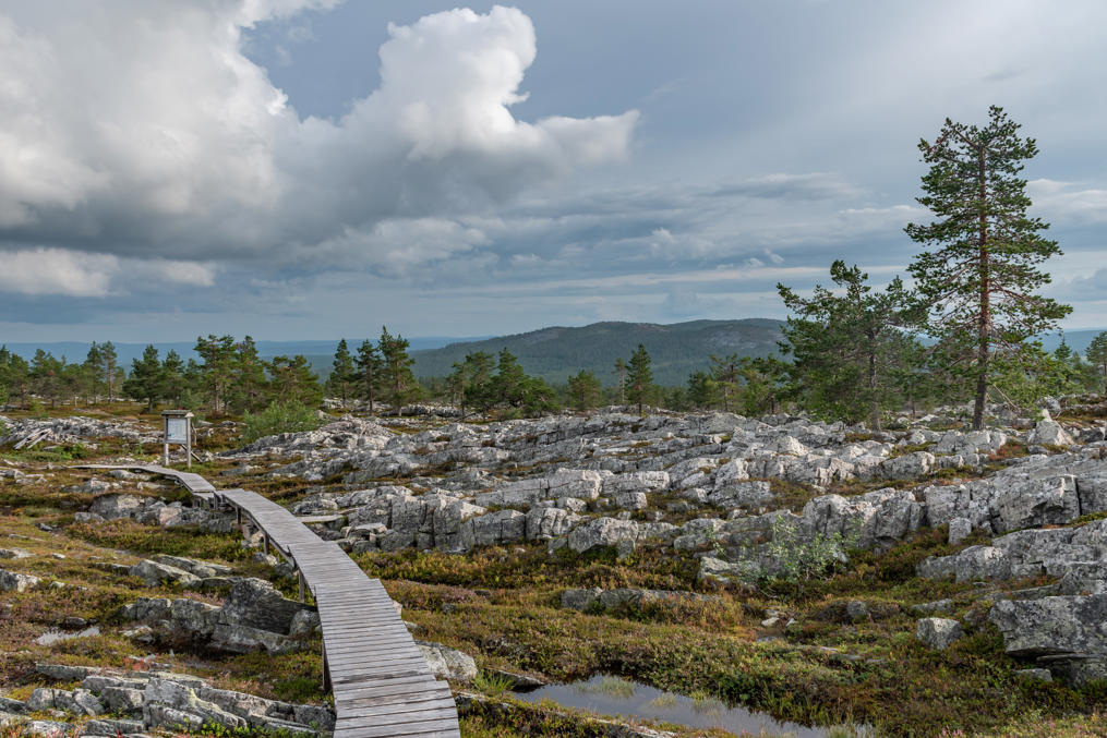 23. Гора испещрена маленькими каменными россыпями и гребнями бело-серых скал, вполне оправдывая название "Каменная тундра". Ну, точнее, наполовину; "тундра"/"тунтури" (tunturi) обычно подразумевает, что на верхушке деревьев не растет, но эта гора все-таки недостаточно высокая, чтобы быть полностью лысой. (Для сравнения, например, см. Аакенус в национальном парке Паллас-Юллястунтури.)