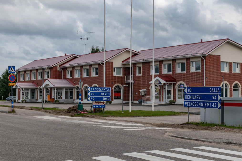 8. Главный перекресток. Расстояния достаточно приличные, учитывая, что вдоль этих дорог практически никакой цивилизации по пути нет. В доме на заднем плане видна вывеска Sokli — тут как раз находится контора экспериментального рудника Сокли, но до самого рудника, собственно, отсюда ехать и ехать 90 км.