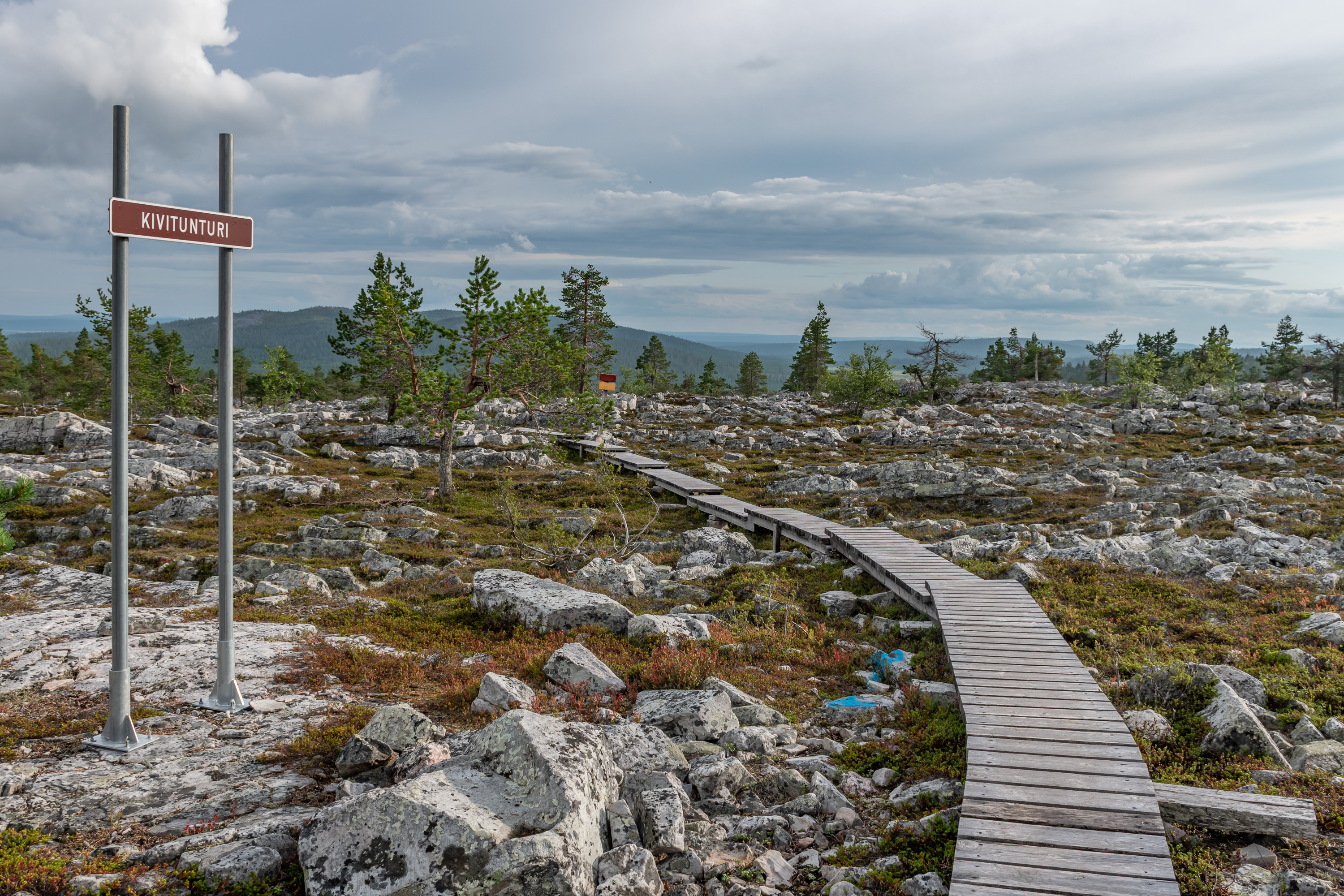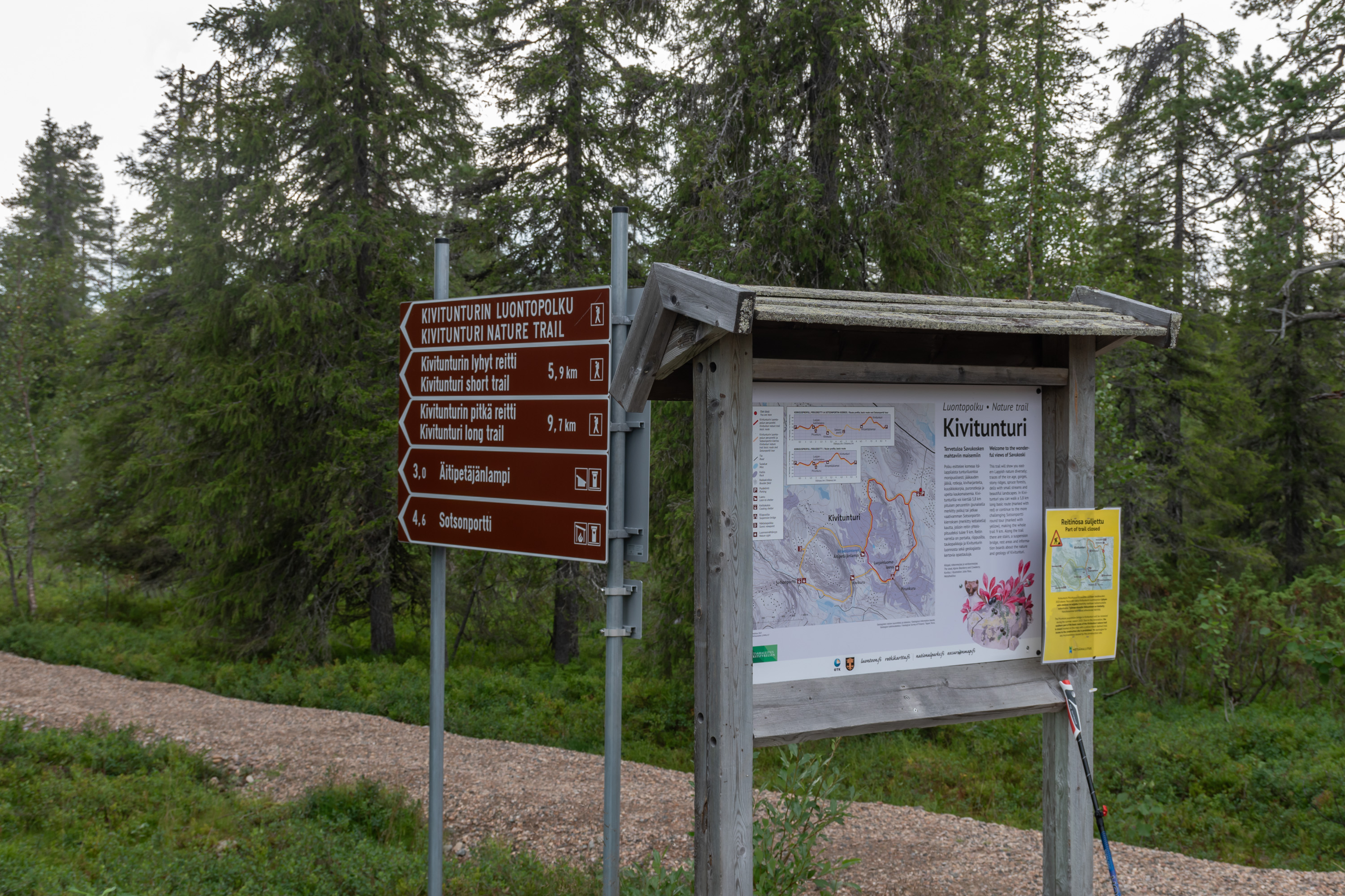19. Полный, в виде восьмерки, дневной маршрут по Кивитунтури имеет длину почти 10 км, более короткий — 6 км. Подъемы-спуски на тропе довольно минимальные, идти несложно. К сожалению, один из участков тропы с несколькими достопримечательностями был закрыт на ремонт (табличка вон желтая висит) — я не стал туда соваться.