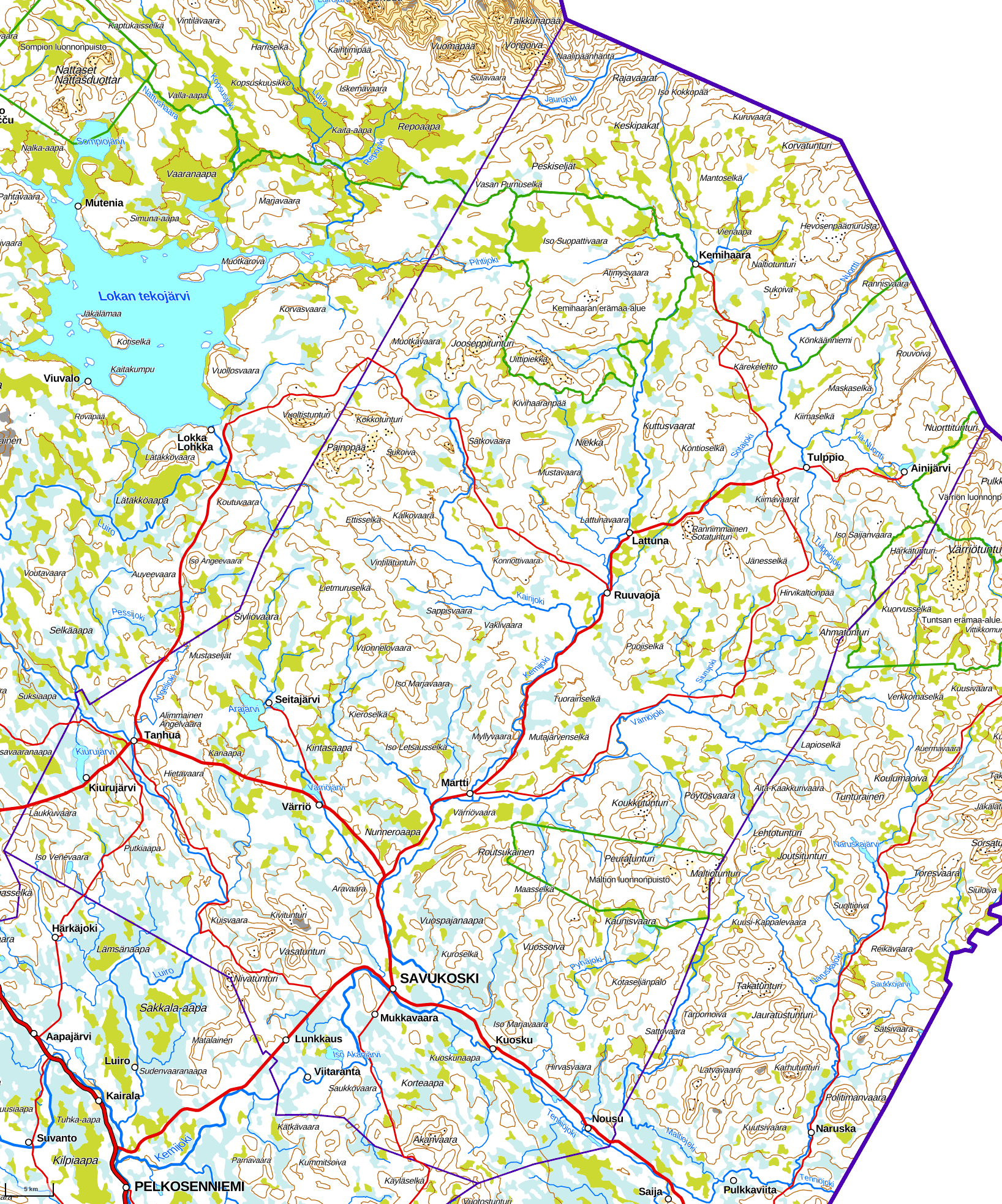 В наши дни в лесах и болотах Савукоски, разумеется, лежит целый ряд охраняемых природных территориях: заповедники Малтио (Maltio) и частично Вярриё (Värriö) (последний с круглогодично действующей биостанцией), заповедные территории Кемихаара (Kemihaara) и частично Тунтса (Tuntsa), а также юго-восточный отрог огромного национального парка имени Урхо Кекконена (Urho Kekkosen kansallispuisto), так называемая Итякайра (Itäkaira), Восточная Кайра. Про национальный парк и большой поход в нем я писал когда-то, но природа его той, основной части все же существенно отличается от здешних болот Итякайры. Но два официальных пеших маршрута в Итякайре все же есть — вдоль каньона реки Нуортти почти до самой российской границы, и на саму границу — к знаменитой горе Корватунтури.