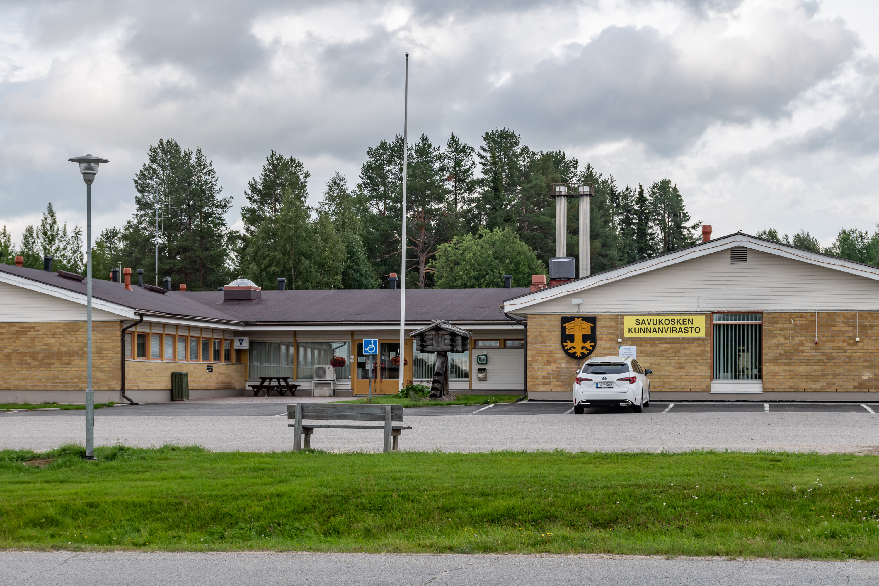 12. Муниципальная администрация. На гербе Савукоски изображеная классическая саамская "избушка на курьей ножке"; на самом деле это не избушка, а совсем маленькая постройка, для хранения продуктов в труднодоступном для животных месте. Реальная копия такой постройки установлена тут же рядом. Это называется ньялла, njalla, по-саамски, или nili по-фински. В наши дни в Савукоски уже нет саамов, недостаточно далеко на север, и напоминает о них только этимология некоторой топонимики.