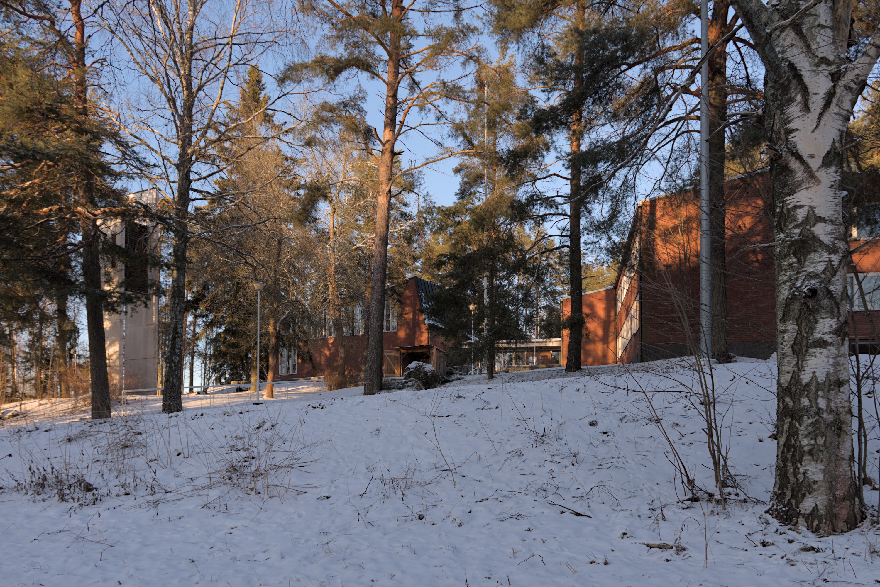26. Отсюда хорошо видна над Санталахти одна из главных достопримечательностей Писпалы — вышка завода оружейной дроби (haulitorni). В таких вышках раньше дробь изготовлялась крайне простым методом: с вершины в широкую трубу капали расплавленным свинцом, и, пока его капельки падали, они успевали застыть в круглые дробины. Писпальский завод действовал с 1850-х по 1972, вышка построена была в 1908 (до этого была другая деревянная). Это был не единственный завод дроби в Финляндии, но вышка такая осталась только в Тампере. Она никак не используется и наверх никого не пускают, служит просто памятником, в 2020 даже за счет города капитально отремонтировали, полностью разобрав и отстроив потом обратно в процессе.