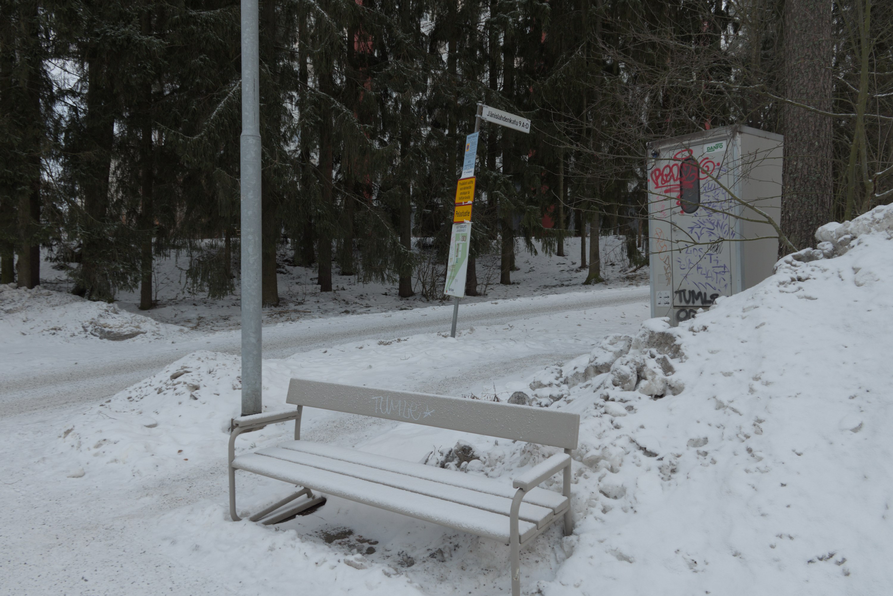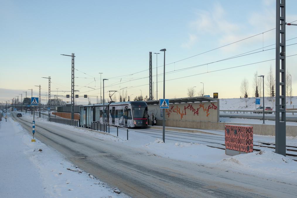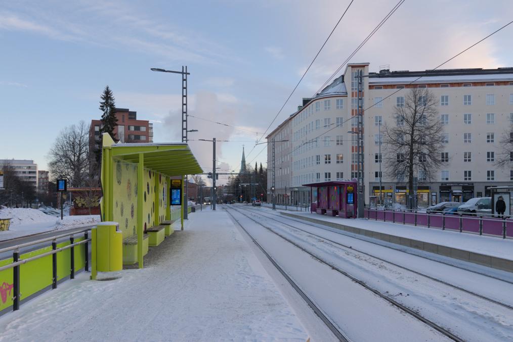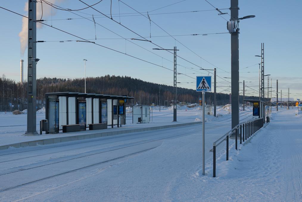 9. Первая остановка на новой линии — Сяркянниеми (Särkänniemi). Название выбрано достаточно вольно — до знаменитого парка аттракционнов на одноменном полуострове, название которого означает "Дюнный мыс", идти отсюда метров семьсот, от остановки его никак не видно. Но тем не менее ближайшая к Сяркянниеми остановка, действительно.