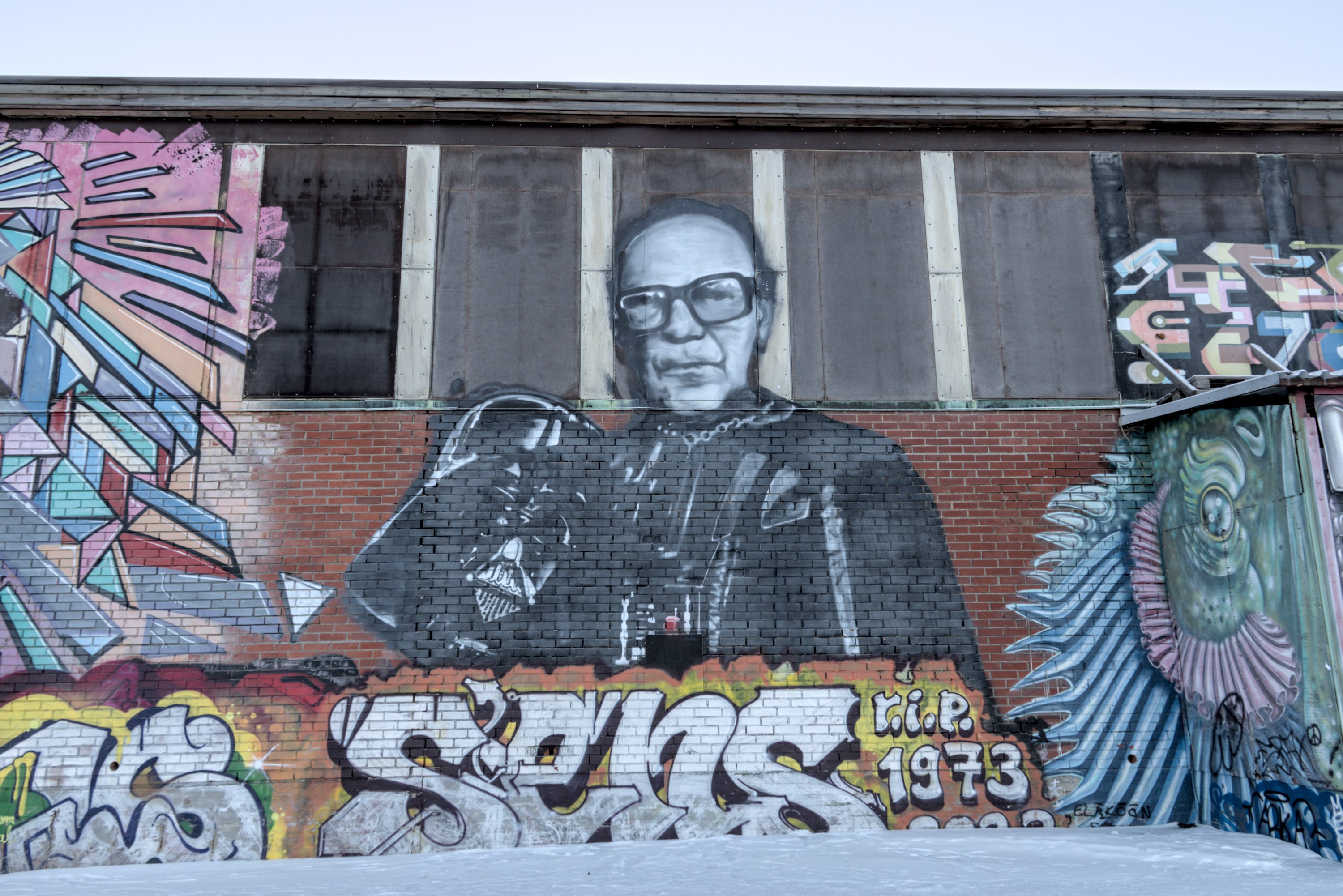 43. Северные стены комбината используются под граффити. Бросается в глаза, конечно, больше всего Кекконен-Дарт Вейдер, на последнем фото.