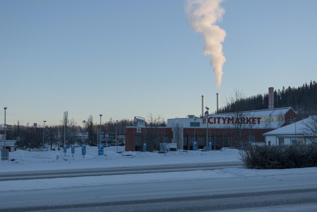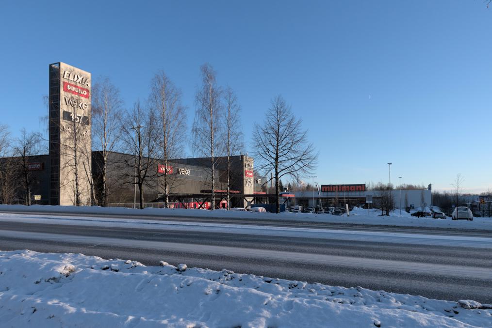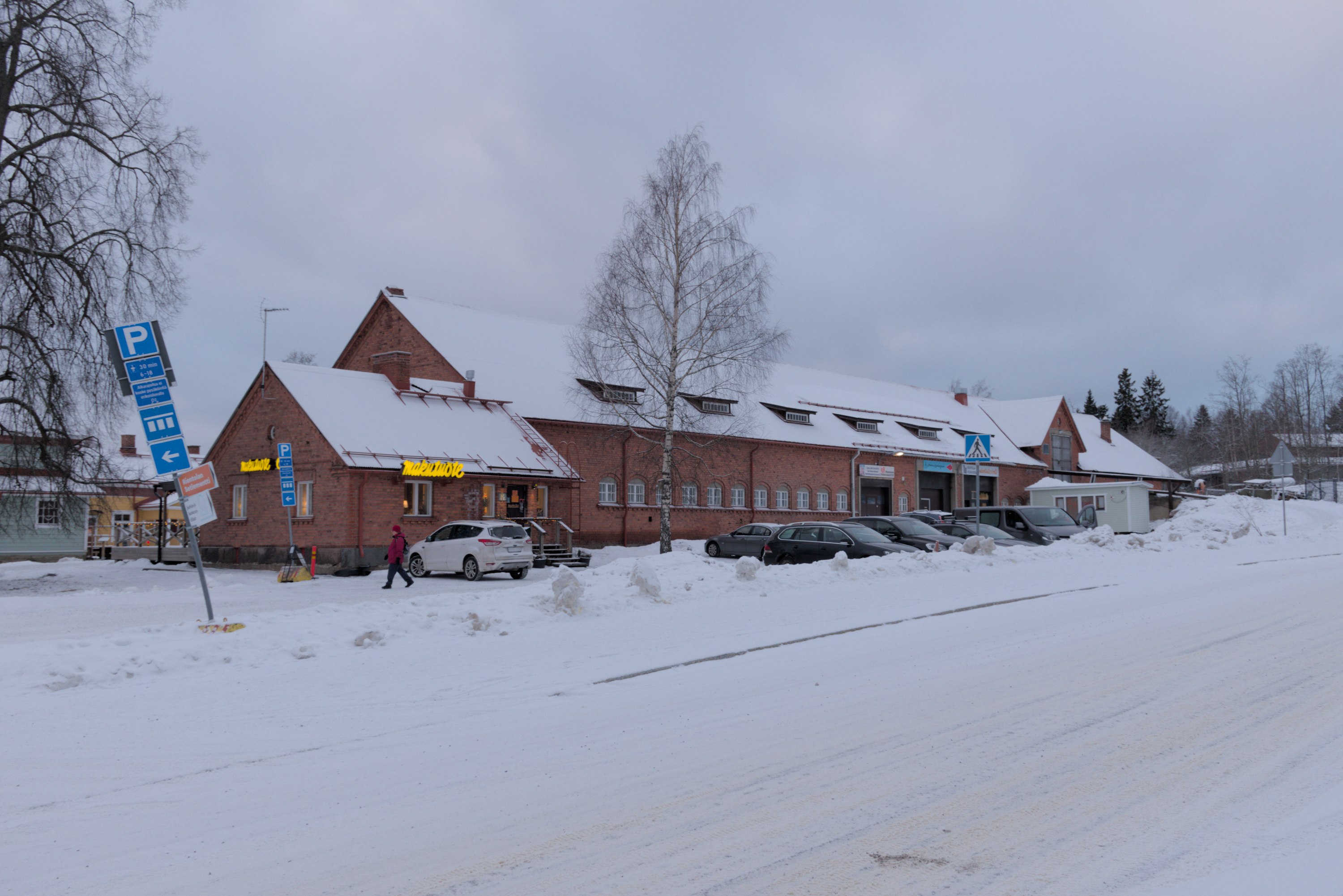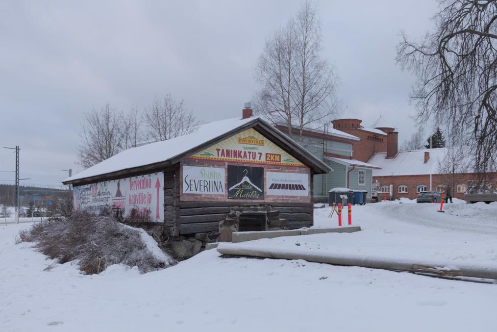 60. Этот район более старый, чем Ниеменранта. Жилые дома в этой ближней части, впрочем, поновее, но магазин видно что немолодой. (Белые человеческие фигуры на нем, как и во многих других местах Тампере, поставили этой зимой в качестве какого-то арт-проекта.)