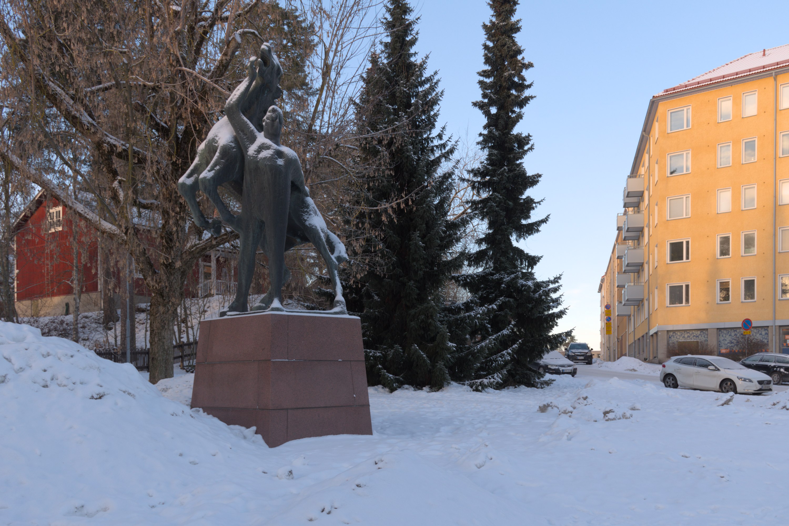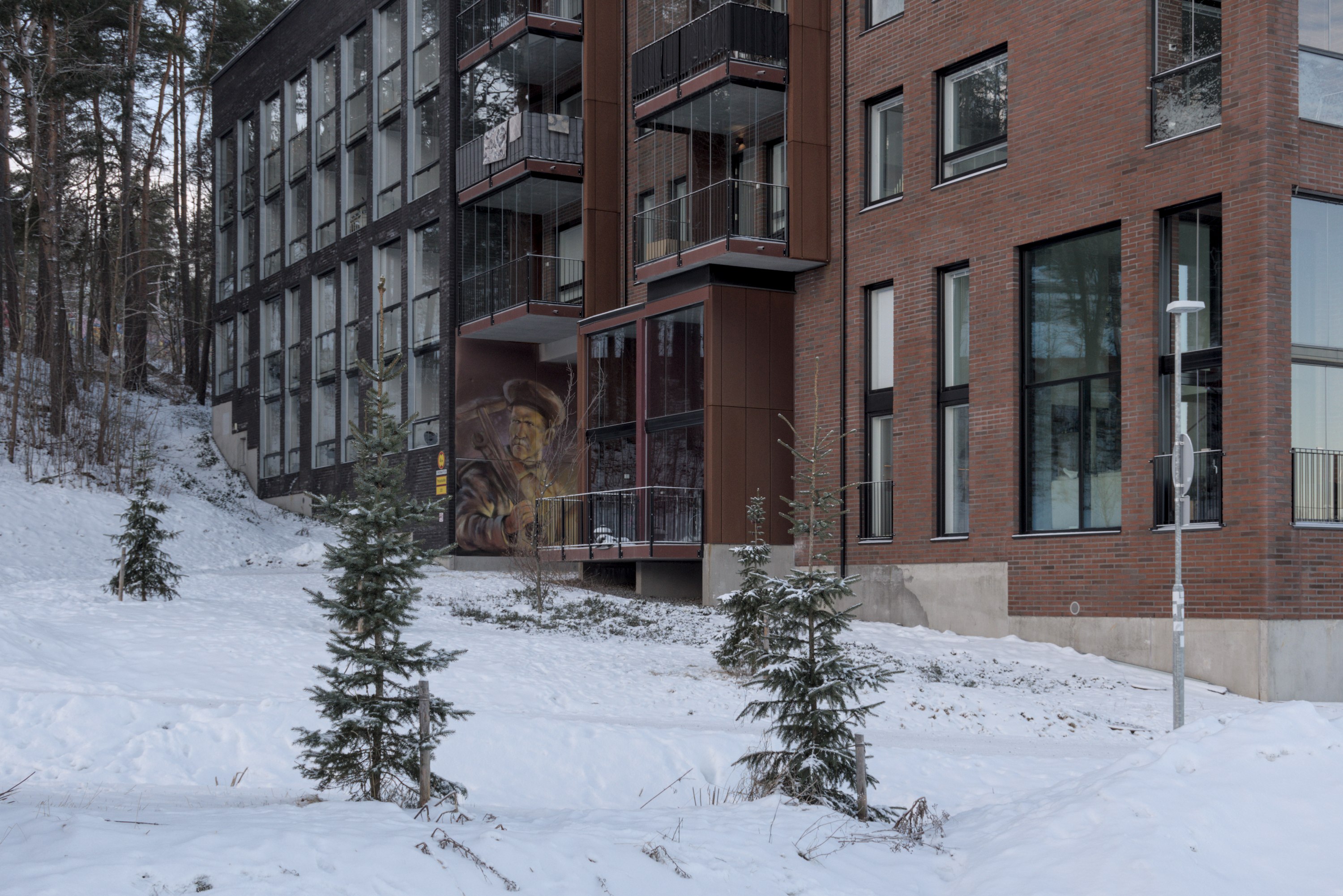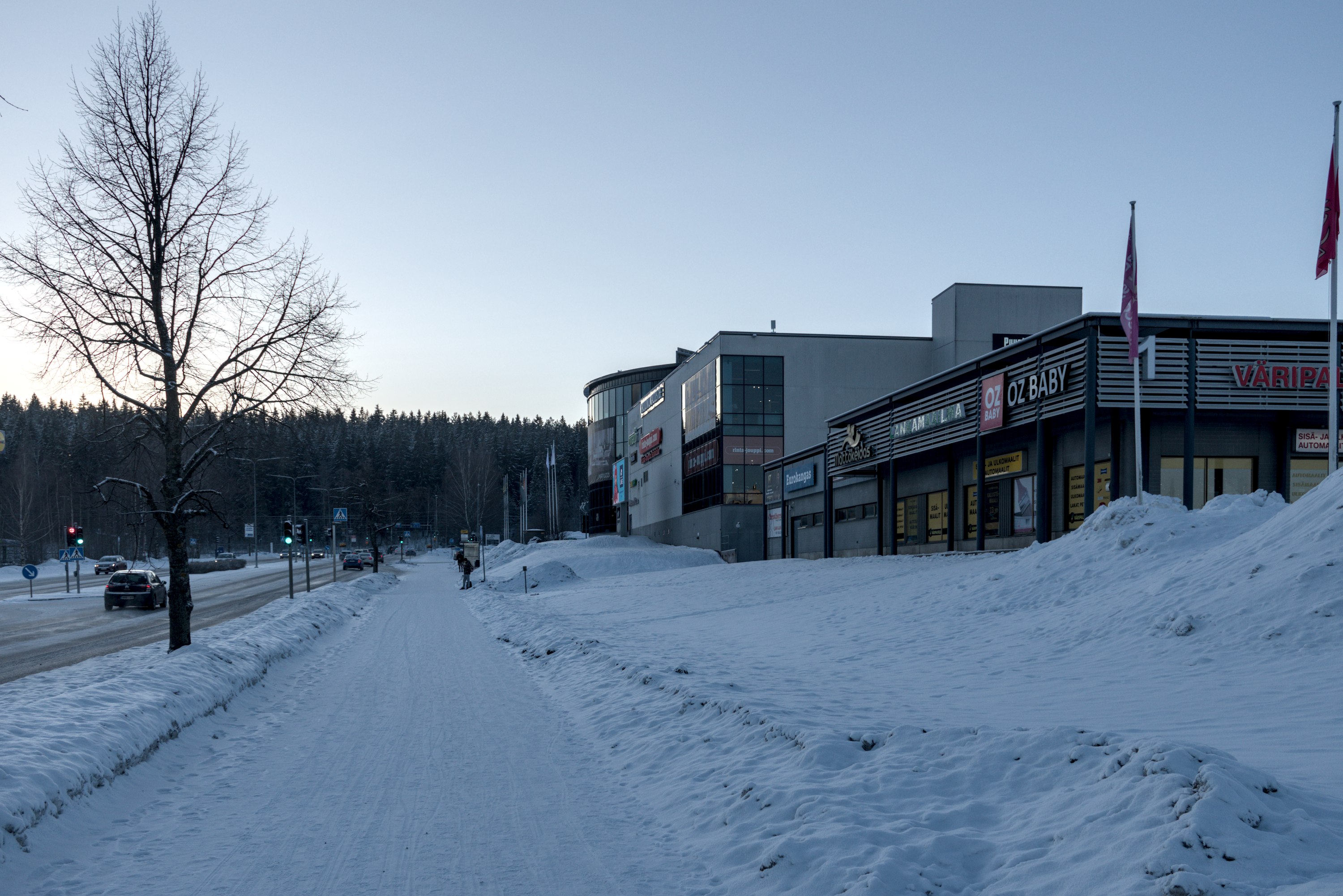 60. Этот район более старый, чем Ниеменранта. Жилые дома в этой ближней части, впрочем, поновее, но магазин видно что немолодой. (Белые человеческие фигуры на нем, как и во многих других местах Тампере, поставили этой зимой в качестве какого-то арт-проекта.)