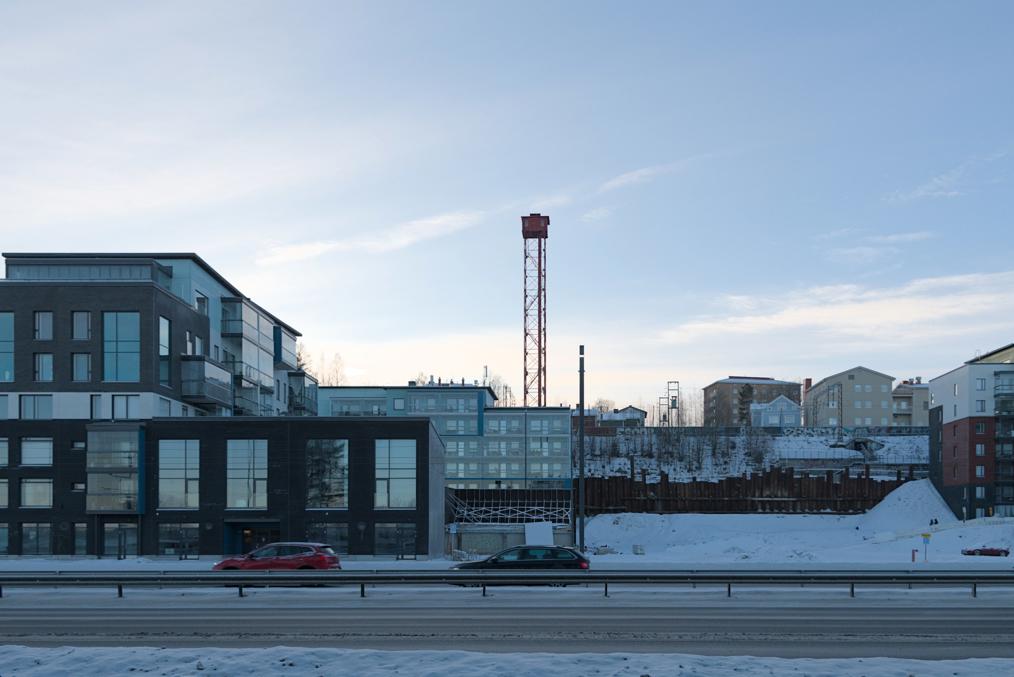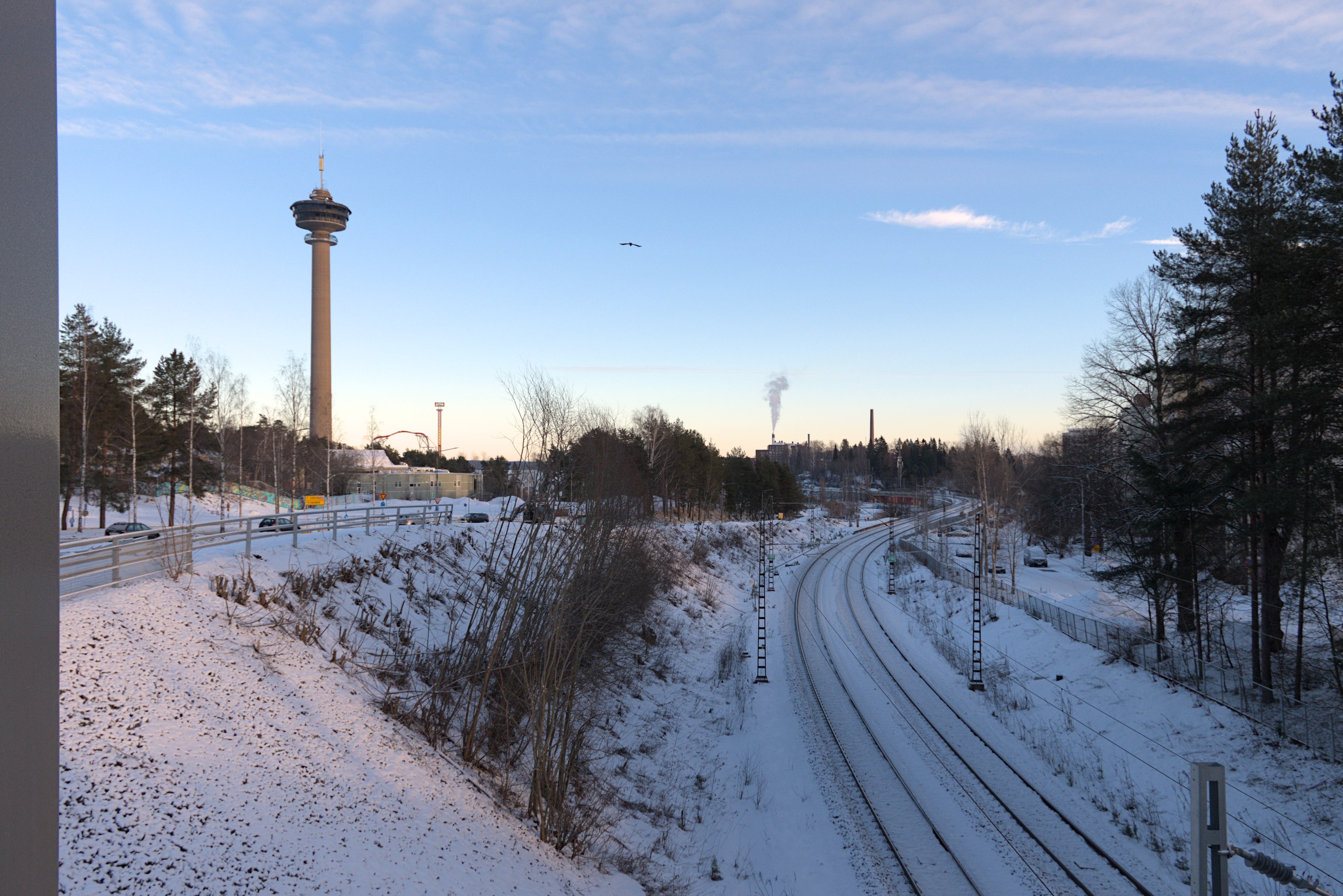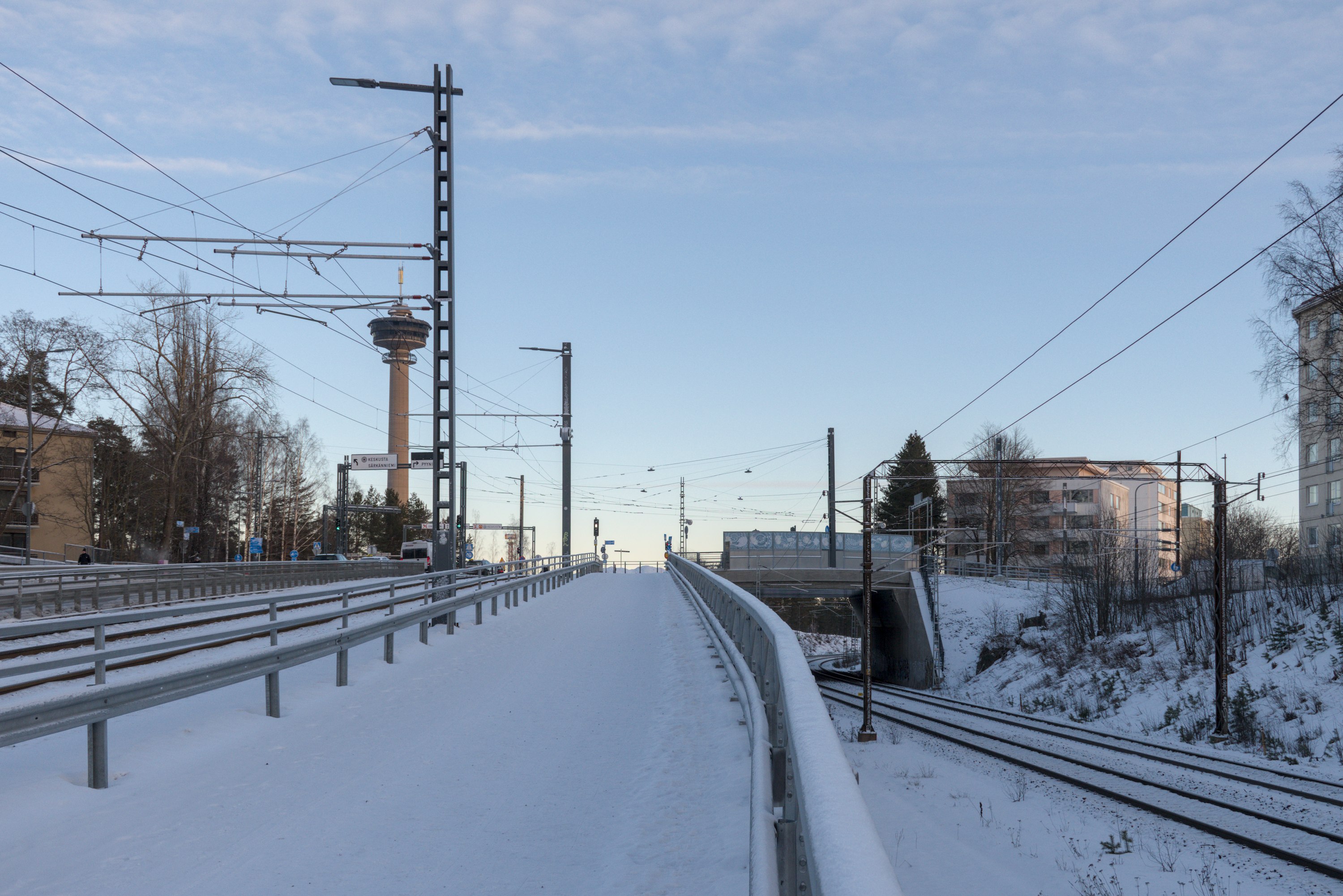 11. На восток с путепровода видна находящаяся в парке аттракционов Сяркянниеми смотровая вышка Нясиннеула (Näsinneula), Нясинская игла, одна из главных достопримечательностей Тампере. C 1971 года вышка высотой 134.5 м (168 м со шпилем) была самым высоким зданием Финляндии, но в 2024-2025 уступает этот титул вышке на кабельном заводе Prysmian в Киркконумми, которую будут использовать для изготовления крупных кабелей. Та вышка должна быть высотой в 185 м, хотя новостей про то, готова ли она уже на данный момент, вроде пока не было.