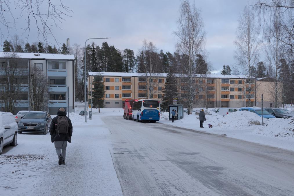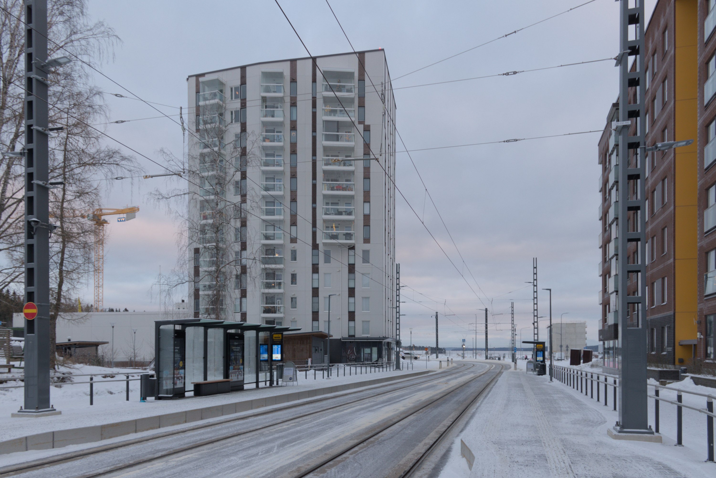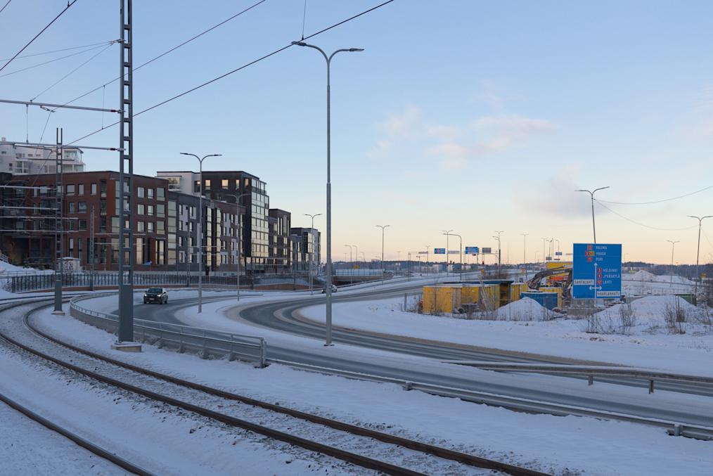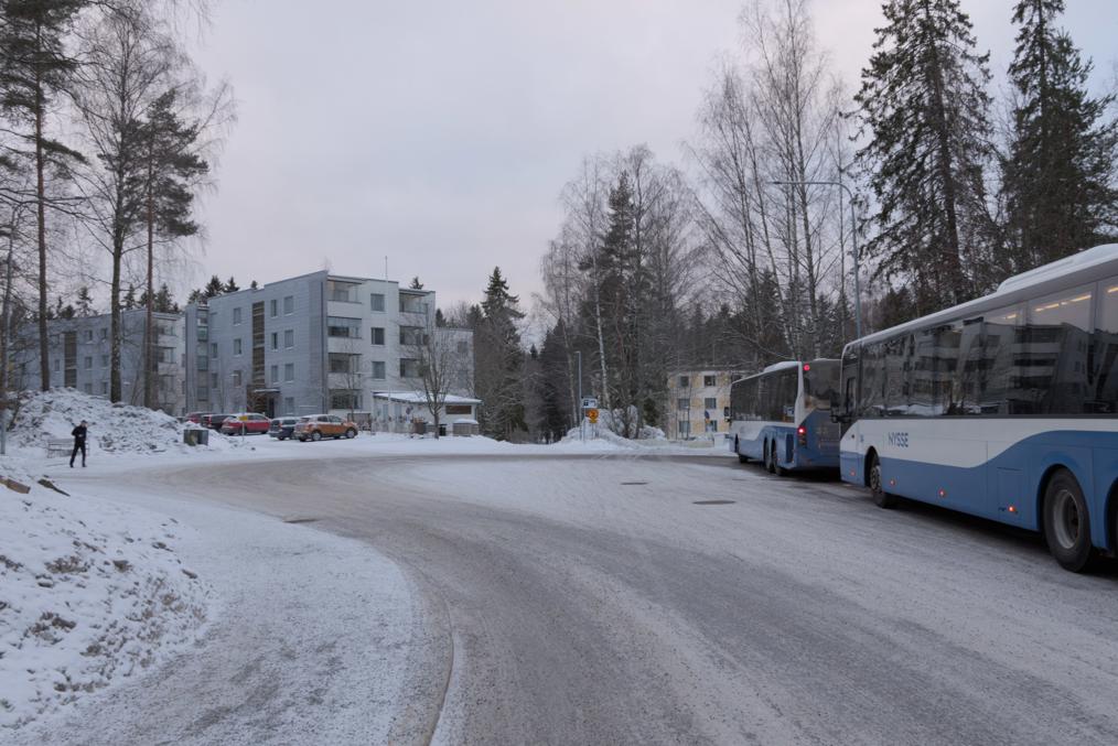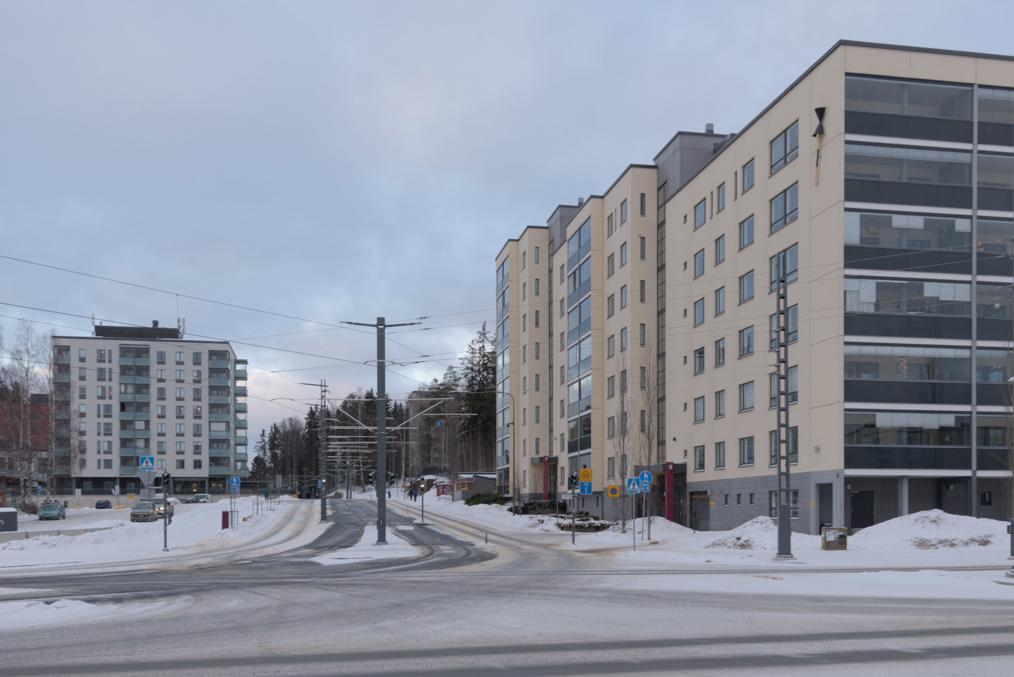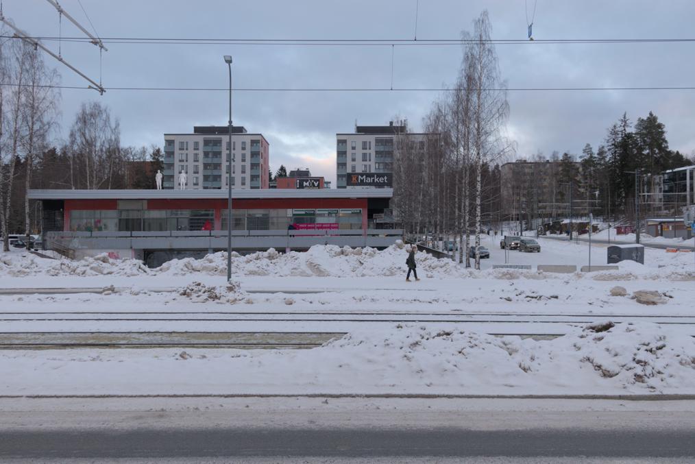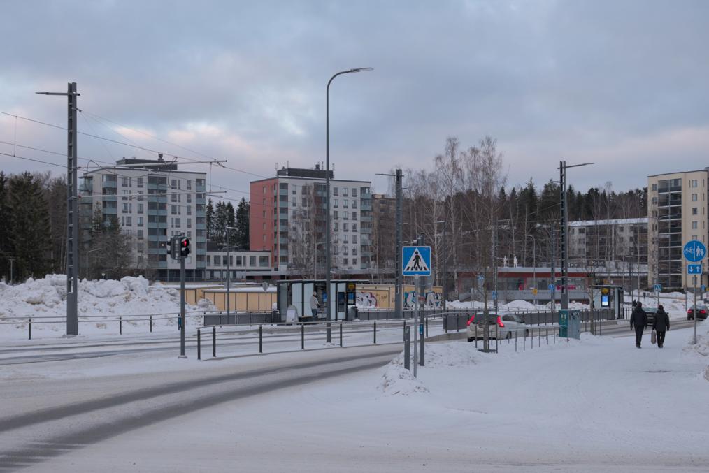68. Например, старые многоэтажки стоят вокруг автобусного кольца, до которого ходили главные автобусы на Лентявянниеми — маршруты 9 и 19, закрытые с пуском трамвая. Я как раз сам на автобусе сюда доехать успел, трамвай же официально пустили на несколько дней позже, 7 января, и автобусы еще дохаживали последние дни.
