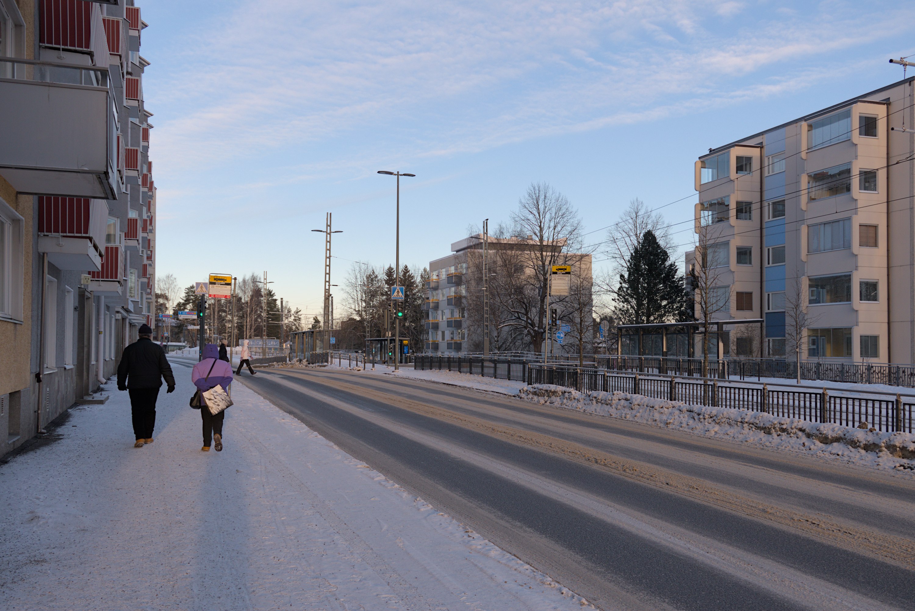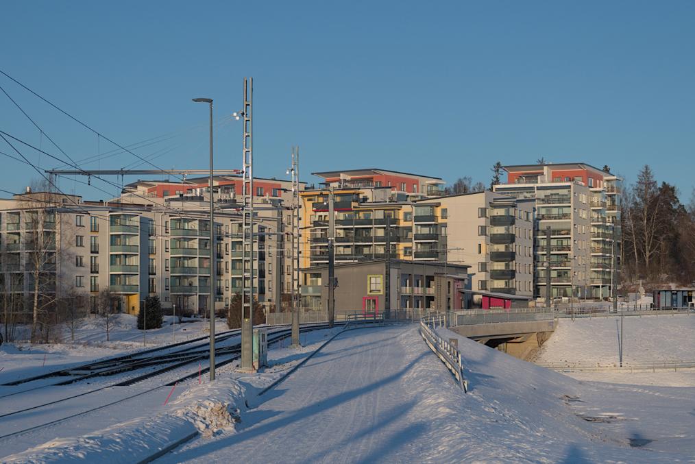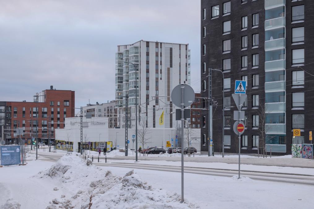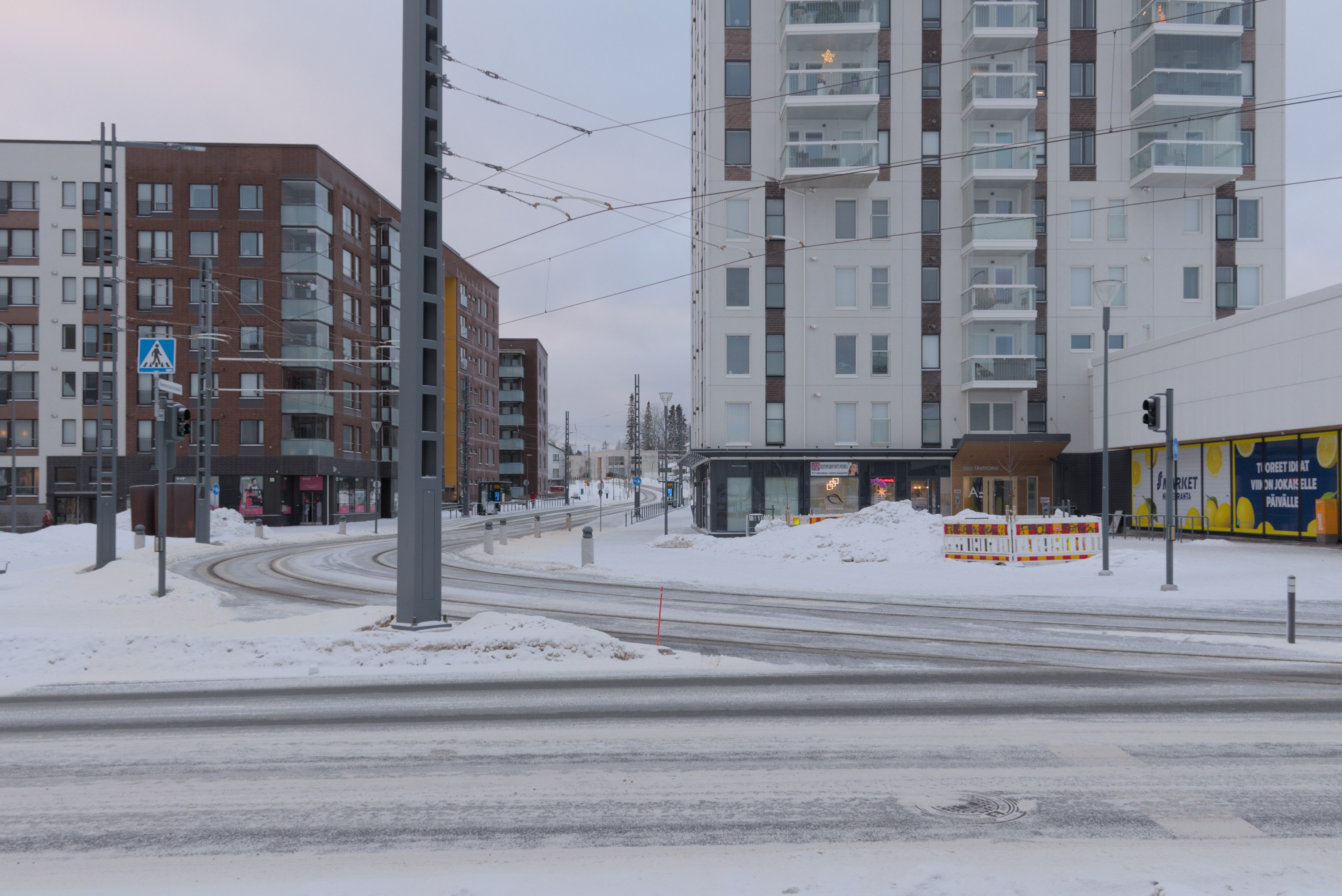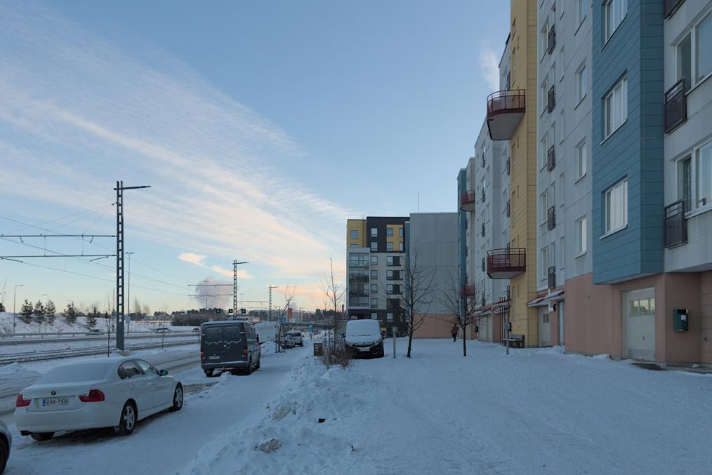 68. Например, старые многоэтажки стоят вокруг автобусного кольца, до которого ходили главные автобусы на Лентявянниеми — маршруты 9 и 19, закрытые с пуском трамвая. Я как раз сам на автобусе сюда доехать успел, трамвай же официально пустили на несколько дней позже, 7 января, и автобусы еще дохаживали последние дни.