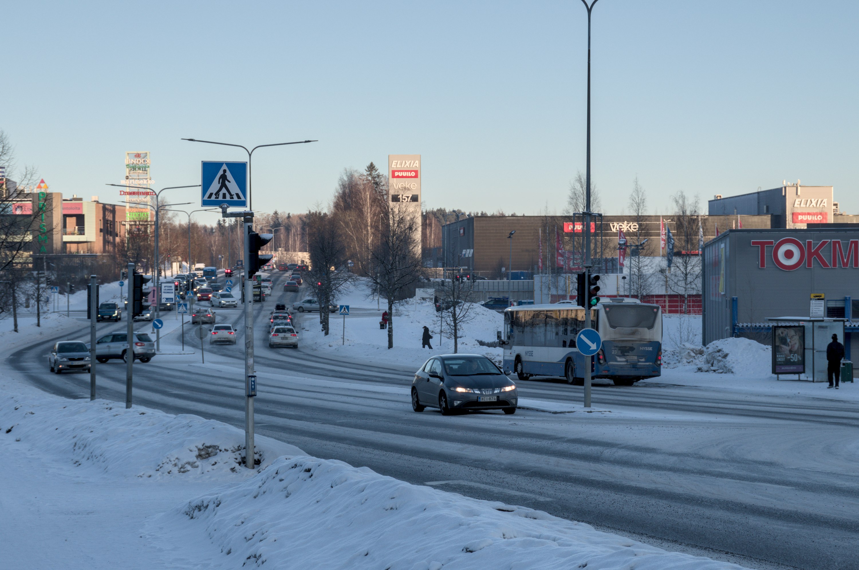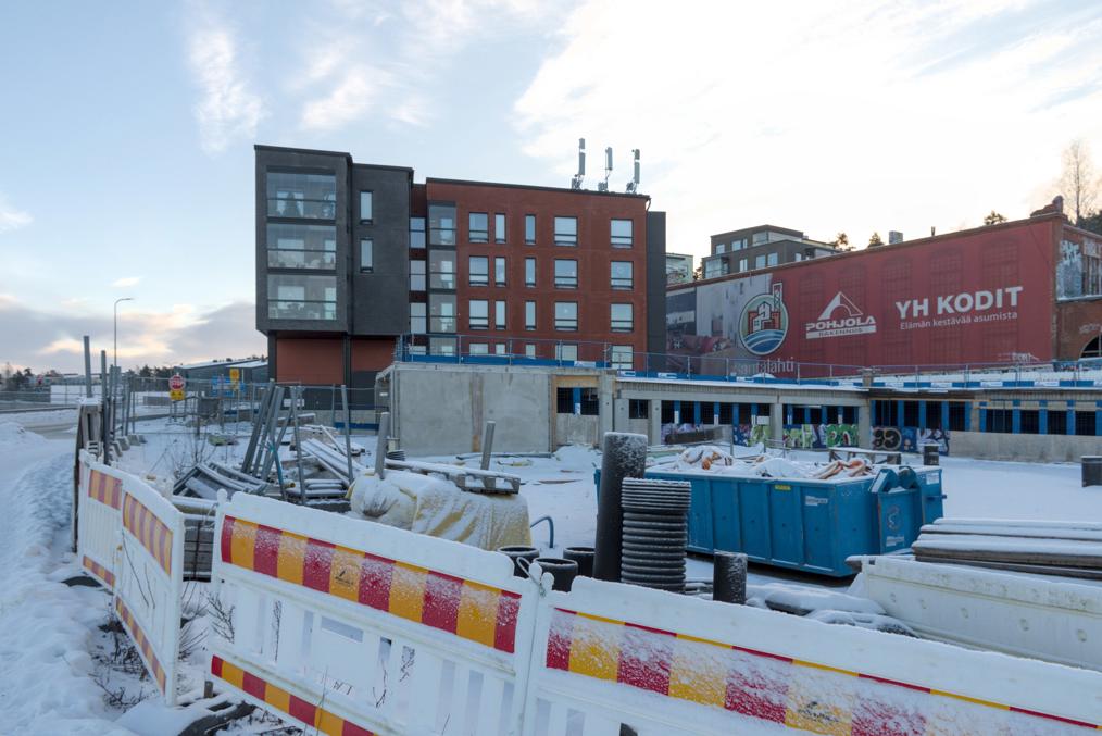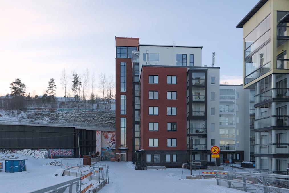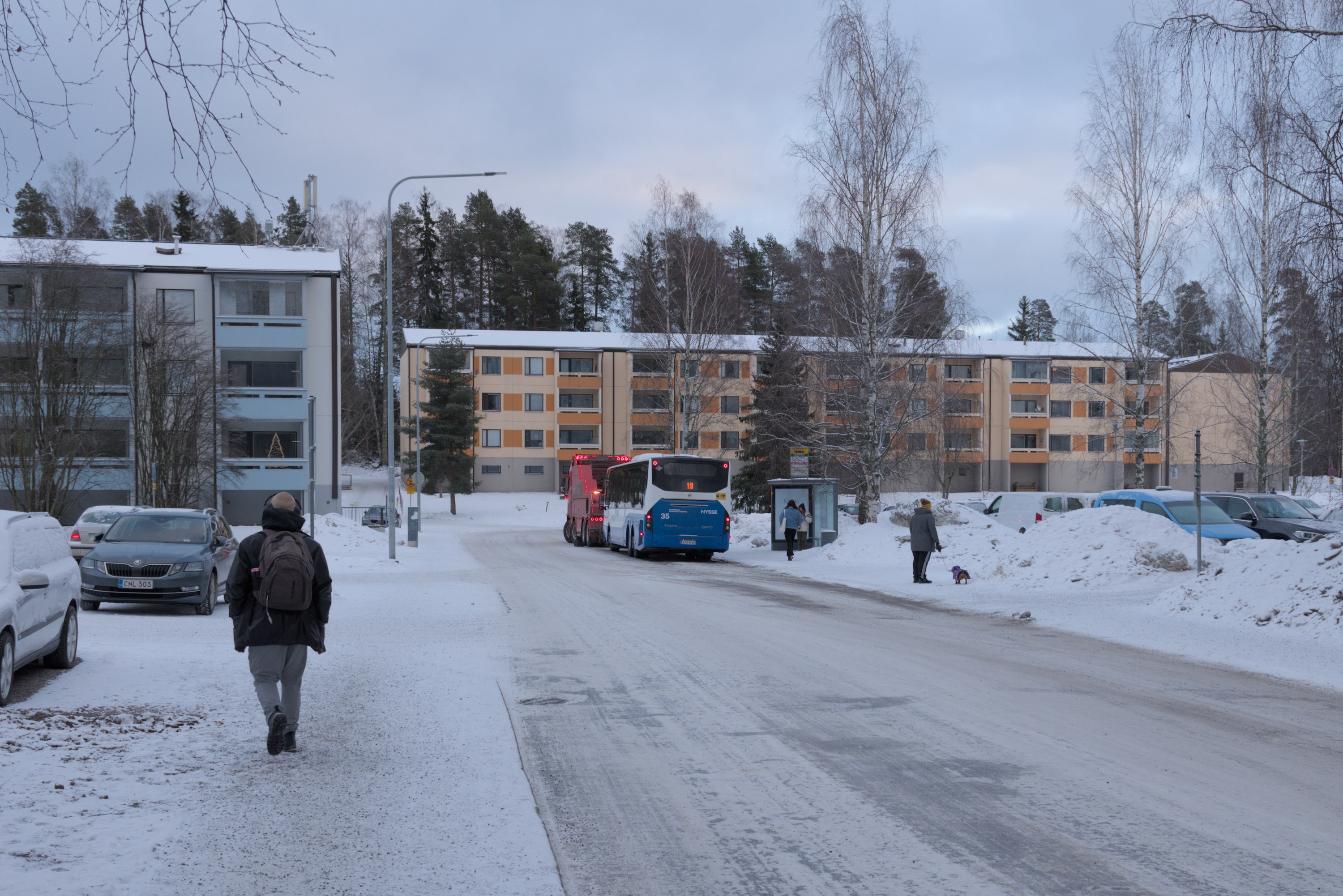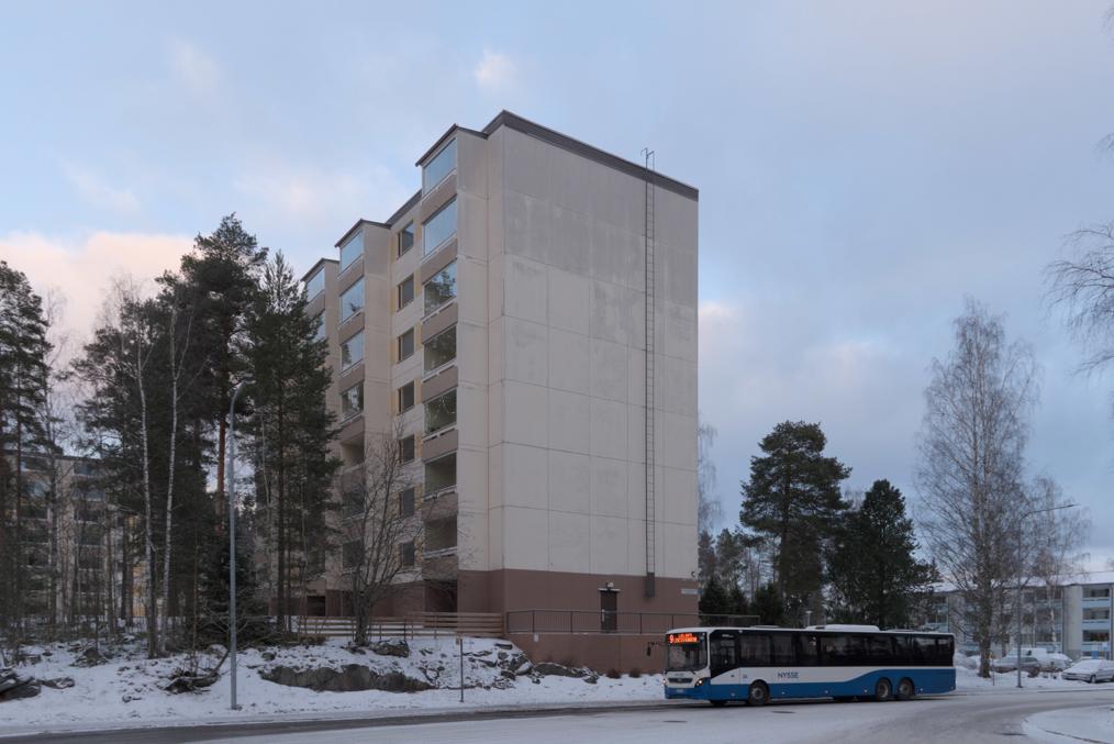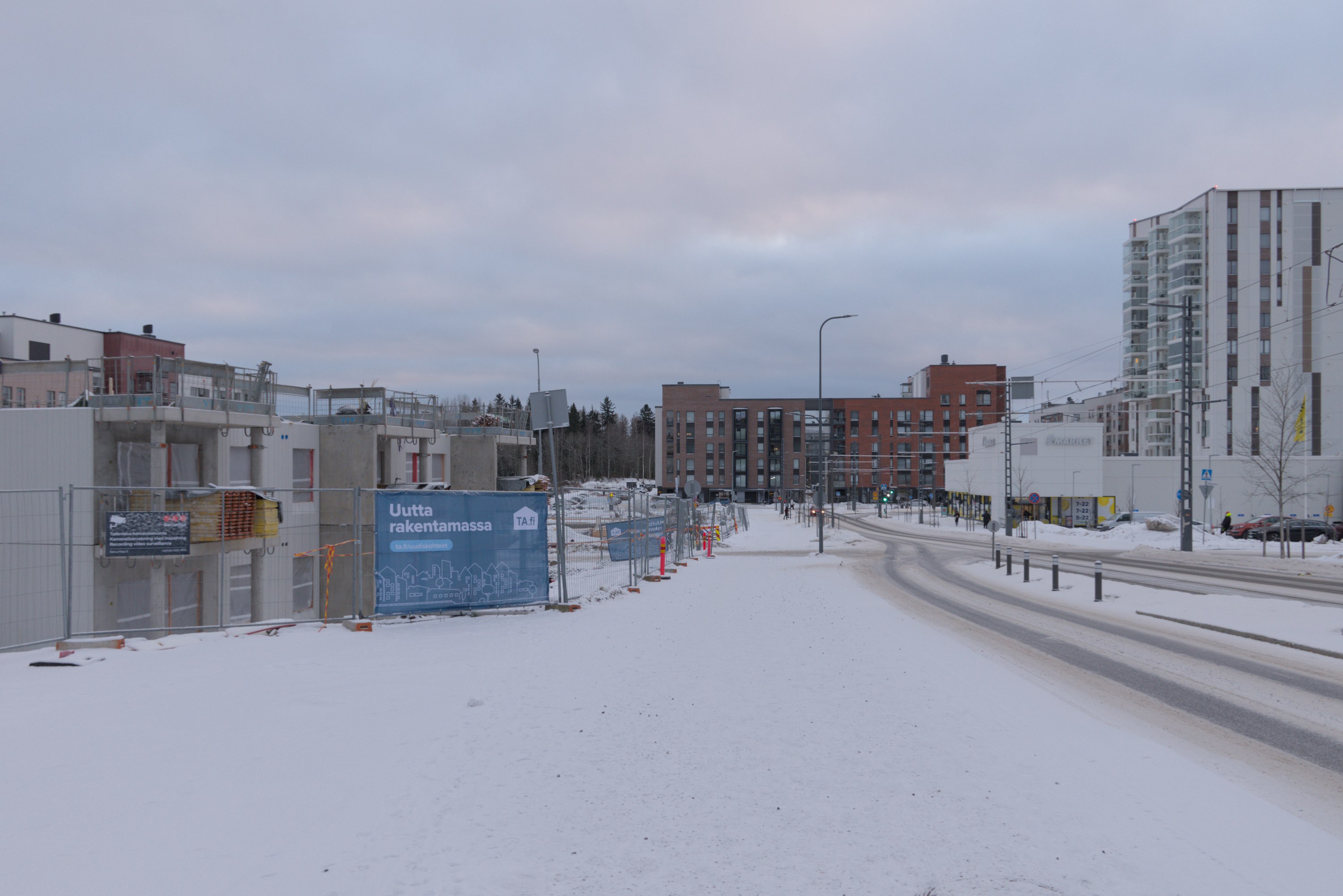 68. Например, старые многоэтажки стоят вокруг автобусного кольца, до которого ходили главные автобусы на Лентявянниеми — маршруты 9 и 19, закрытые с пуском трамвая. Я как раз сам на автобусе сюда доехать успел, трамвай же официально пустили на несколько дней позже, 7 января, и автобусы еще дохаживали последние дни.