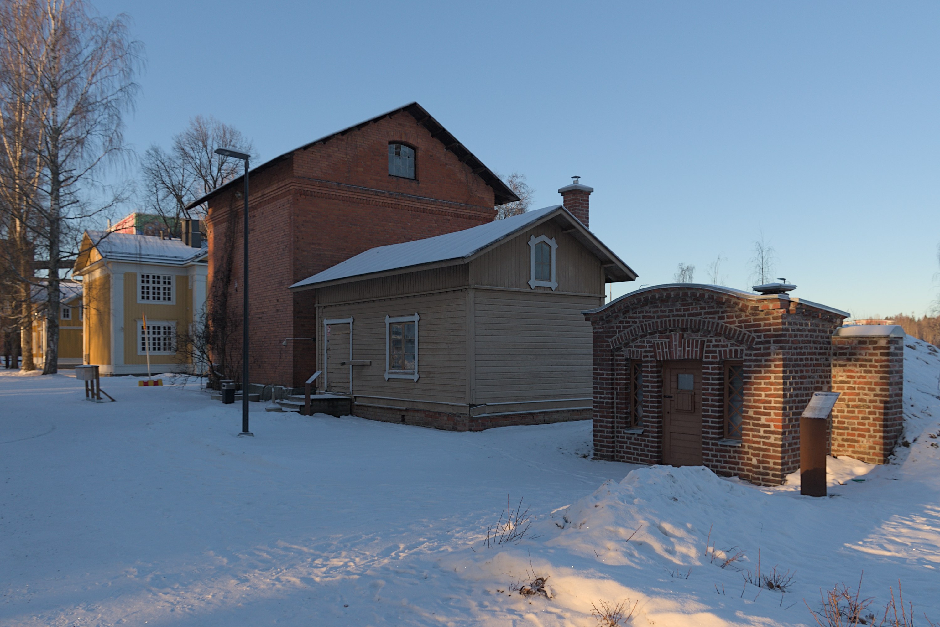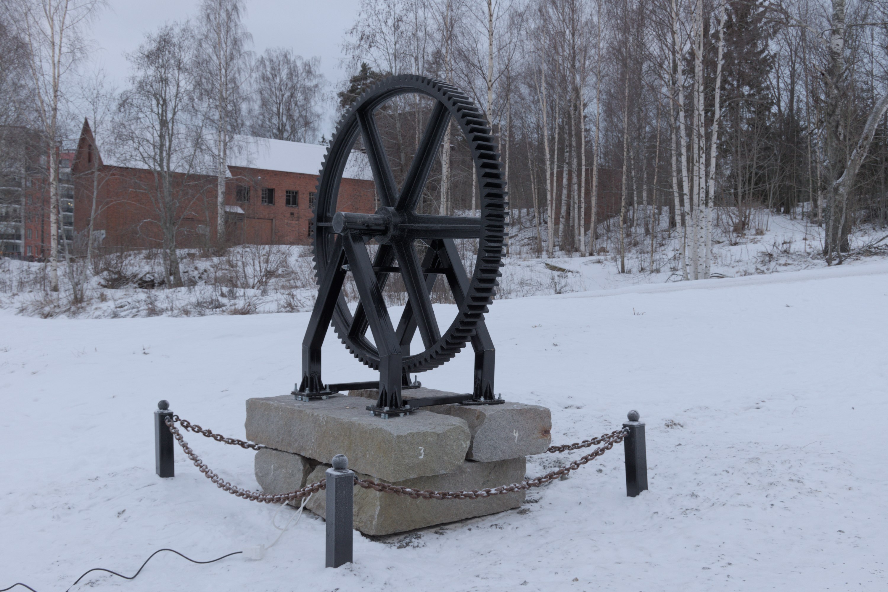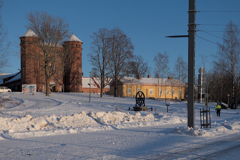 52. Поместье существовало, довольно недалеко от Лиелахти, с 1840; последней его хозяйкой была некая Матильда Ниеми (Matilda Niemi, 1831-1907), которая, будучи бездетной вдовой, в 1887 продала его компании Ahlström, основавшей на землях поместья лесопилку. Сельским хозяйством, впрочем, тоже продолжали заниматься еще долго — коровник с башнями только в 1918 построили, чтобы рабочим было что кушать. Со временем поместье и лесопилка тоже стали частью целлюлозного комбината, в нем в частности размещался рабочий клуб, но ничего почти не трогали и не сносили. Лесопилка проработала до 1960-х, от нее никаких следов не осталось. Но как память промышленному прошлому этих мест и поставили эту шестерню как памятник — вот буквально в тот же день, как я снимал, 4.1.2025, и поставили.