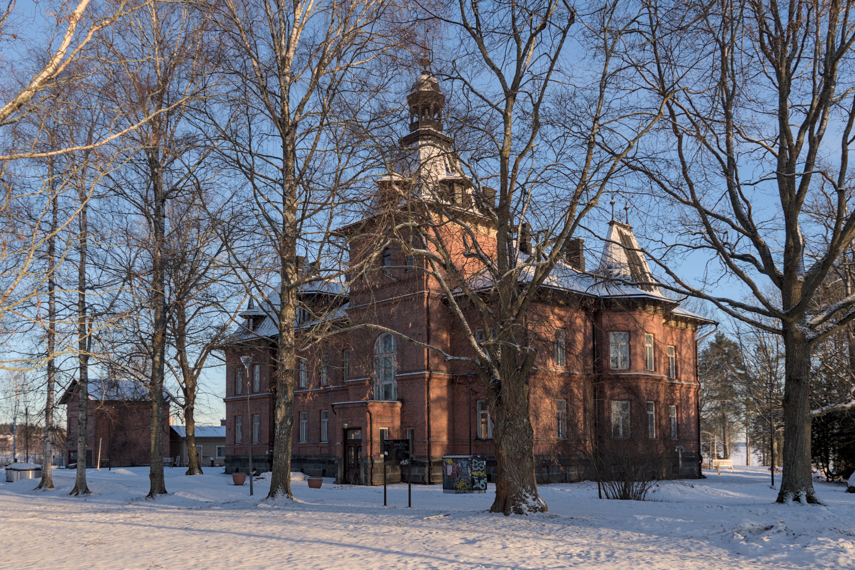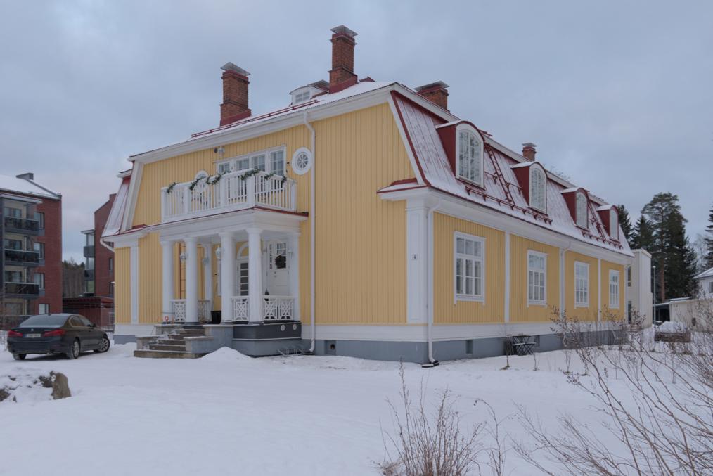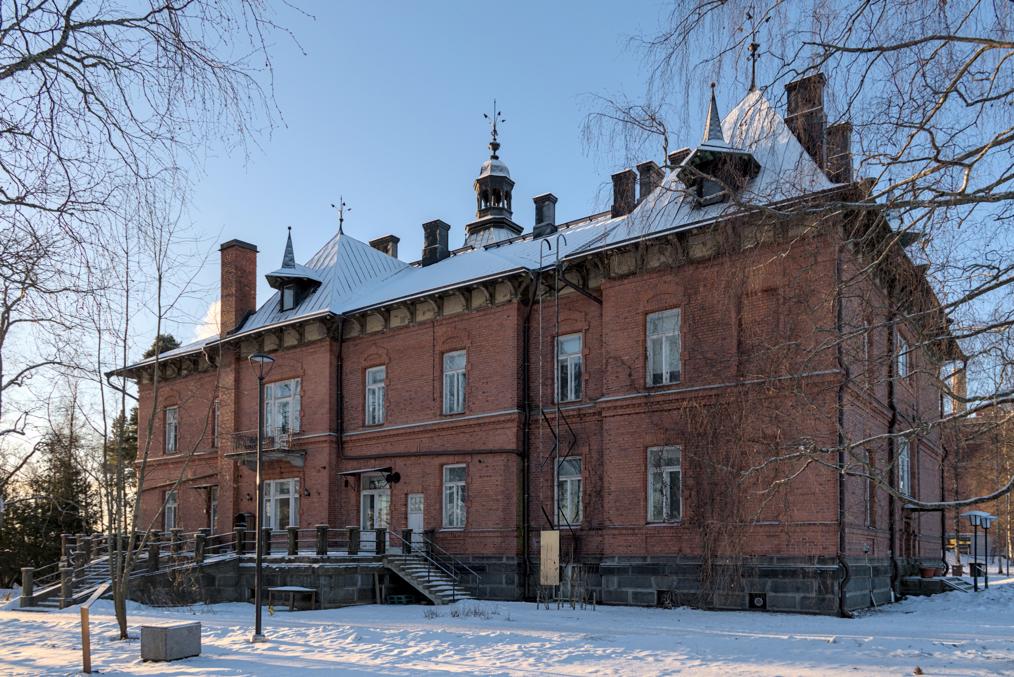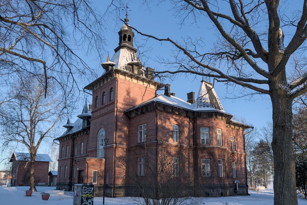 39. Наряду с заводскими зданиями сохранилась и усадьба Лиелахти (Lielahden kartano). Изначальные хозяева усадьбы, фон Ноттбеки (von Nottbeck) — род остзейских немцев, которому с 1836 до 1907 единолично принадлежала знаменитая тамперская текстильная фабрика Finlayson — они владели ей гораздо дольше, чем ее основатель, собственно, шотландец Финлэйсон. Лиелахти фон Ноттбеки купили в 1872, а нынешнее главное здание построено в 1893; его спроектировала Мария Лидия фон Ноттбек, в девичестве фон Тобисен, супруга Вильгельма Фредрика фон Ноттбека (Wilhelm Fredrik von Nottbeck, 1850-1928), последнего владельца Finlayson из фон Ноттбеков. Здесь было довольно серьезное хозяйство, со своим крахмальным заводиком и узкоколейкой. В другой стороне от комбината сохранился фамильный склеп фон Ноттбеков, я не снимал. Во времена комбината в усадьбе, вероятно, размещалась его контора, а сейчас она тоже используется как культурный центр.