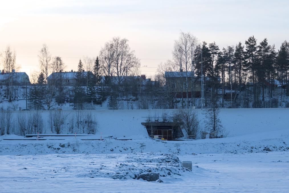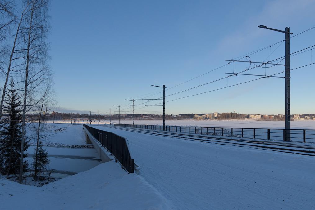 10. Дальше — путепровод над железной дорогой, тоже продолжающейся из Тампере вдоль берега Нясиярви. Здесь пока от станции Тампере идут два ж/д пути, которые расходятся за следующей станцией, Лиелахти (где поезда не останавливаются) — один продолжается на запад на Пори, по долине большой реки Кокемяэнйоки, а другой заворачивает на север, где прямиком через малолюдные болотистые земли идет до следующей узловой станции, в городе Сейняйоки. Путепровод для трамвая требовалось расширить, так что по факту его снесли и перестроили полностью.