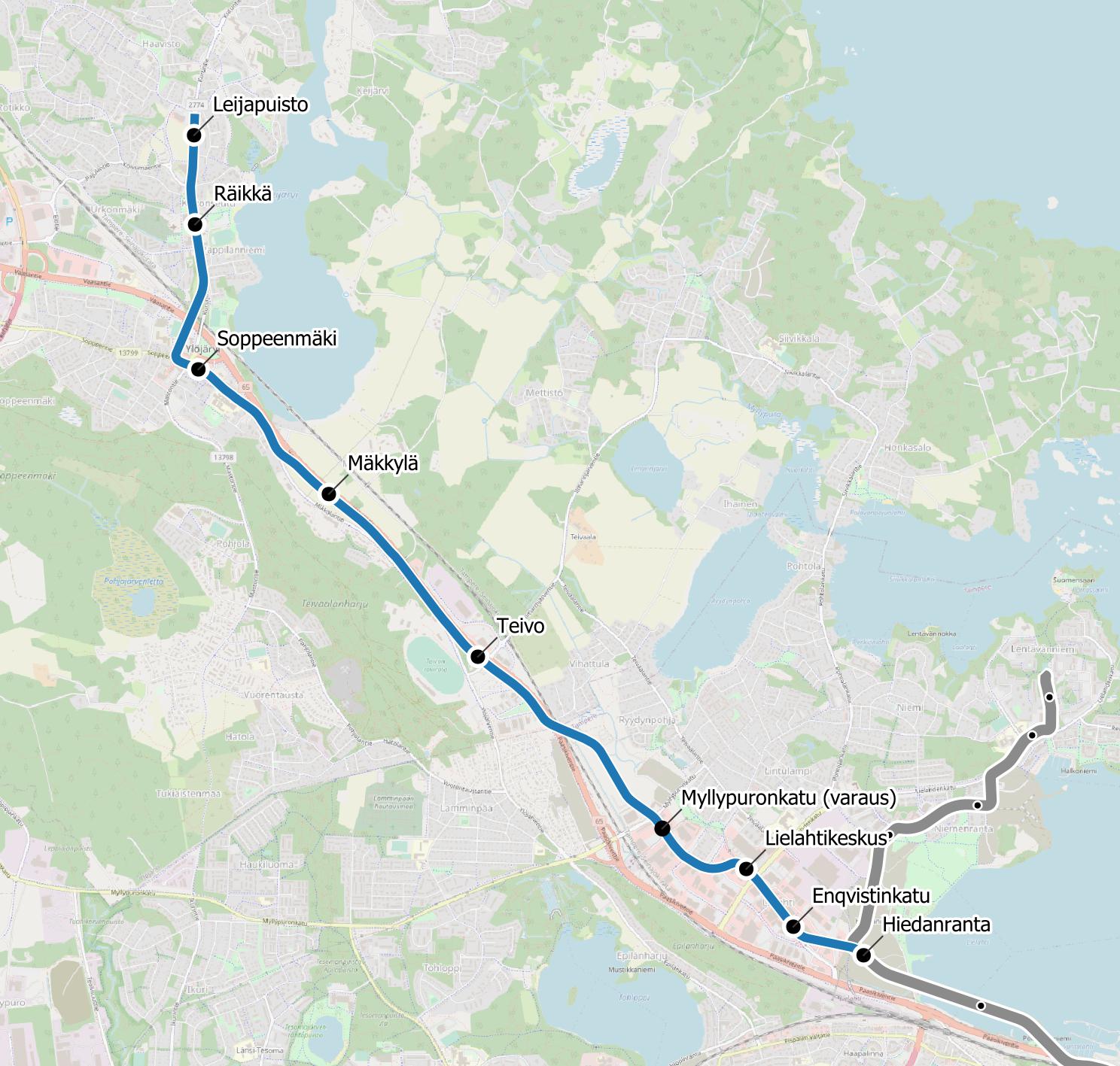 36. Для понимания масштабов. Совсем бросать Лиелахти, справедливости ради, не хотят — от остановки Хиеданранта должна через Лиелахти пойти перспективная линия в пригород Юлёярви. Но это, опять же, надо будет еще дожить, это в 2030-х только будет. Кроме того, из Лентявянниеми до Лиелахти все равно на трамвае можно будет доехать тогда только с пересадкой, скорее всего.