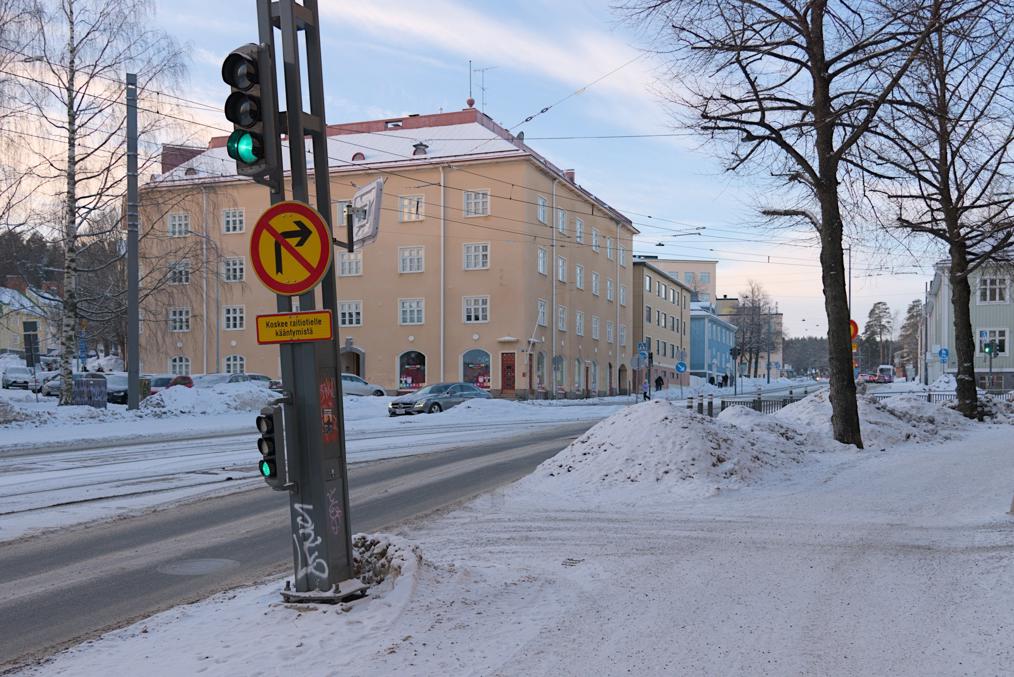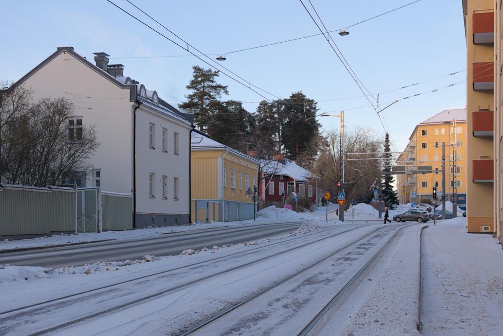 13. Трамвай спускается и плавно заворачивает параллельно железной дороге по улице Паасикиви (Paasikivenkatu), в честь великого послевоенного президента.