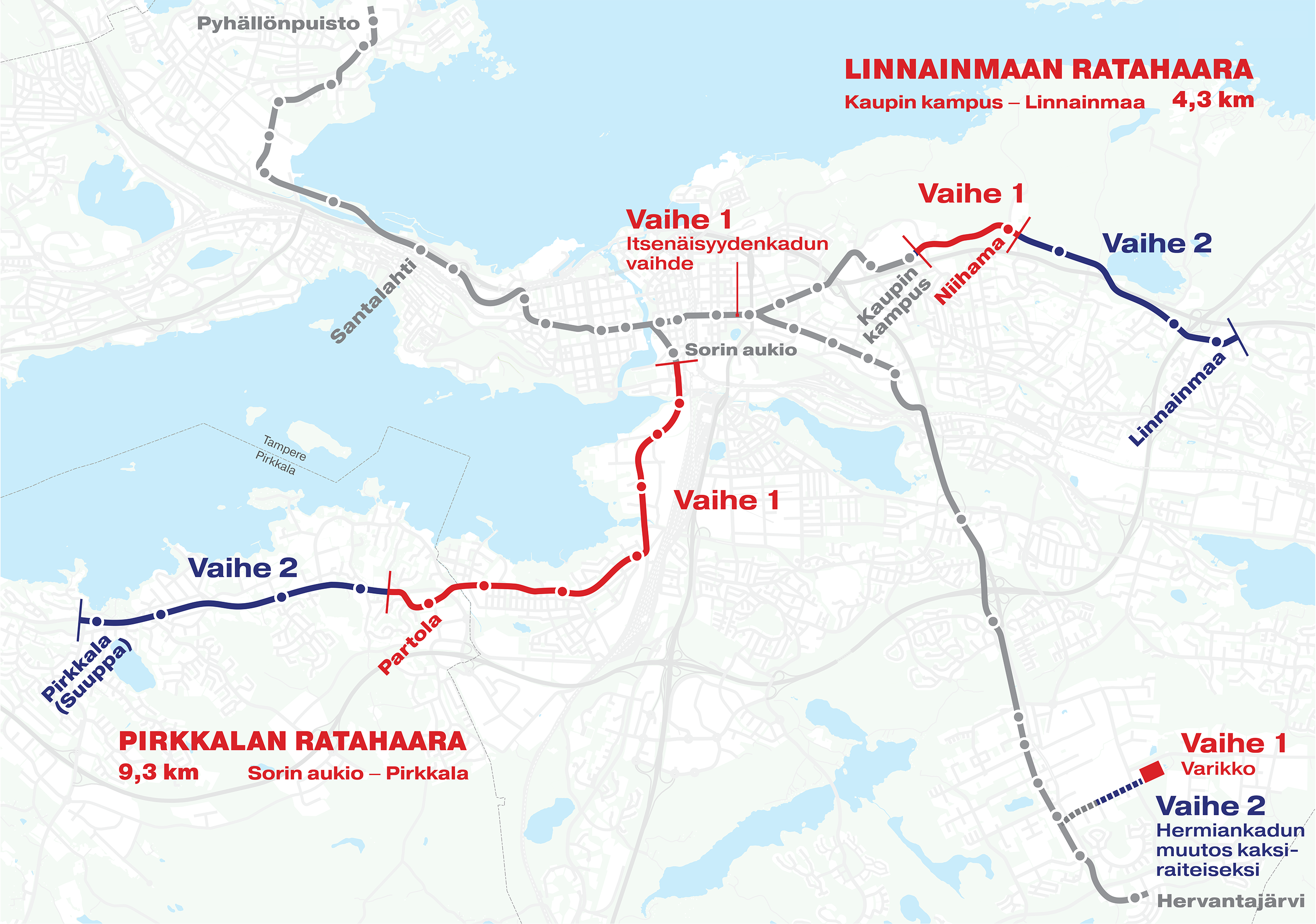Как и в прошлый раз, к строительству следующей очереди трамвая приступили, даже не дожидаясь открытия предыдущей. Третья очередь трамвая предусматривает продление на северо-восток в Линнайнмаа (Linnainmaa), и на юго-запад через Хярмяля (Härmälä) в пригород Пирккала (Pirkkala), в сумме 13.5 км:
