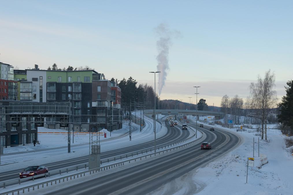 18. Потому что туннель все равно вышел не настолько уж длинный, и в частности новый район Санталахти целиком расположен уже у наземной части трассы. С этим фото с путепровода я чуть забегаю вперед, но тут в принципе видна вся суть Санталахти — новые многоэтажки втиснуты в узенькую полосу между оживленной трассой (и трамваем) и крутым склоном гряды Писпаланхарью, где по верху идет также железная дорога — район имеет в длину километр, но в ширину буквально метров сто. Еще и остатки старых заводов портят пейзаж — сносить их нельзя, но и что-то полезное сделать с ними сложно, так что стоят полузаброшенные, очагами разрухи. В общем, на мой взгляд, один из самых неудачных новых районов в Тампере и окрестностях. Ну, живут и тут люди, конечно, наверняка даже совсем не дешевое место, новое-то всегда дорого, да и виды на озеро хорошие из квартир с северной стороны.
