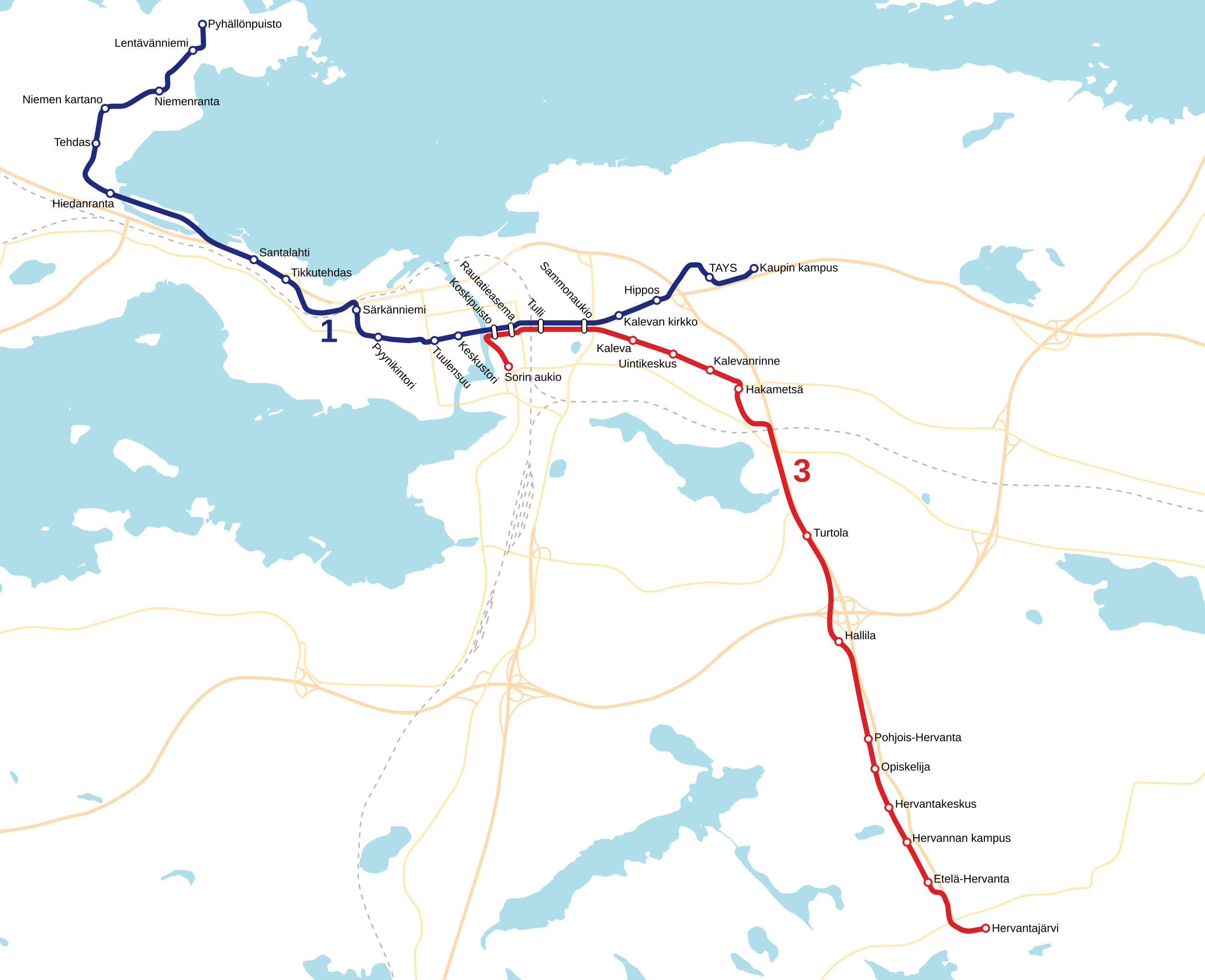 После открытия первого участка второй очереди трамвая, до Санталахти, конечные маршрутов поменяли местами; трамвай 1, от больницы TAYS, перенаправили с автовокзала (Соринская площадь, Sorin aukio) через центральную площадь на запад на новую конечную, а трамвай 3, из Херванты, который раньше ходил до предыдущей западной конечной Пююникинтори, соответственно, отправили на автовокзал. Это обосновали как раз тем, чтобы для трамвая 3 из Херванты можно было сделать укороченный интервал; в то время как новое западное направление ожидается менее загруженным, чем хервантское, и туда можно было бы отправить трамвай 1 с чуть более длинным интервалом.