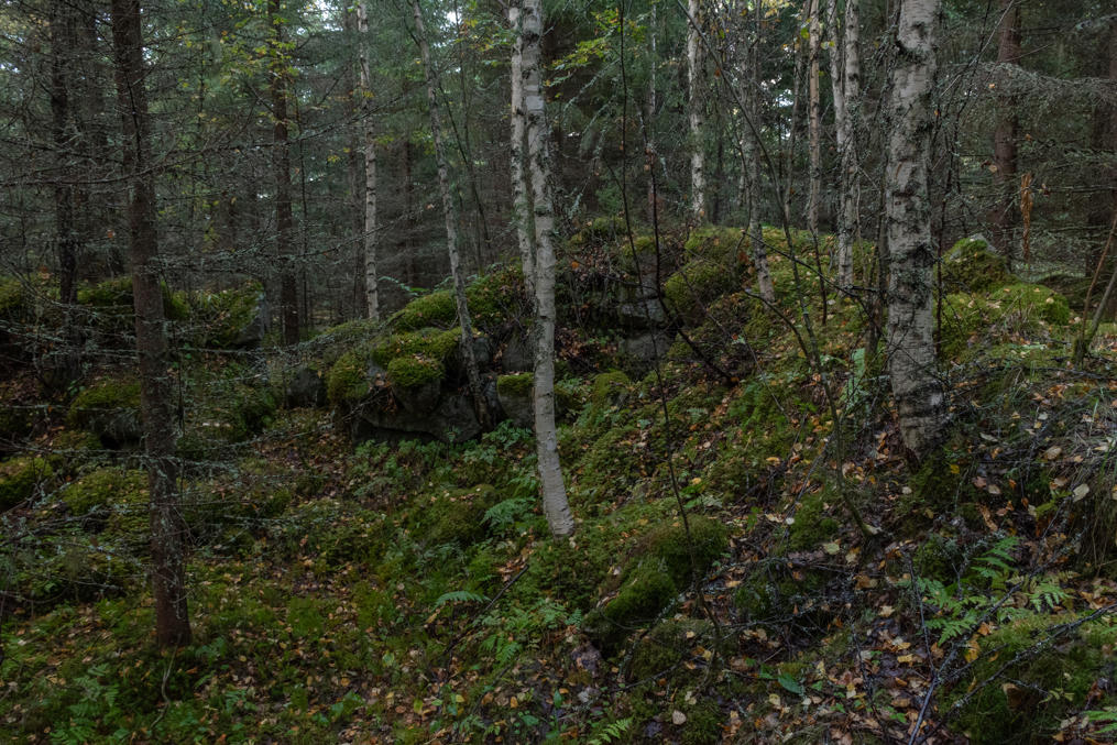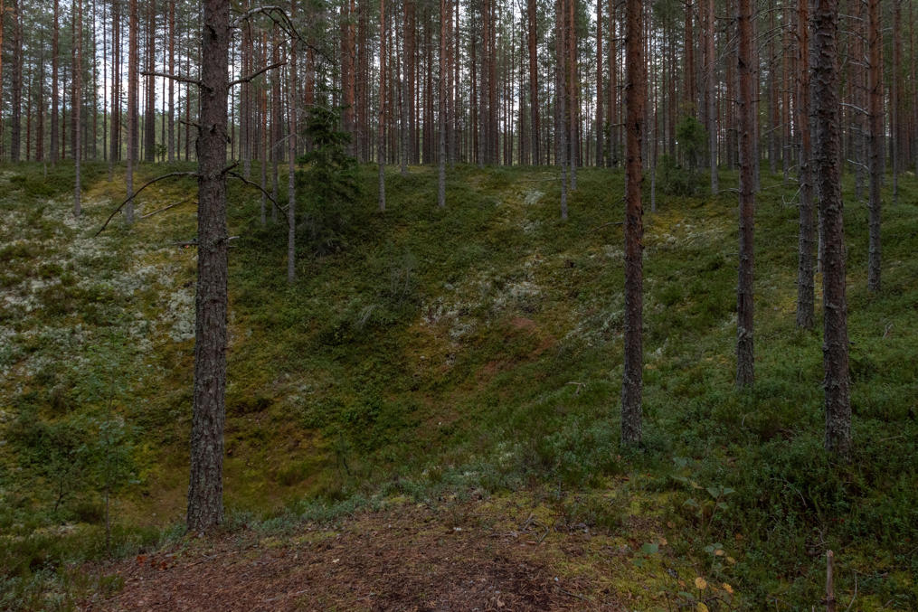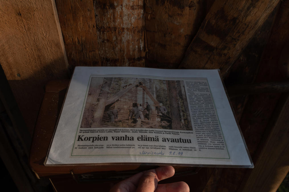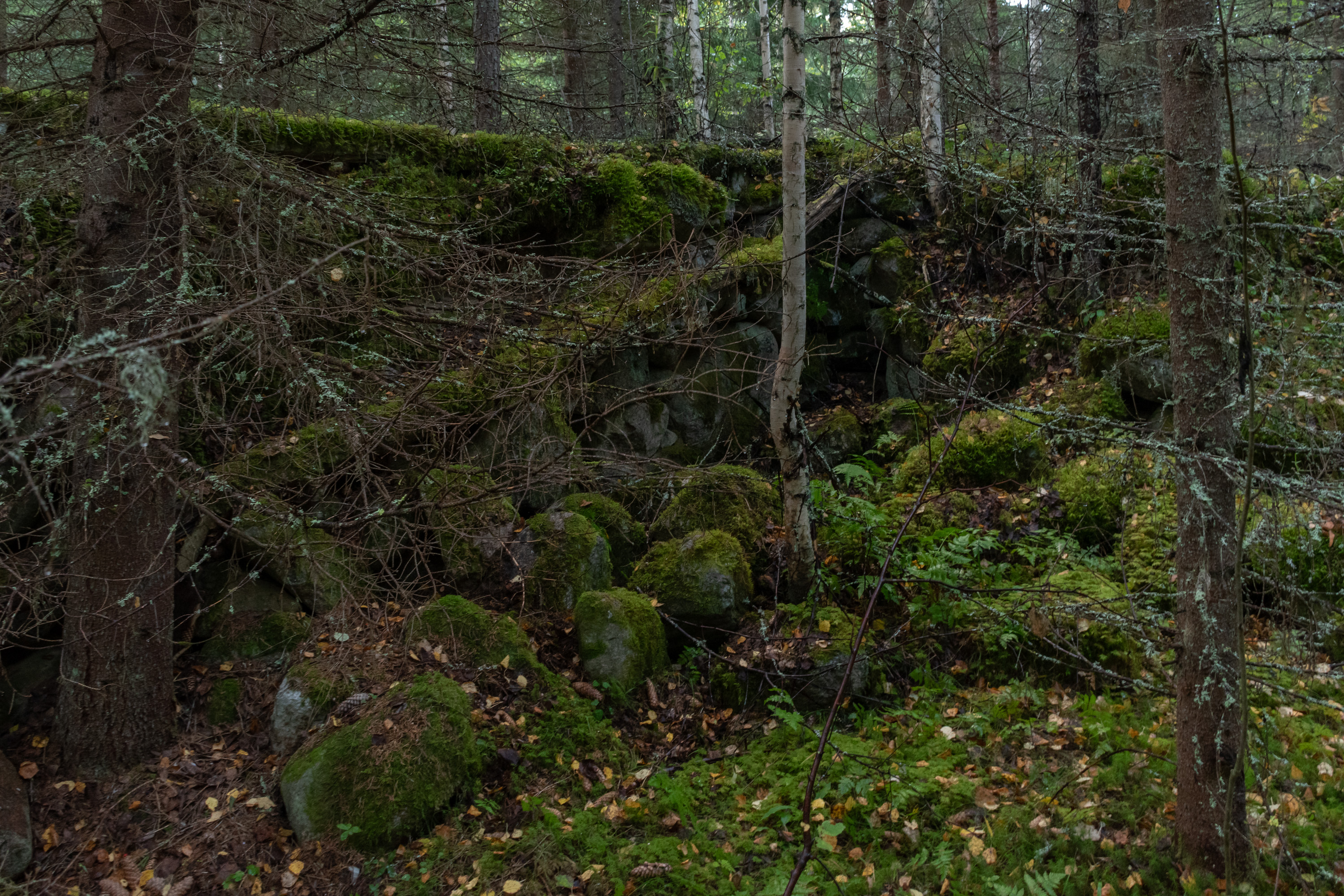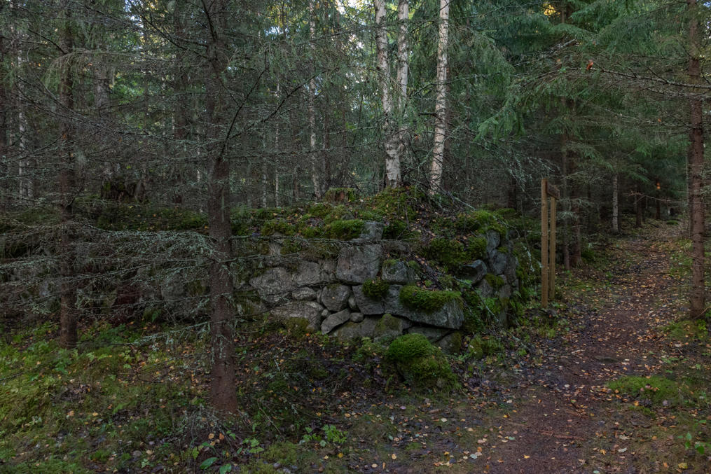 20. Невдалеке от хижины у тропы стоят виднеющиеся из-под мха руины. Здесь и жил Херманни Кайпайнен (Hermanni Kaipainen, 1844-1917), в честь которого названа тропа. Что это был за человек и почму он жил тут, относительно далеко от дорог и другого жилья — не знаю, в той вырезке из газеты упоминается лишь, что был известный балагур и любитель рассказывать байки.