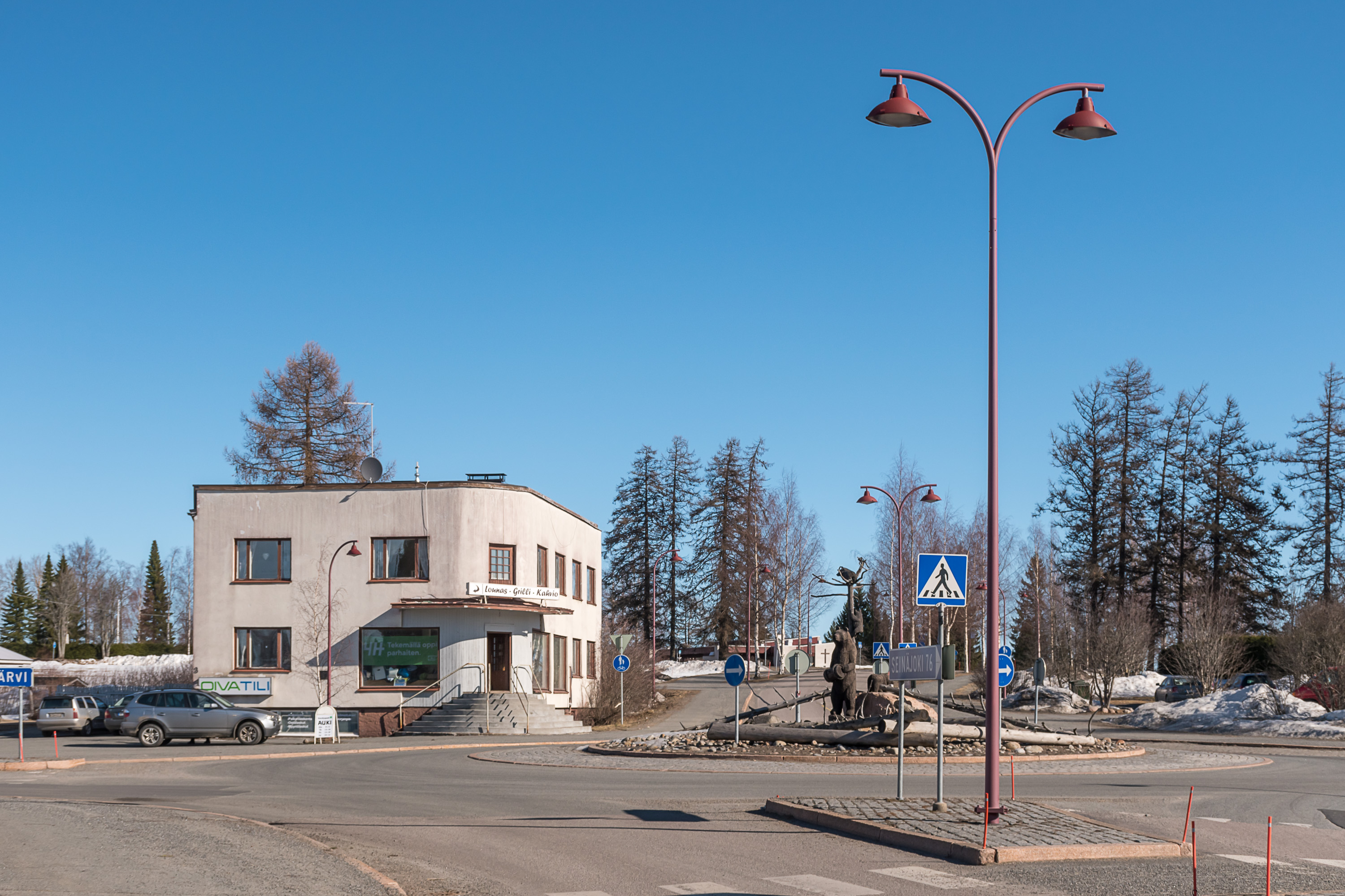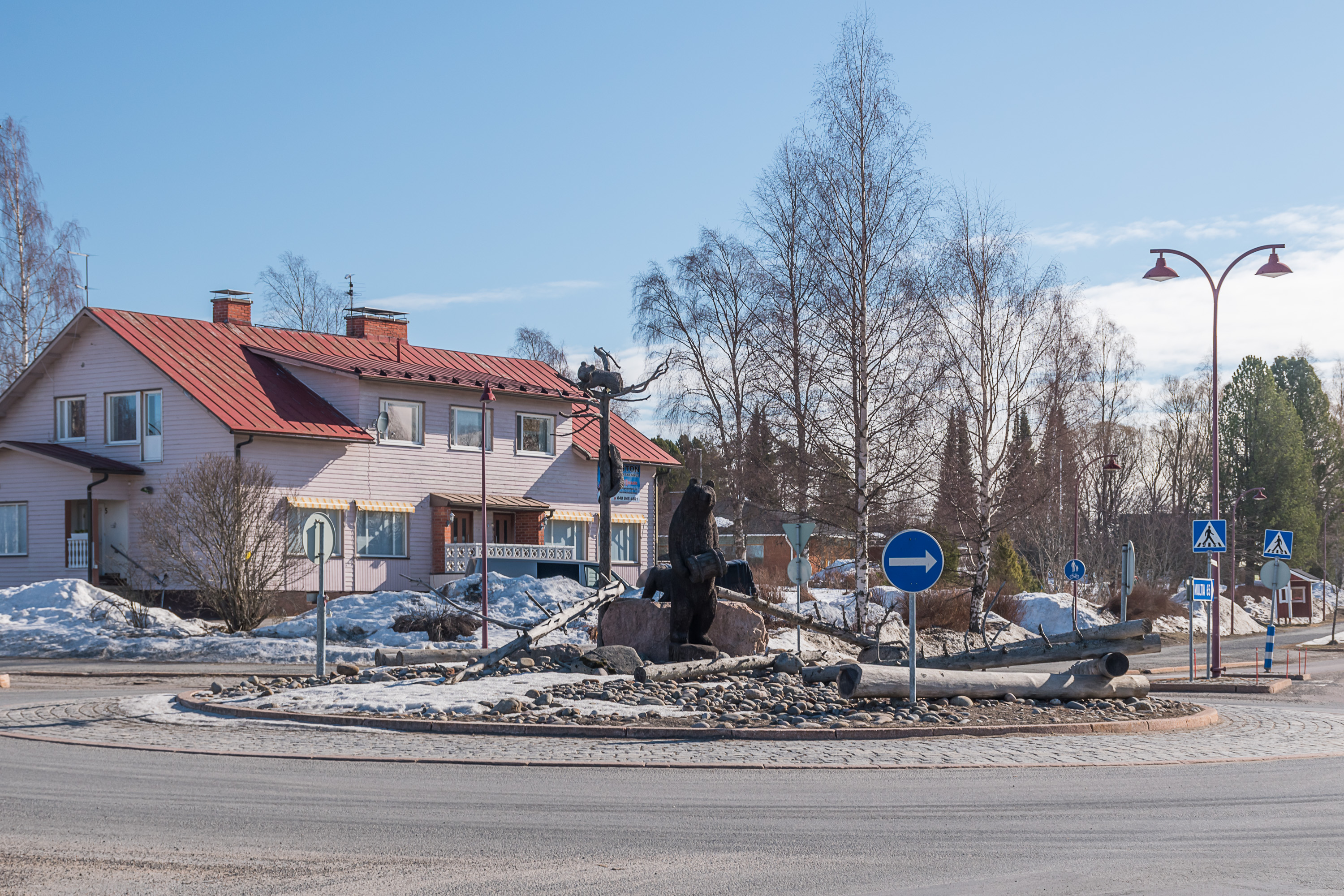 5. Ну а так, конечно, в селе ничего особенного. На главном перекрестке — на Лехтимяки и далее Сейняйоки, Алаярви, Карстулу и Мультию — стоит вырезанная из дерева медведица с медвежатами. Если присмотреться, в лапах медведица держит бочку дегтя.