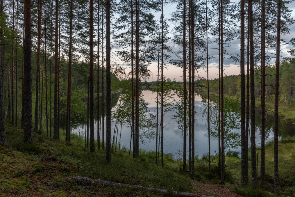 23. Время клонится к закату. Болото в дальней части тропы — почти полностью заболоченное мелкое озерцо Исо-Куркилампи (Iso Kurkilampi, фин. Большой Журавлиный пруд). Если дальше повернуть на юг на Арпайненский маршрут, то вскоре будет большое Червивое болото, Матосуо (Matosuo).