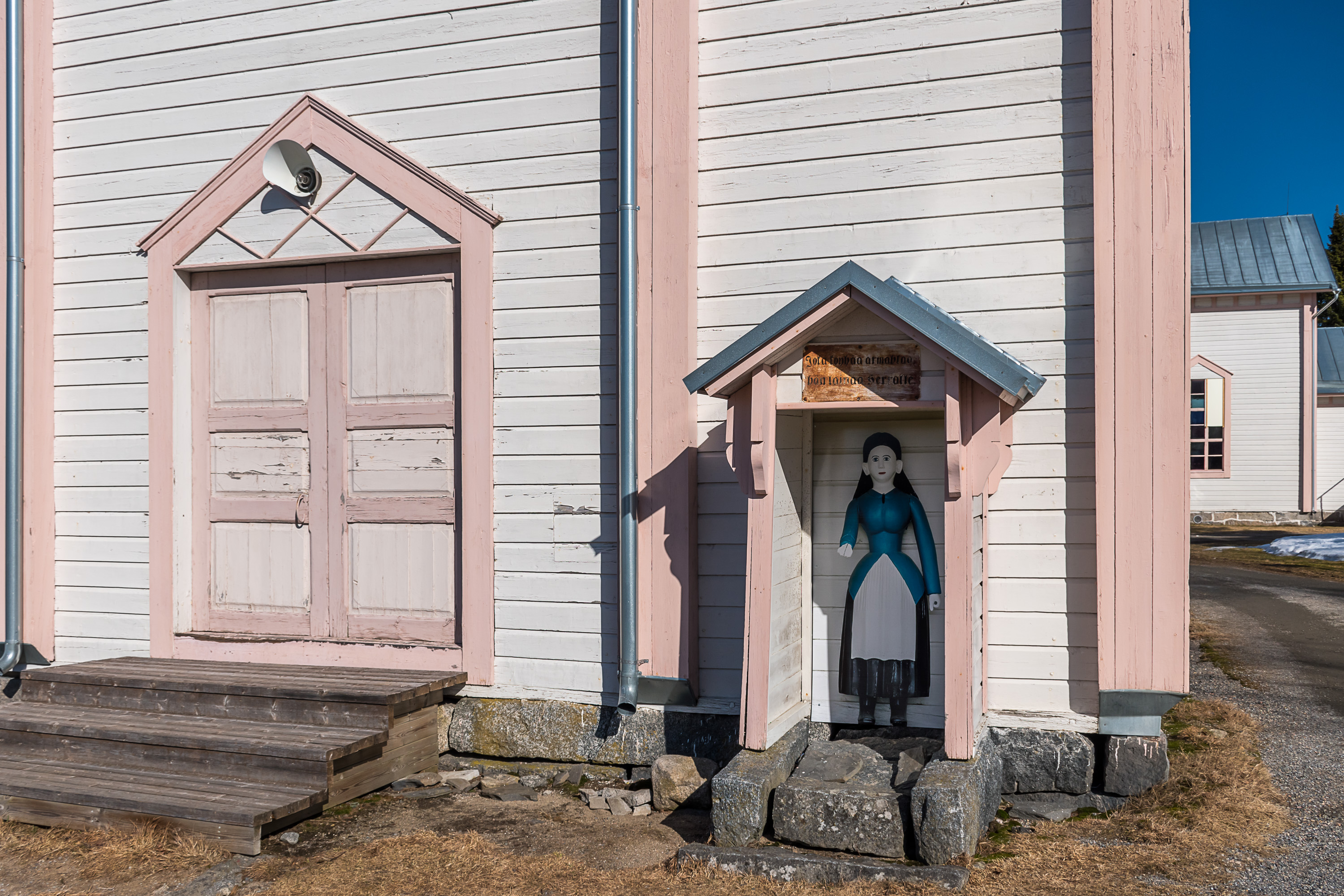 2. А церковь интересна в первую очередь статуей для сбора пожертвований. Такие статуи нищих с прорезью в груди, vaivaisukko, буквально "убогий дед", широко распространены в Финляндии в первую очередь в Остроботнии, всего известно около 145; у меня был короткий старый пост про такие статуи, я их показывал в постах об Илмайоки и Пауканеве и селе Нурмо. Статуи, довольно незамысловато, но душевно вырезанные из дерева и раскрашенные, на самом деле не выглядят уж особо убогими; нищих изображали прилично одетыми, особо и не поймешь, что это нищий, разве что часто попадался мотив ветерана-инвалида с деревянной ногой.