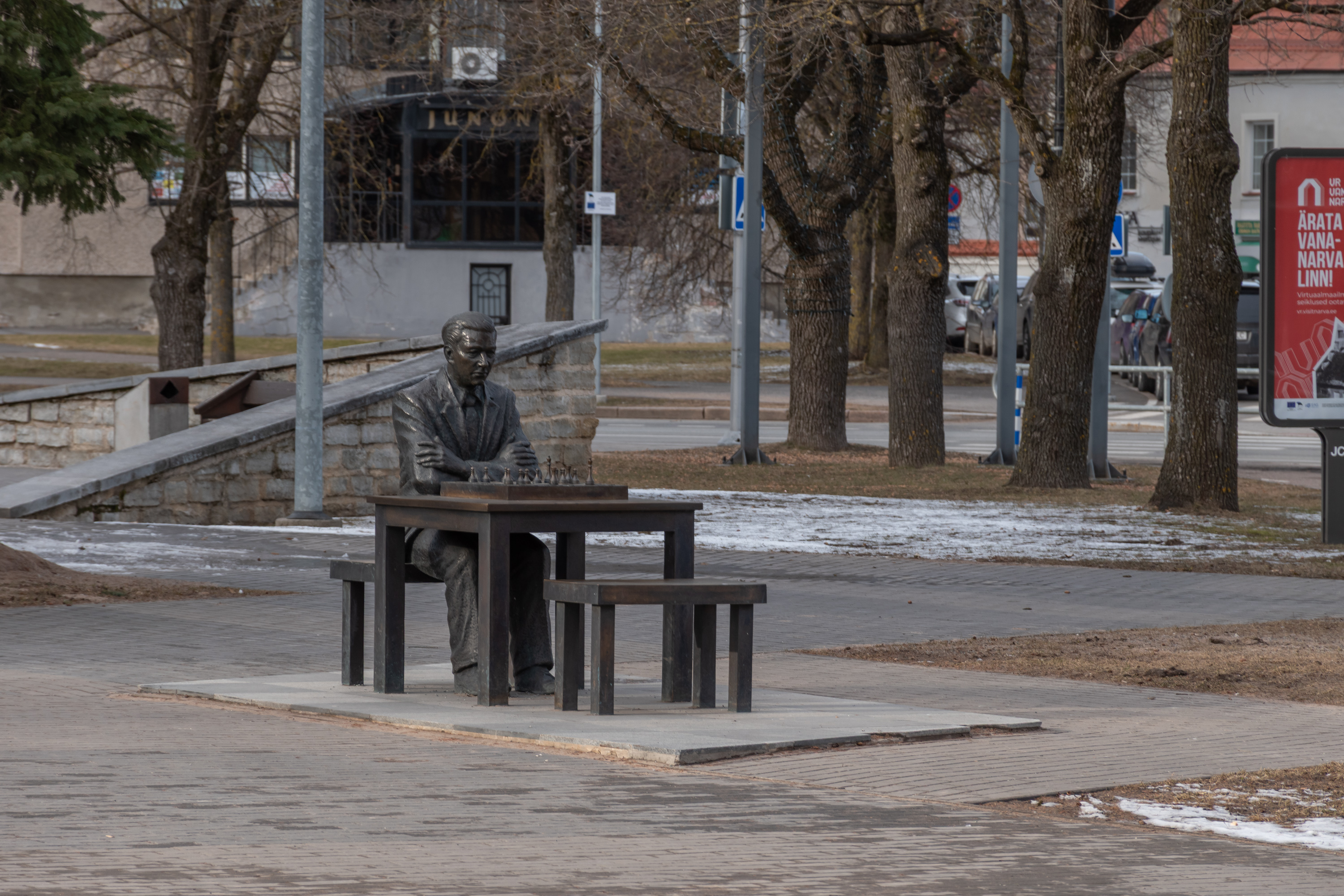 40. На фоне многоэтажки с баком водонапорной башни на крыше, тоже хорошо видной из самого Ивангорода, стоит в сквере памятник шахматисту. Это Пауль Керес (Paul Keres, 1916-1975), один из известнейших уроженцев Нарвы 20 века, великий гроссмейстер; его на обороте той банкноты в 5 крон даже рисовали.
