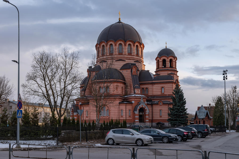 83. Уже недалеко от вокзала — Воскресенский собор, главная православная церковь Нарвы. Тоже для работников Кренгольмской мануфактуры построен в 1896 и тоже, как и находящаяся не очень далеко от него Александровская церковь, дожил-таки до наших дней. В Питере, кажется, очень похожая церковь есть, но уже не припомню, которая и где. К сожалению, попробовать зайти уже не успевали.