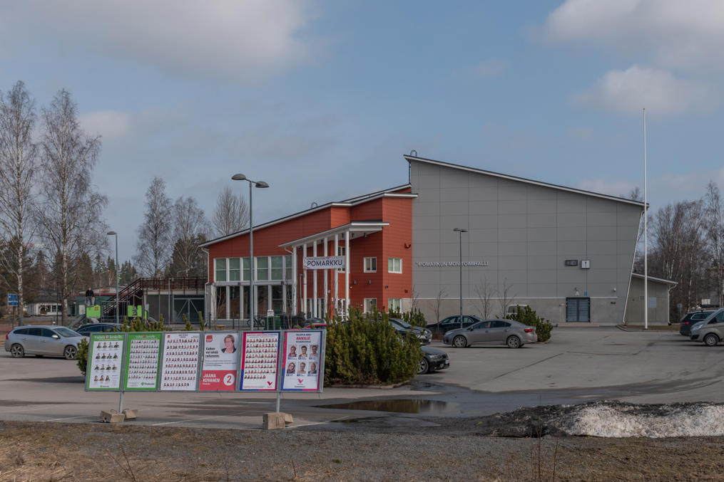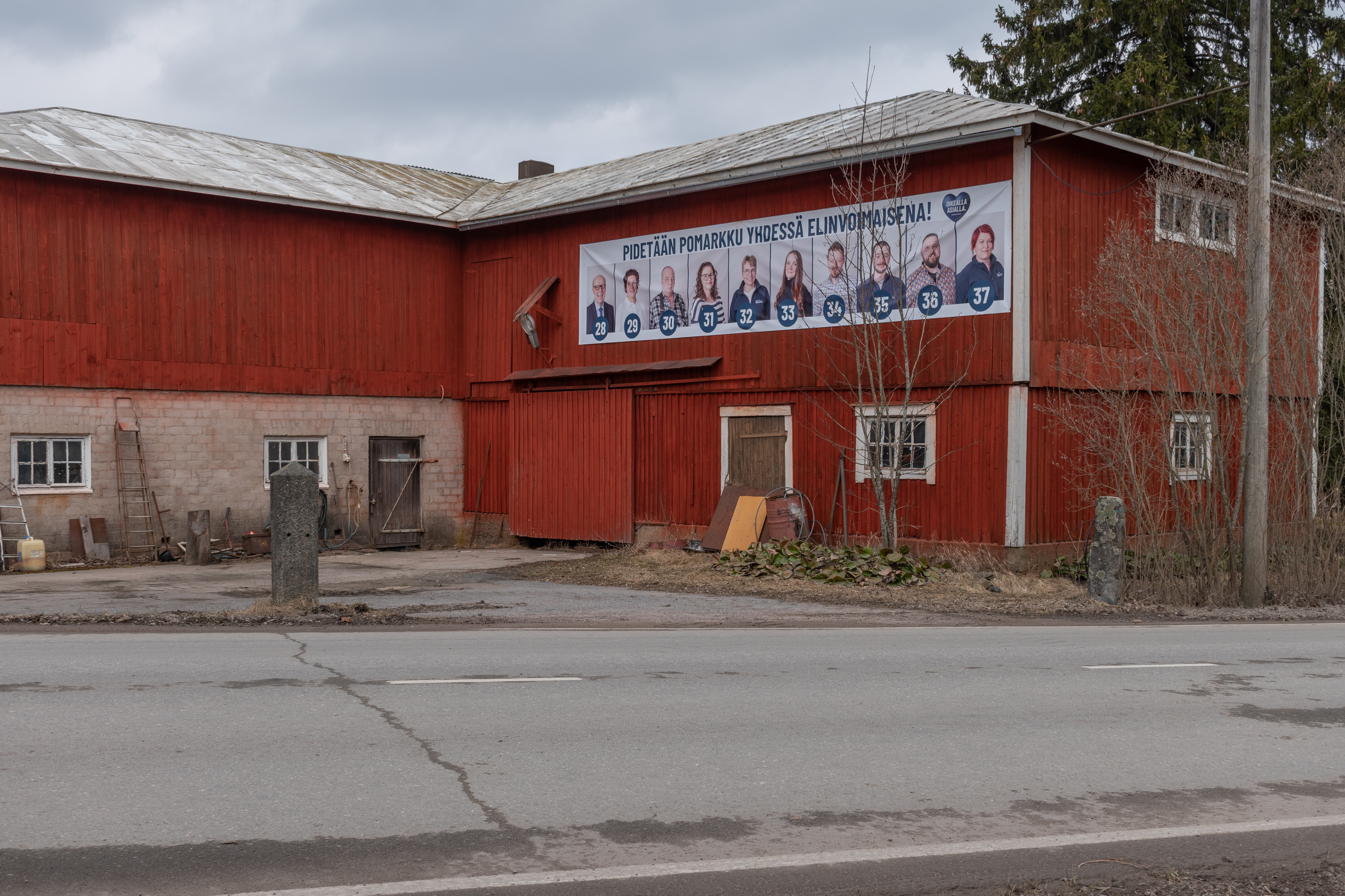 11. В апреле 2025 у нас муниципальные и региональные выборы, и традиционно везде все завешано предвыборными плакатами с номерами кандидатов, хотя не очень понятно, в чем смысл такой агитации — в данном случае ни имен нет, ни партия даже (Коалиционная, Kokoomus, основная правая партия страны) прямым текстом не подписана. Но главное, лозунг на месте: "Сохраним Помаркку жизнеспособным вместе!" Elinvoimainen — "крепкий, здоровый, жизнеспособный" — самый главный эпитет, который в муниципальной политике любят применять особенно к мелким и на самом-то деле как раз уже вымирающим потихоньку муниципалитетам. Население Помаркку с 1980 упало на треть (с 3 тыс. до менее 2 тыс.), но все-таки, будучи на более благополучном западе страны и не очень далеко от регионального центра (и с хорошей дорогой туда), это не самое уж тухлое место.