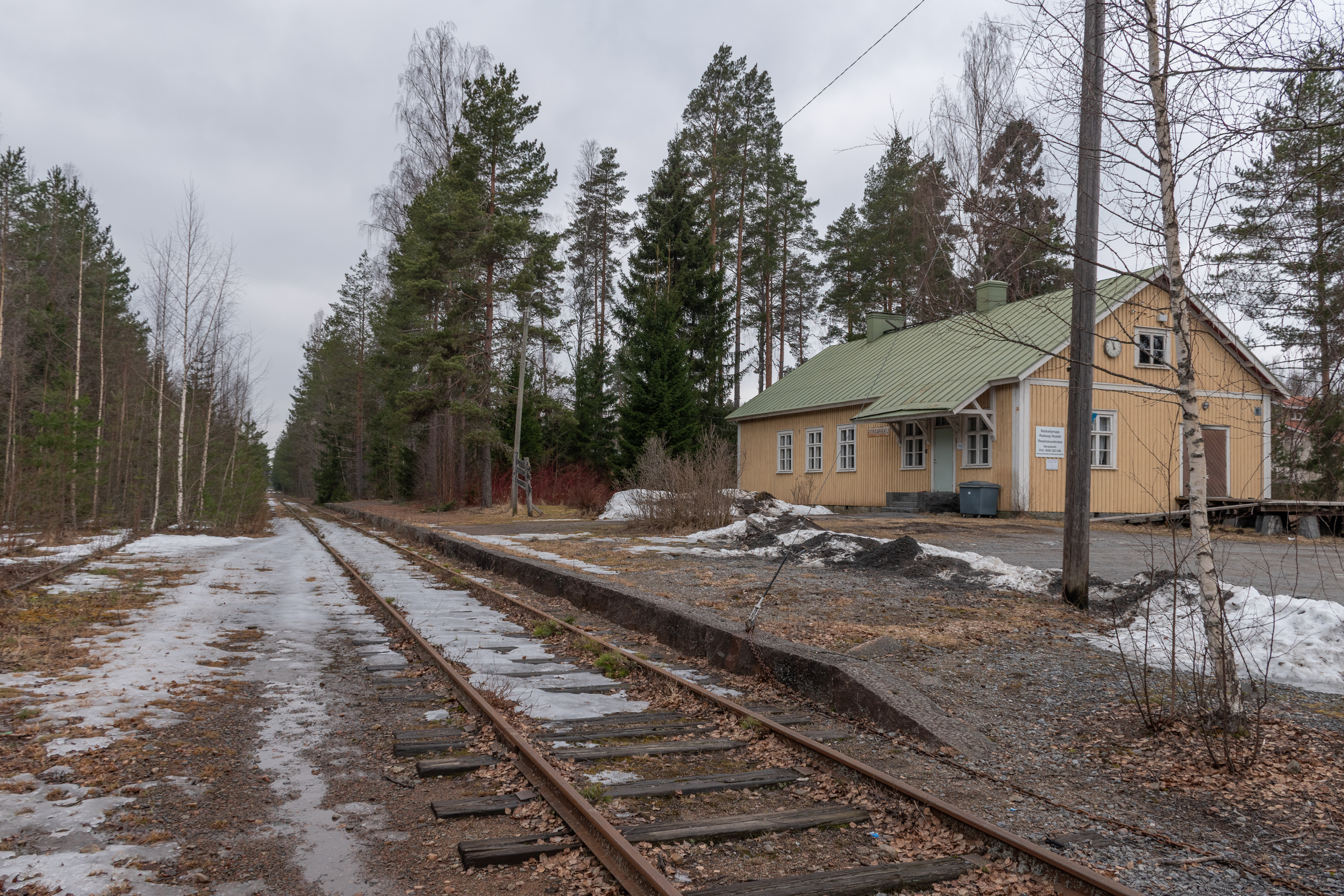 17. В противоположном же конце села располагается бывшая ж/д ст. Помаркку. Станция стояла на линии Пори-Хаапамяки[-Ювяскюля], самой большой ныне заброшенной железной дороге Финляндии, 194 км; лишь пара ее коротких участков — в пределах Пори и к военному полигону Ниинисало от ст. Паркано — еще действуют. Конкретно этот участок открылся в 1933 и закрылся в 1985 (пассажирское движение в 1981); трассировка с самого начала оказалась неудачной, возить было особенно нечего. Переезды и некоторые участки разобраны, но в основном ржавые рельсы так и лежат, и местами сохранились вокзалы. Вокзалов, впрочем, в 1930-х уже интересных не строили, как видно на примере этого, они выглядят чисто утилитарно.