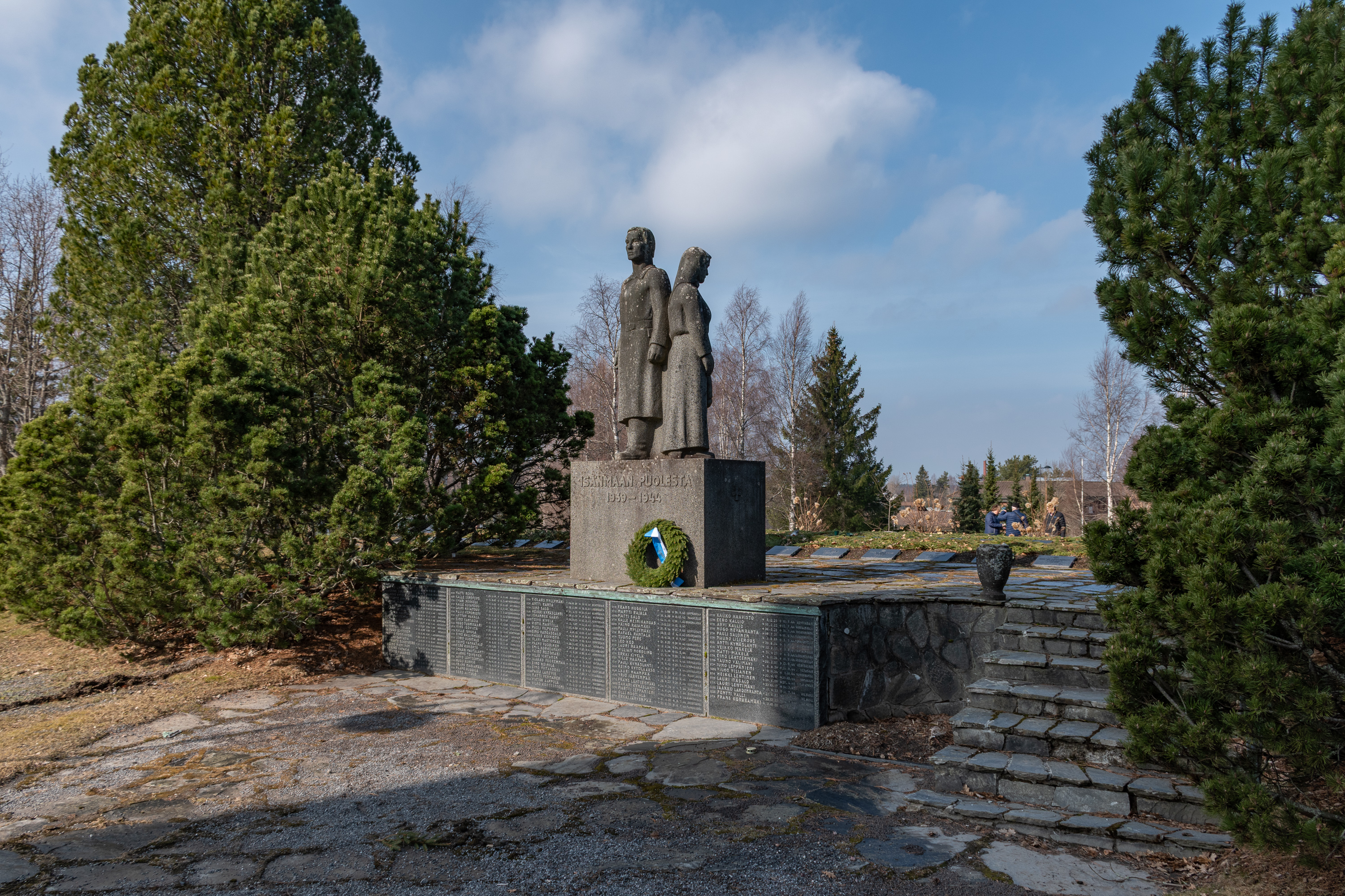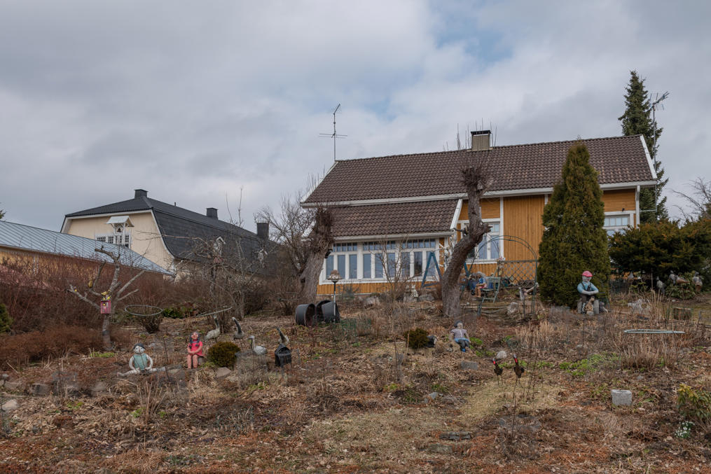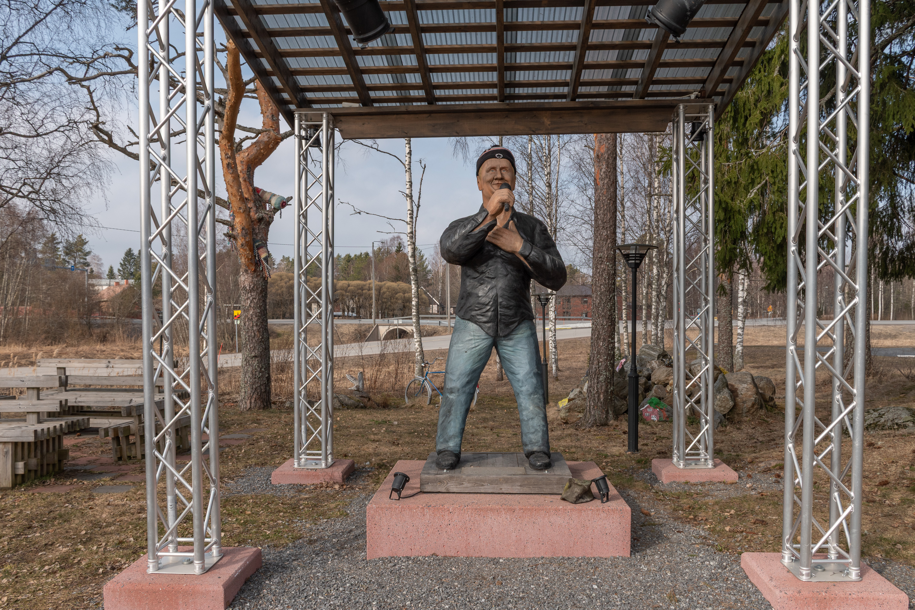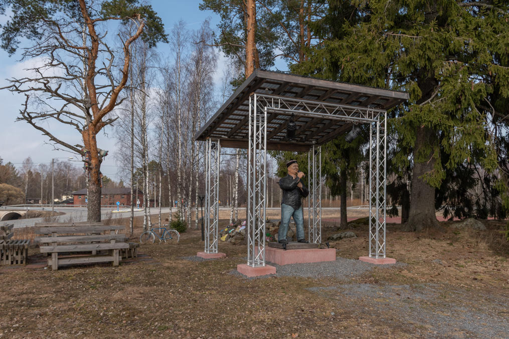 15. В скверике рядом стоит памятник Путину Олли Линдхольму (Olli Lindholm, 1964-2019), бессменному, в 1981-2019, солисту известной финской рок-группы Yö (фин. Ночь). Памятник выпилен из дерева бензопилой, мастером Уллой Хаглунд из Недерветиля в шведоязычной Остроботнии, в 2022; внезапо скончавшийся от разрыва аорты музыкант корнями своими происходил из Помаркку и похоронен здесь. А жил в Пори, и на голове у него шапка с пиковой мастью — в честь местной хоккейной команды Porin Ässät (фин. Поринские Тузы).