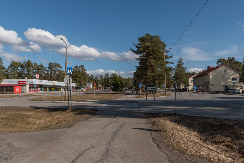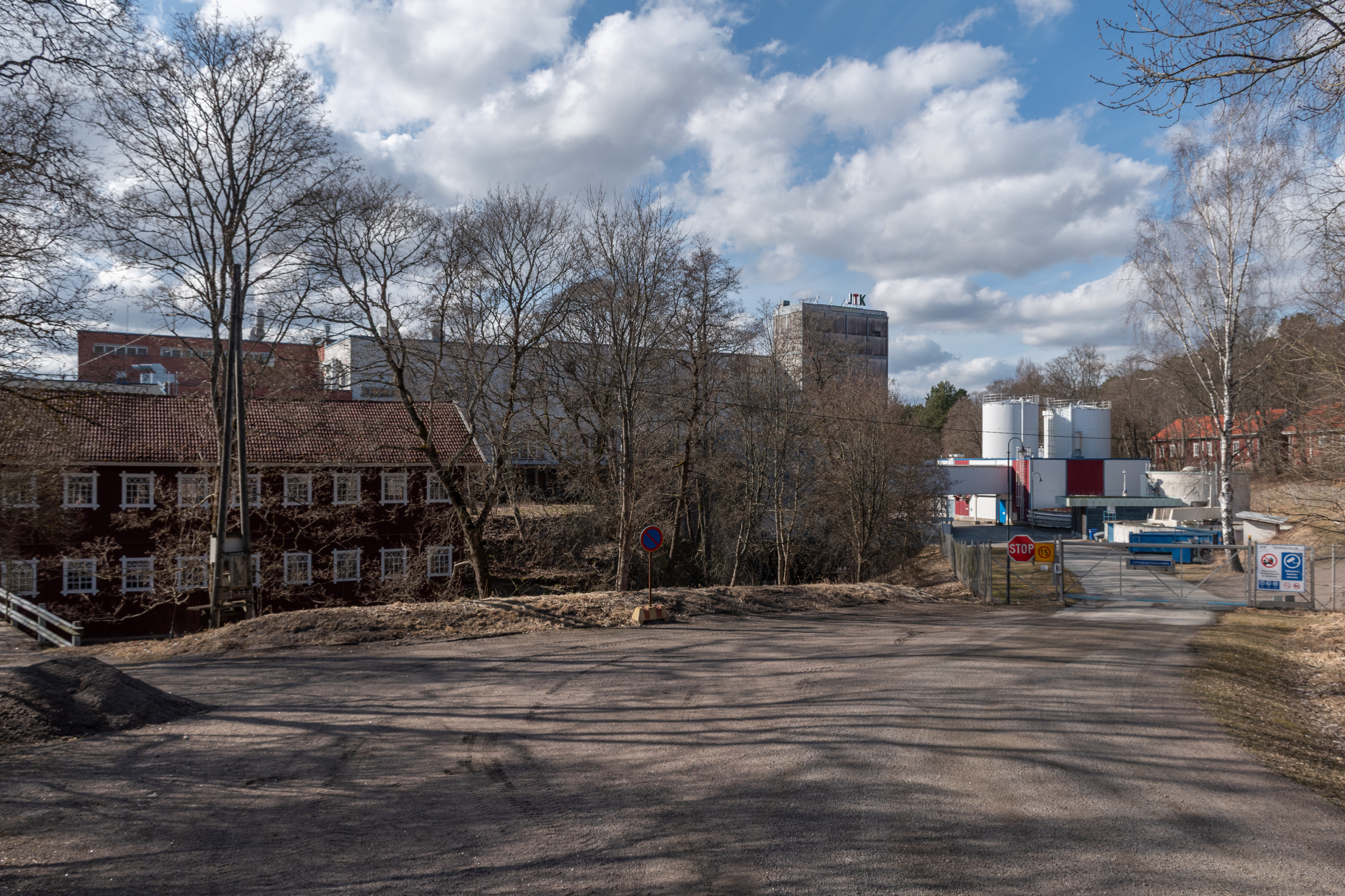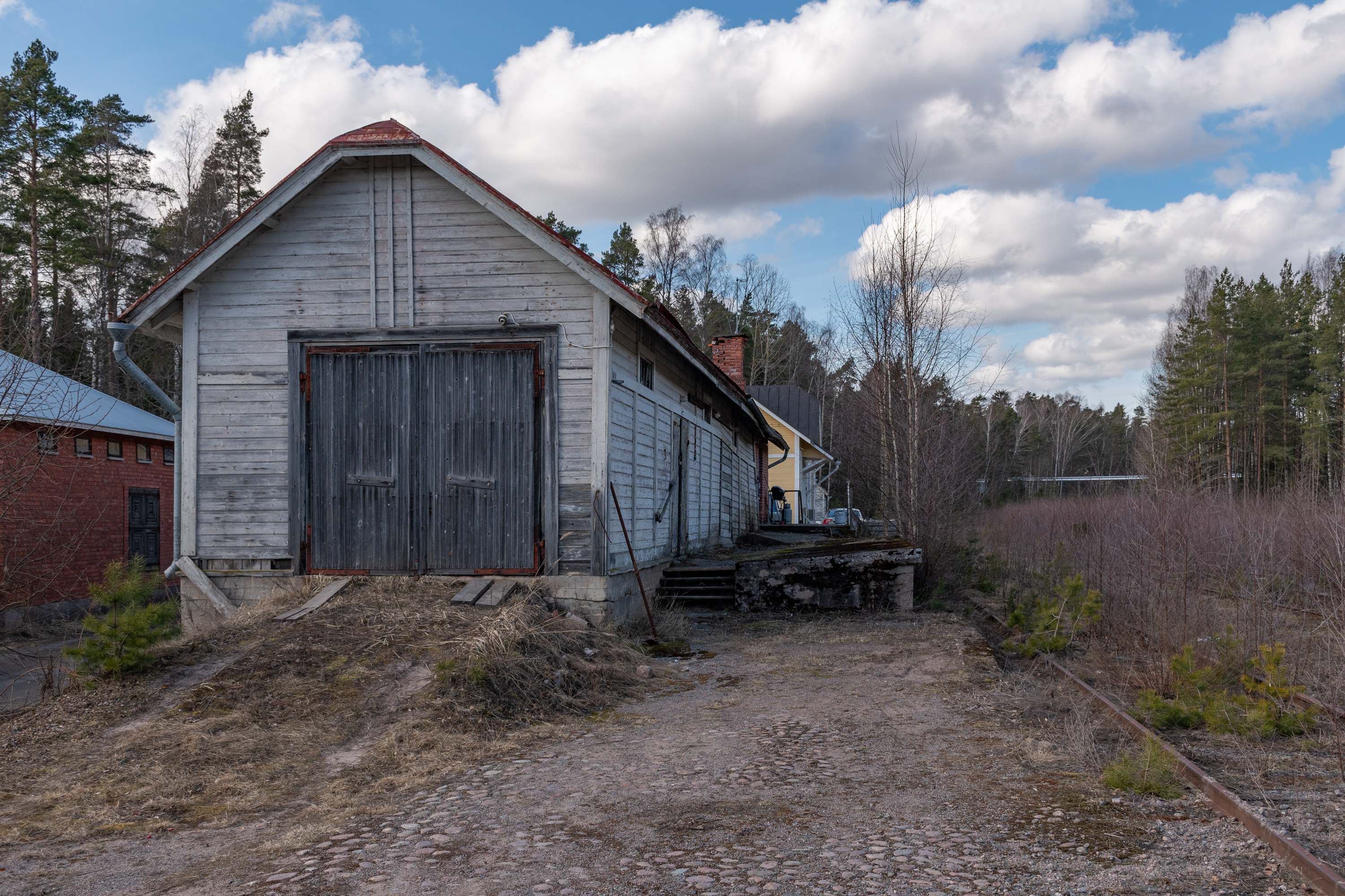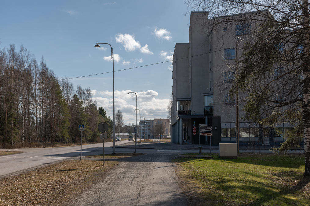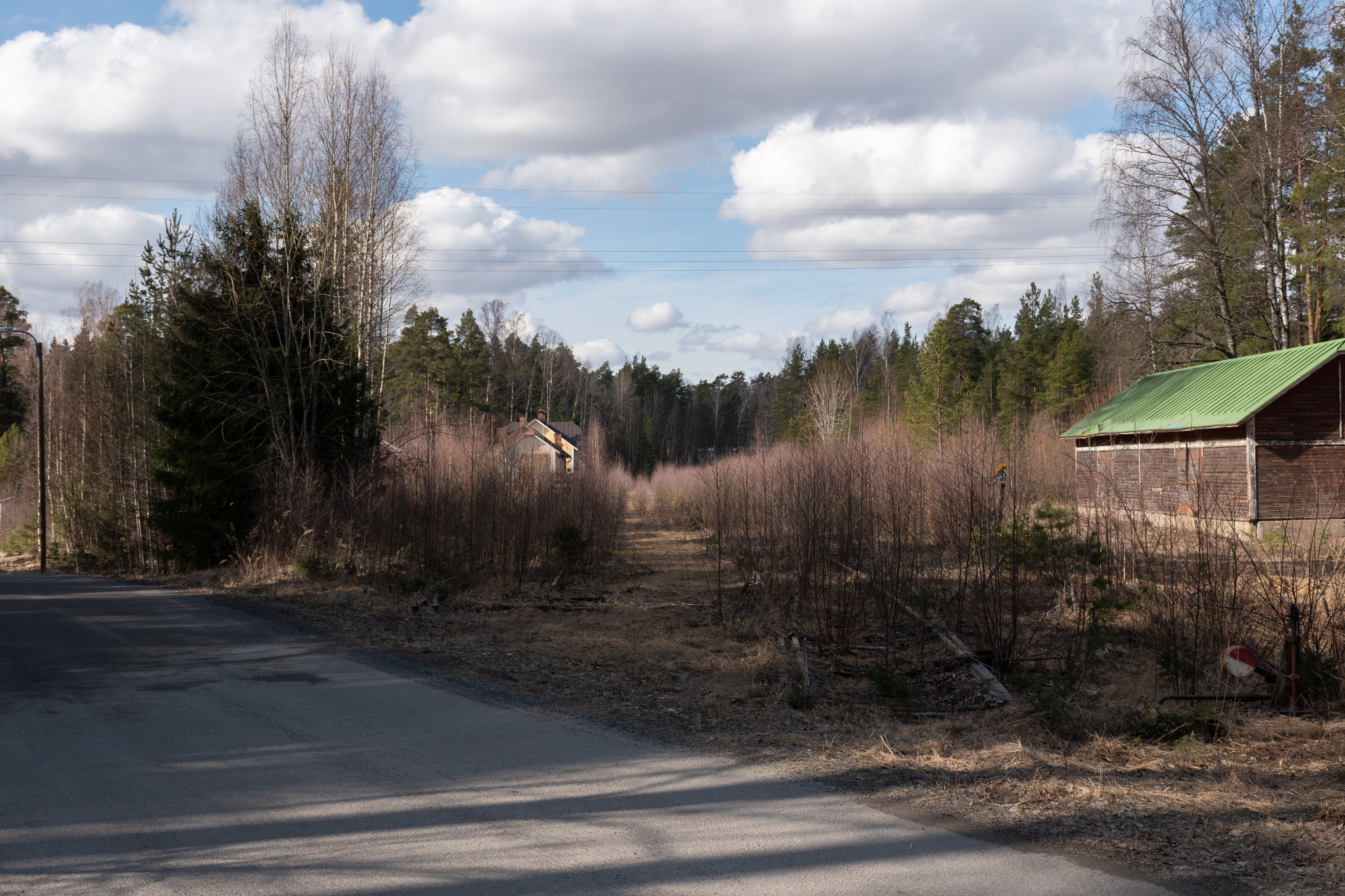 По другую сторону от этой улицы идет заброшенная железная дорога, а за ней — другой завод, машиностроительный, Kone-Tuomi. Раньше еще был производитель упаковки Amcor Flexibles, на OpenStreetMap до сих пор отмечен, но он закрылся в 2019 (минус 127 работников). На заборе промзоны неожиданно обнаружились также таблички "военная территория", так что снимать ее или железную дорогу я не стал, да там ничего и не было интересного. Интересно, почему военная? Этот Kone-Tuomi что-то для военных строит, или, может, было еще раньше что-то, а таблички просто не сняли? Нагуглить не удалось.