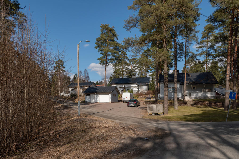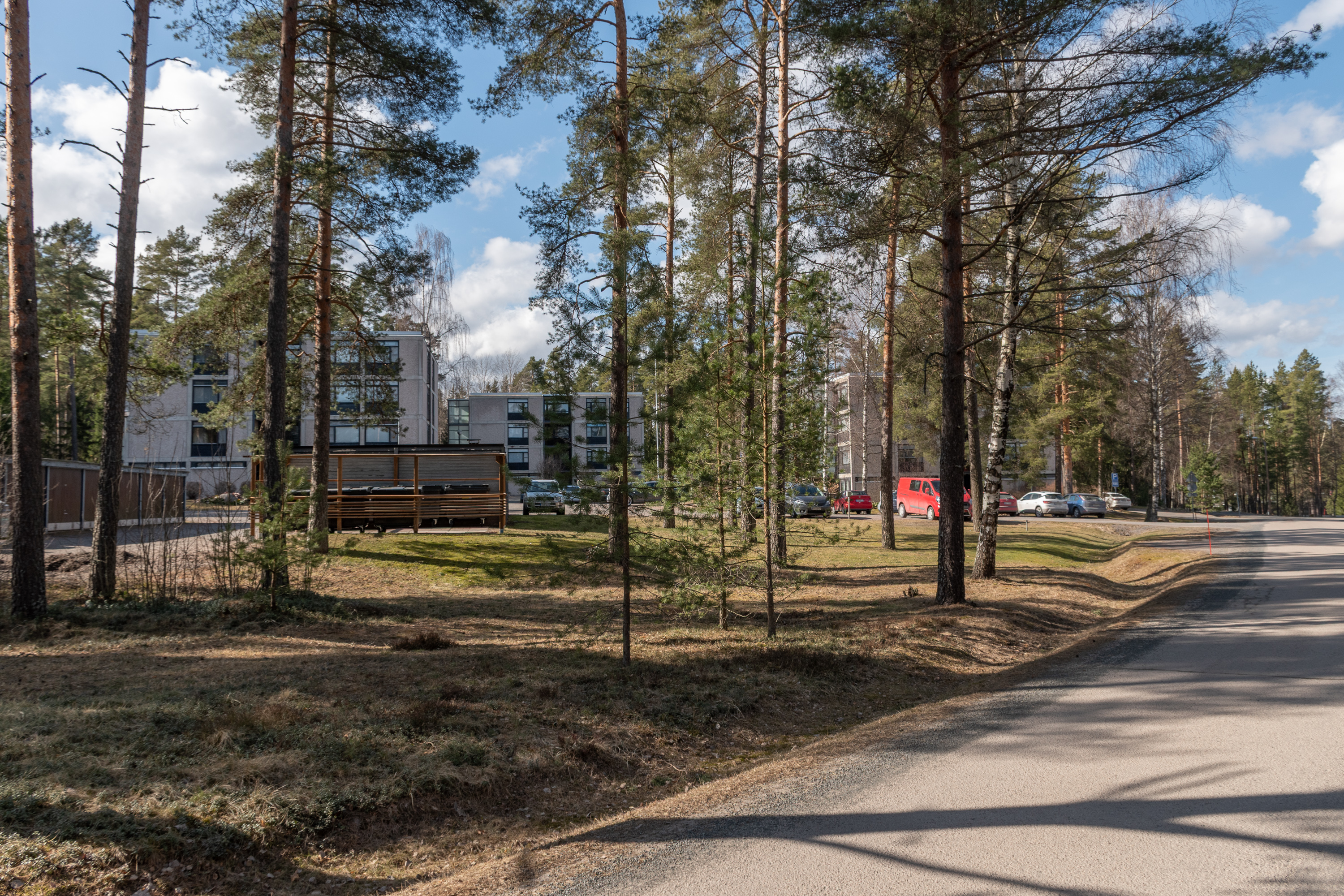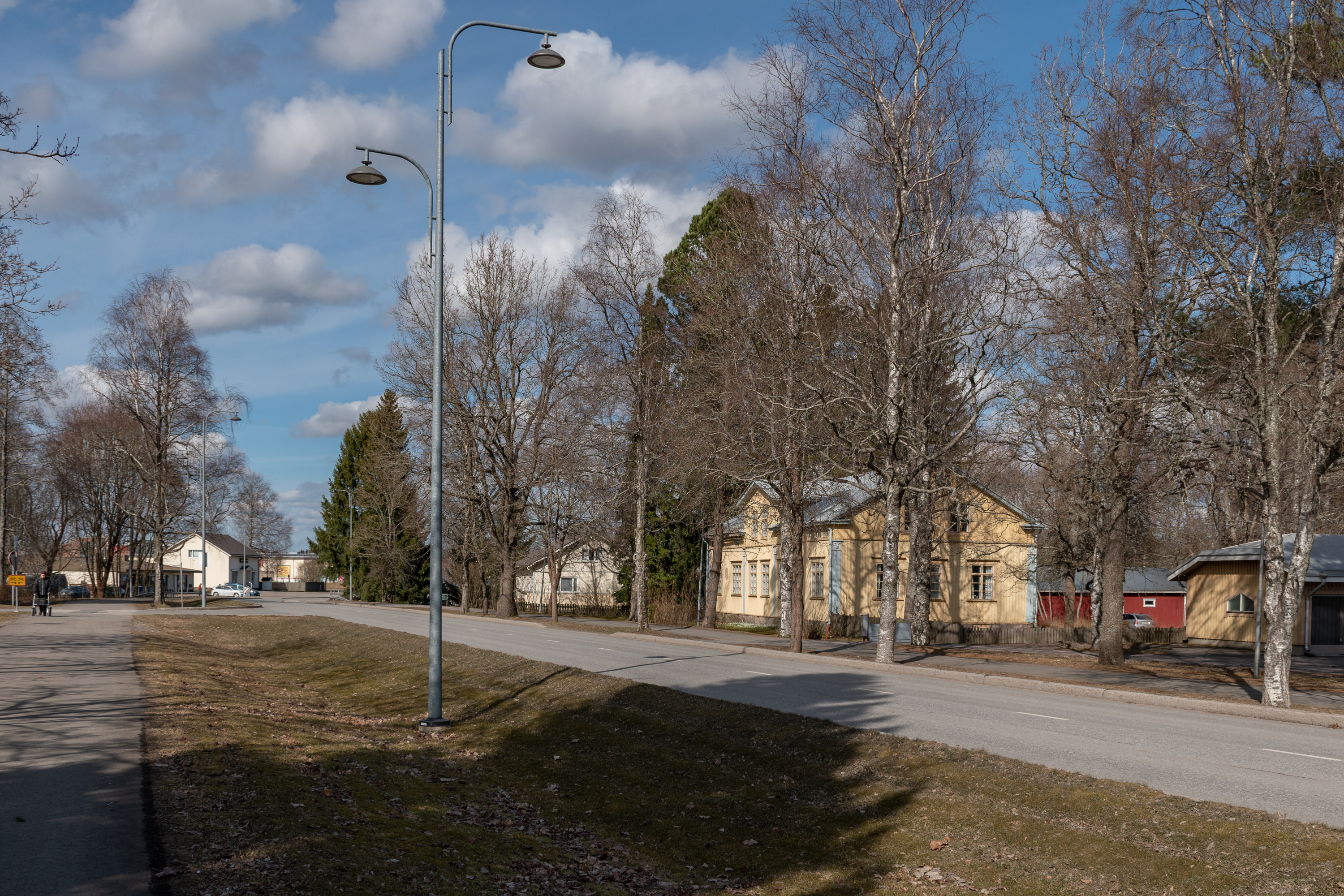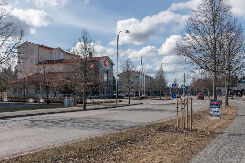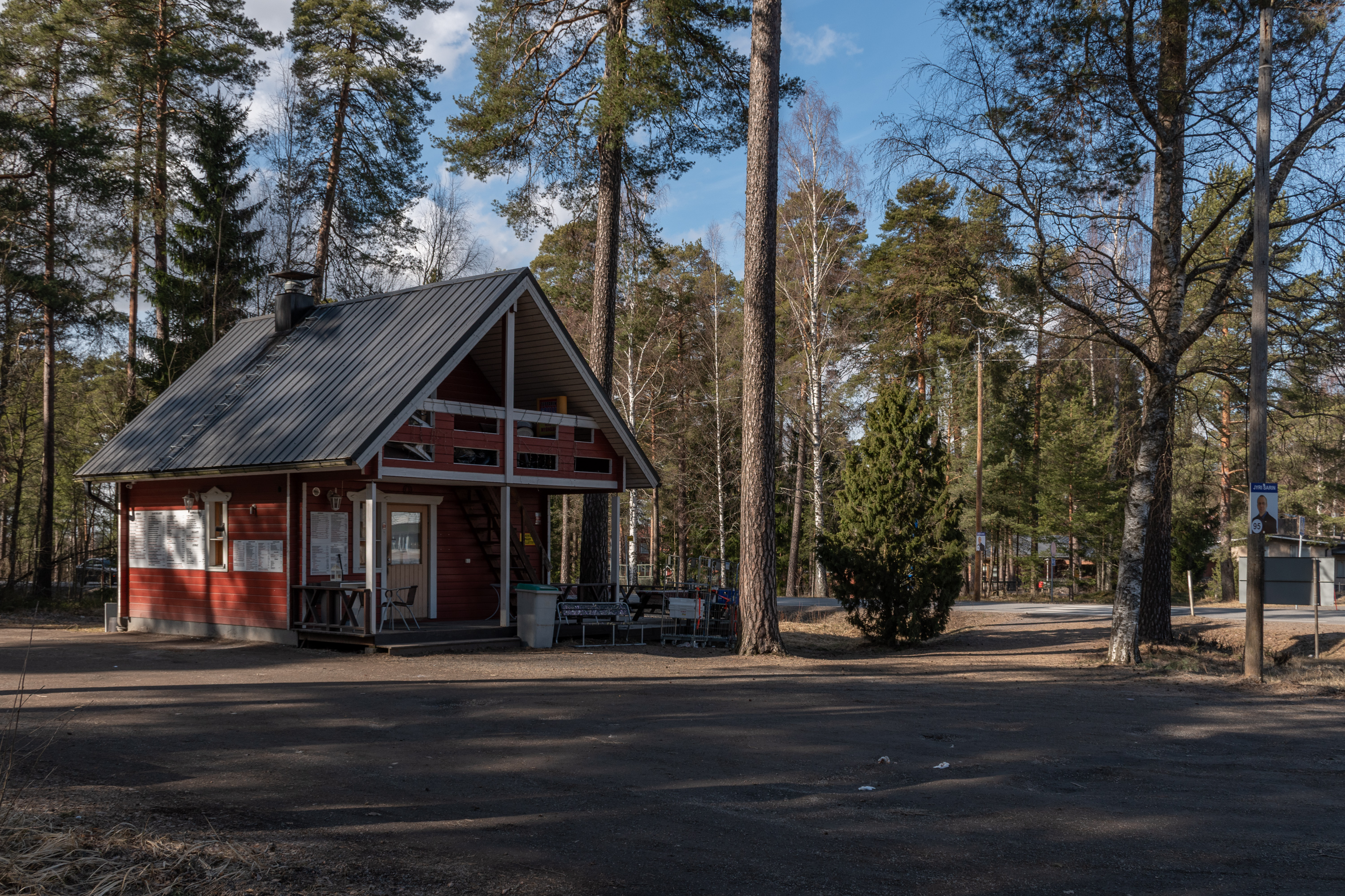 По другую сторону от этой улицы идет заброшенная железная дорога, а за ней — другой завод, машиностроительный, Kone-Tuomi. Раньше еще был производитель упаковки Amcor Flexibles, на OpenStreetMap до сих пор отмечен, но он закрылся в 2019 (минус 127 работников). На заборе промзоны неожиданно обнаружились также таблички "военная территория", так что снимать ее или железную дорогу я не стал, да там ничего и не было интересного. Интересно, почему военная? Этот Kone-Tuomi что-то для военных строит, или, может, было еще раньше что-то, а таблички просто не сняли? Нагуглить не удалось.