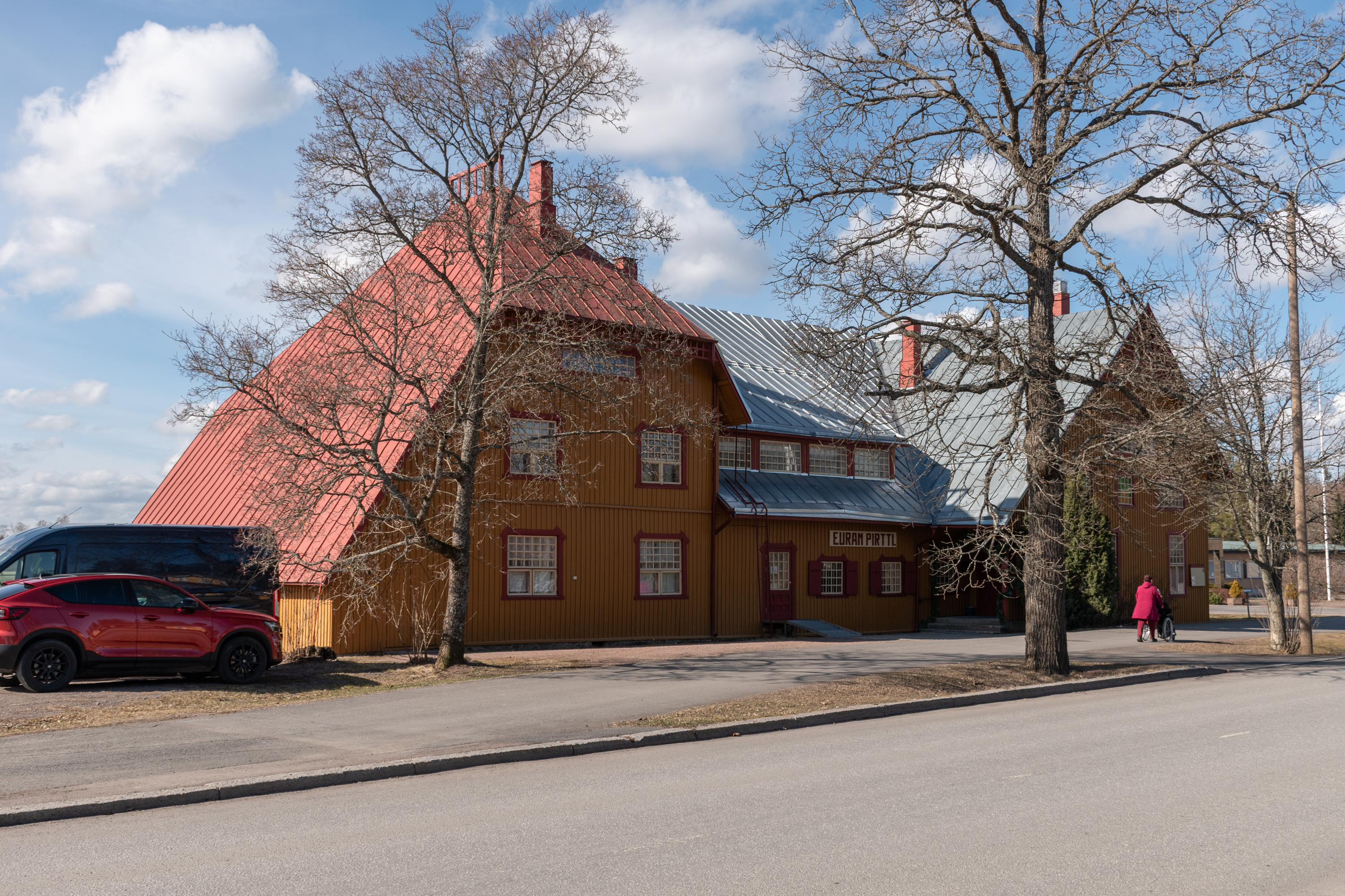 4. Напротив церкви стоит большой интересный дом, "изба Эура" (Euran pirtti). Он построен в 1908 год как молодежный клуб; его архитектором был Ялмари Кархула (Jalmari Karhula, 1878-1912), уроженец Эуры, более известный как художник. Для молодежного клуба дом явно великоват, и уже в 1960-х его стало не на что содержать; в 1970-х продали музею-скансену Сеурасаари в Хельсинки, но и перевезти в Хельсинки тоже в итоге денег не нашлось. Так что выкупили снова местные, и с тех пор это площадка для мероприятий.