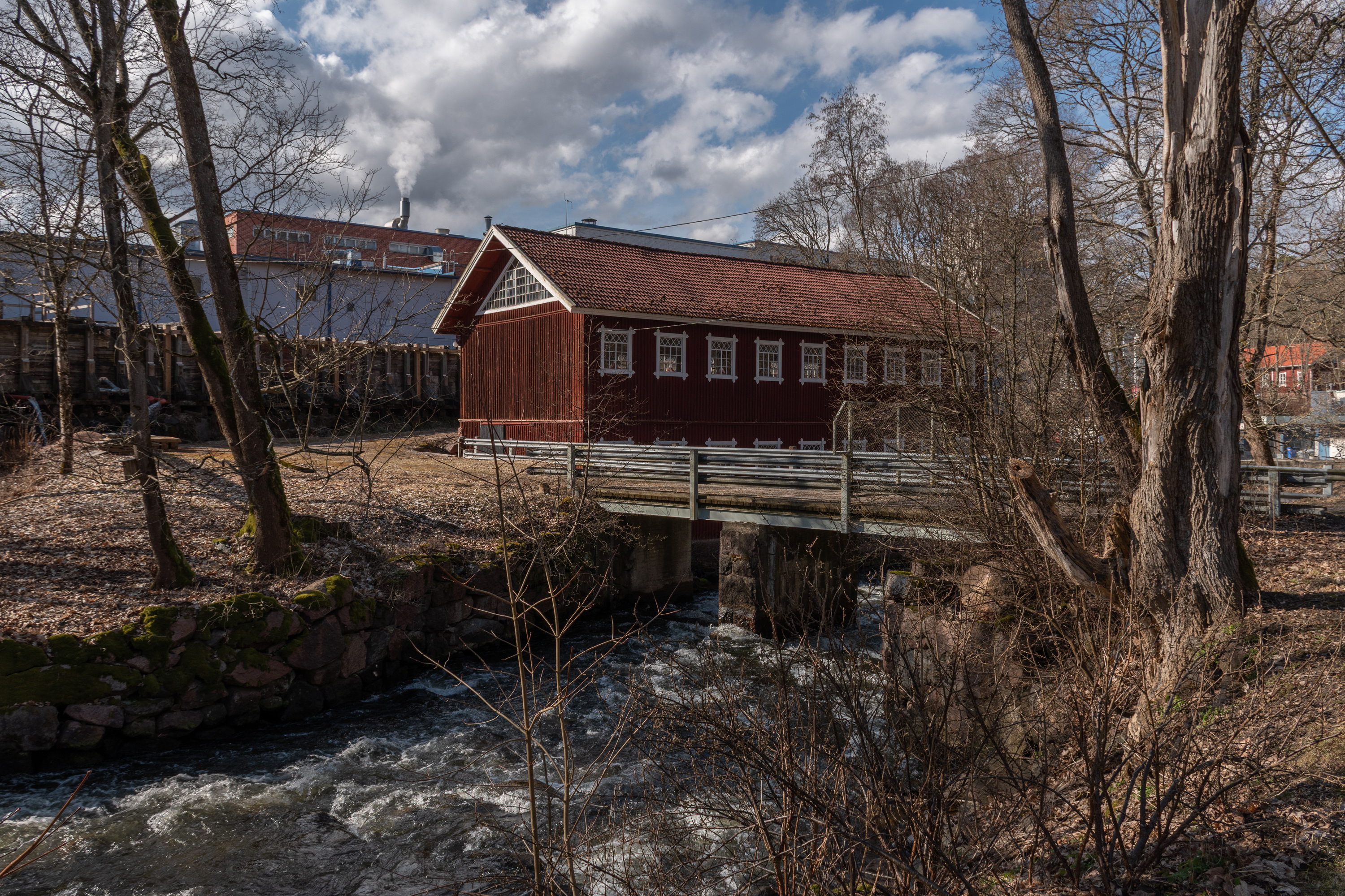 29. Зато по соседству с этими домиками так и действует по сей день бумажный комбинат Кауттуа. В настоящий момент он принадлежит аж японцам — редкость для Финляндии — и называется JTK, Jujo Thermal Kauttua. Не знаю, что за Jujo такое, тоже что-то японское, видать. Как следует из названия, сейчас здесь производят термобумагу и другие специальные сорта бумаги, а производство обычной бумаги было закрыто в 2015. Традиционные бумажные комбинаты в Финляндии уже большинство позакрывались, но картонные, целлюлозные и подобные специализированные пока более или менее действуют; этот комбинат — единственный производитель термобумаги в Северных Странах, трудоустраивает около 200 человек. В газетах в свое время говорили, что японцы, мол, на будущее умеют смотреть, не стремятся к сиюминутной прибыли, но кто его знает, как в дальнейшем будет.