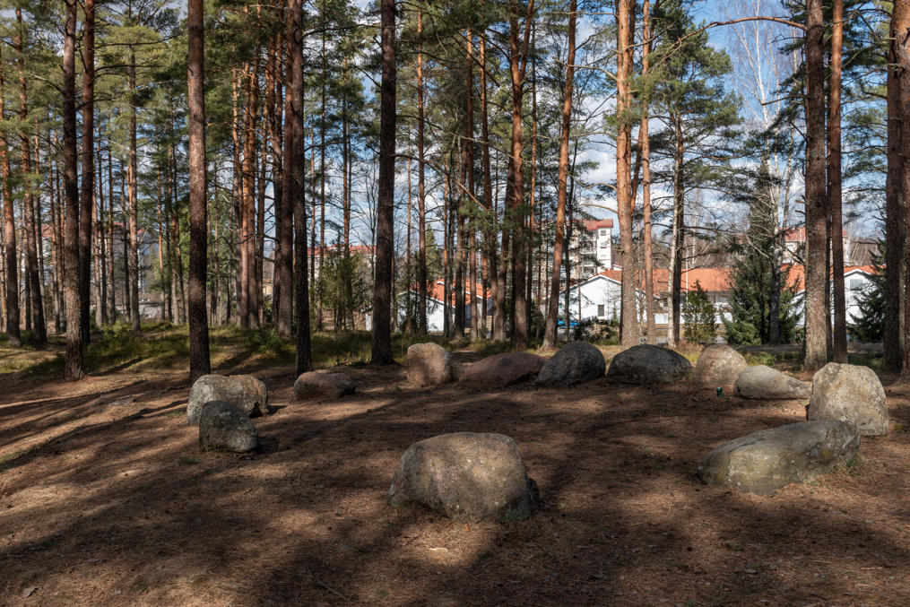 18. Но вернемся к нашим фото. Почему же этот холмик зовется Вечевым? Помимо могил, на нем можно найти "вечевые камни" (käräjäkivet) — круг из валунов, где, предположительно, в старину местные финны проводили совет/вече. Такие круги известны и в других местах; неизвестно, использовались ли конкретно эти камни для конкретно этой цели. Посередине круга была найдена пара совсем старых захоронений, и эти таки посредством кремации, в отличие от остального кладбища.