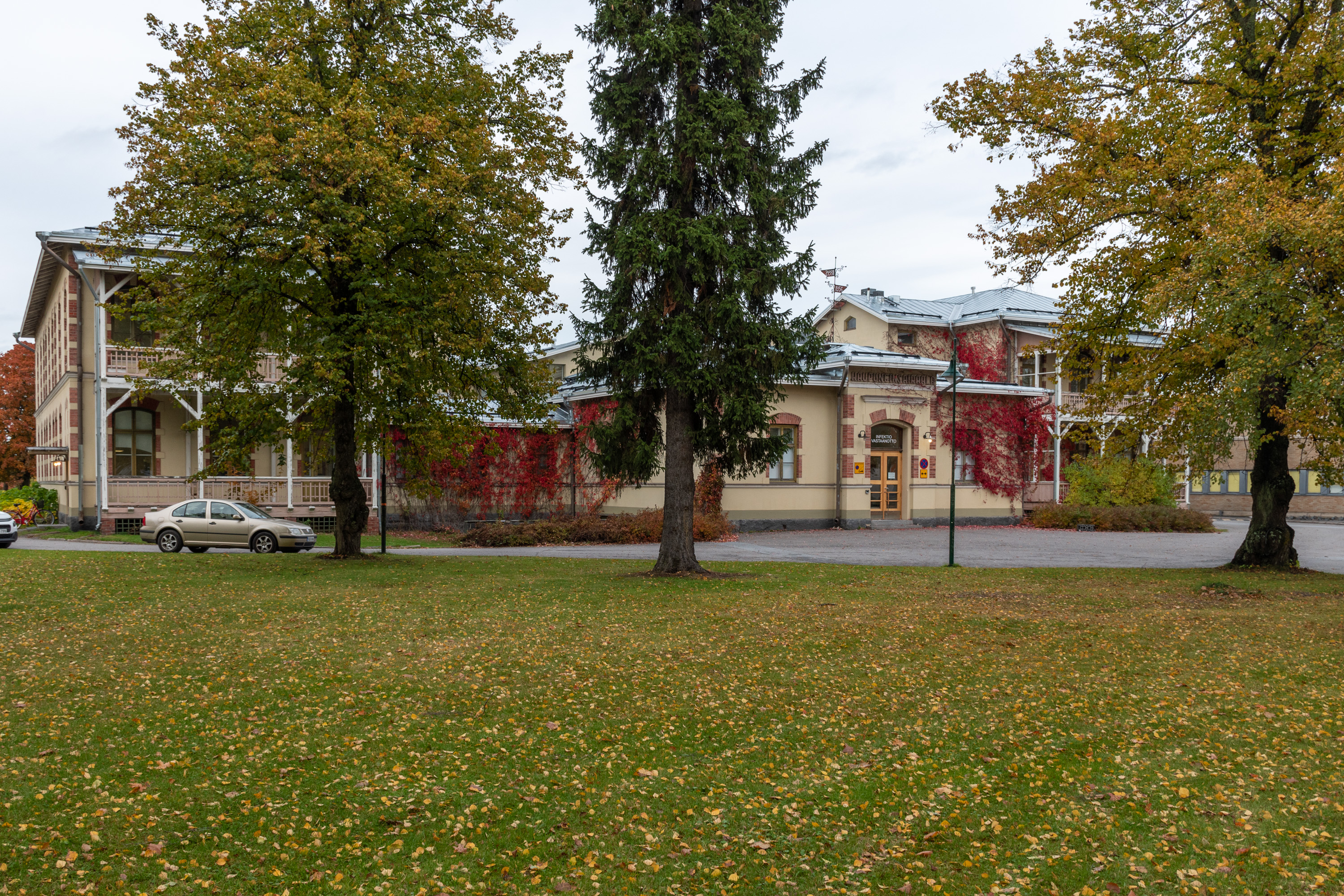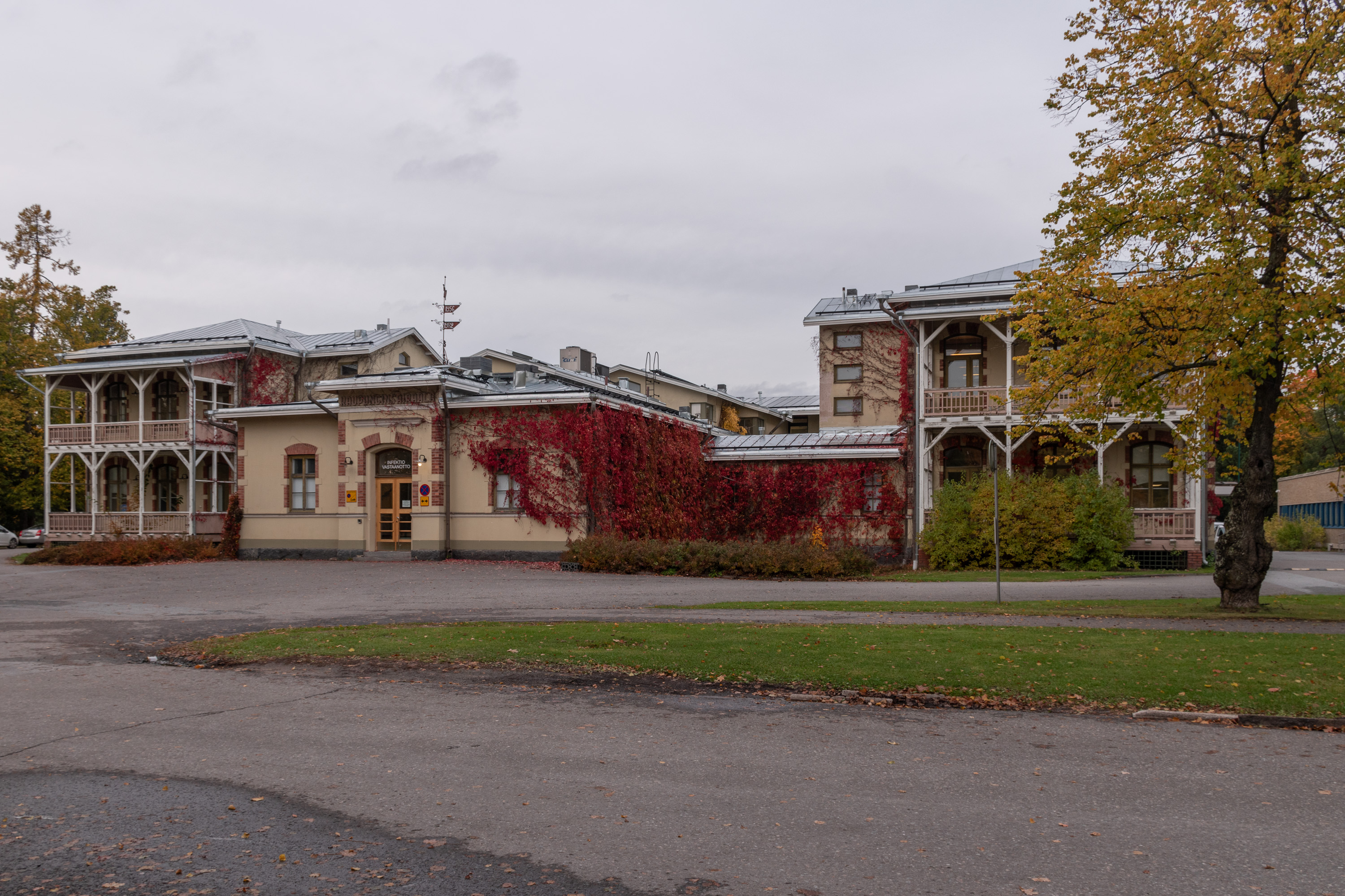 56. Ну а напротив через Шоссейную улицу находится довольно выдающиеся здания старой Поринской городской больницы (Porin kaupunginsairaala). Город владел больницей с 1875 года, и в 1895 на этом месте для нее было построено новое здание, весьма красивое, по чертежам архитектора Стенберга, того же, который проектировал театр.