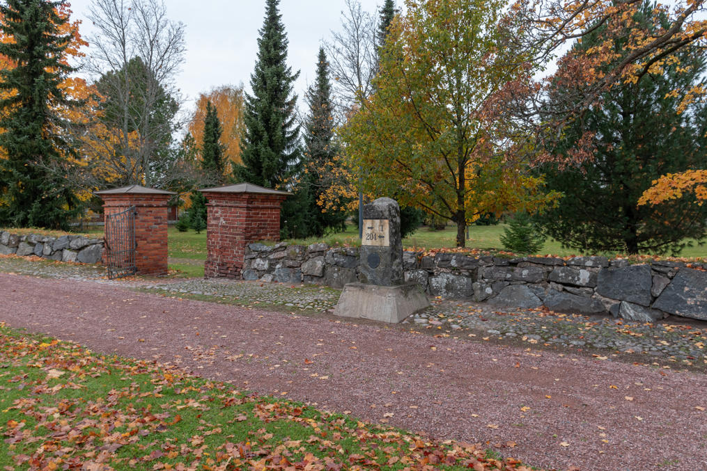 46. В частности в начале улицы, у старого кладбища, стоит установленный в 1997 памятник тому Туркусскому тракту в виде старого каменного километрового столба. Судя по столбу, расстояние когда-то составляло 205 км, а сейчас по современной Трассе 8 между Пори и Турку всего около 140 км — старые дороги, конечно, петляли по неровным скалистым пейзажам Финляндии очень сильно.