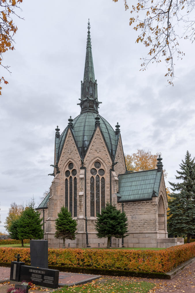 68. Но все-таки в первую очередь кладбище знаменито мавзолеем Юзелиуса (Juseliuksen mausoleumi). Он иногда считается единственным мавзолеем как таковым во всех Северных Странах, что мне кажется несколько сомнительным утверждением (как я понимаю, мавзолей отличается от склепа, коих в Финляндии на старых кладбищах немало, тем, что мавзолей открыт для публики).